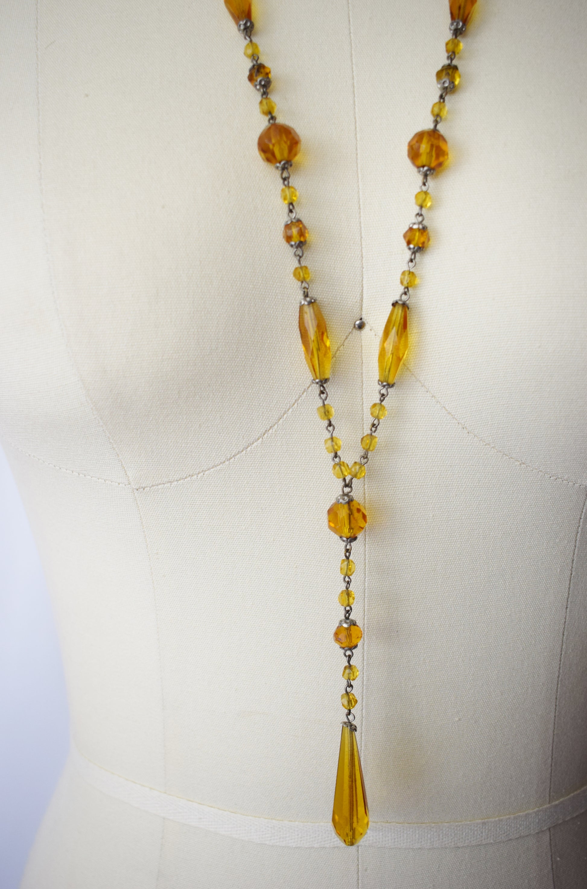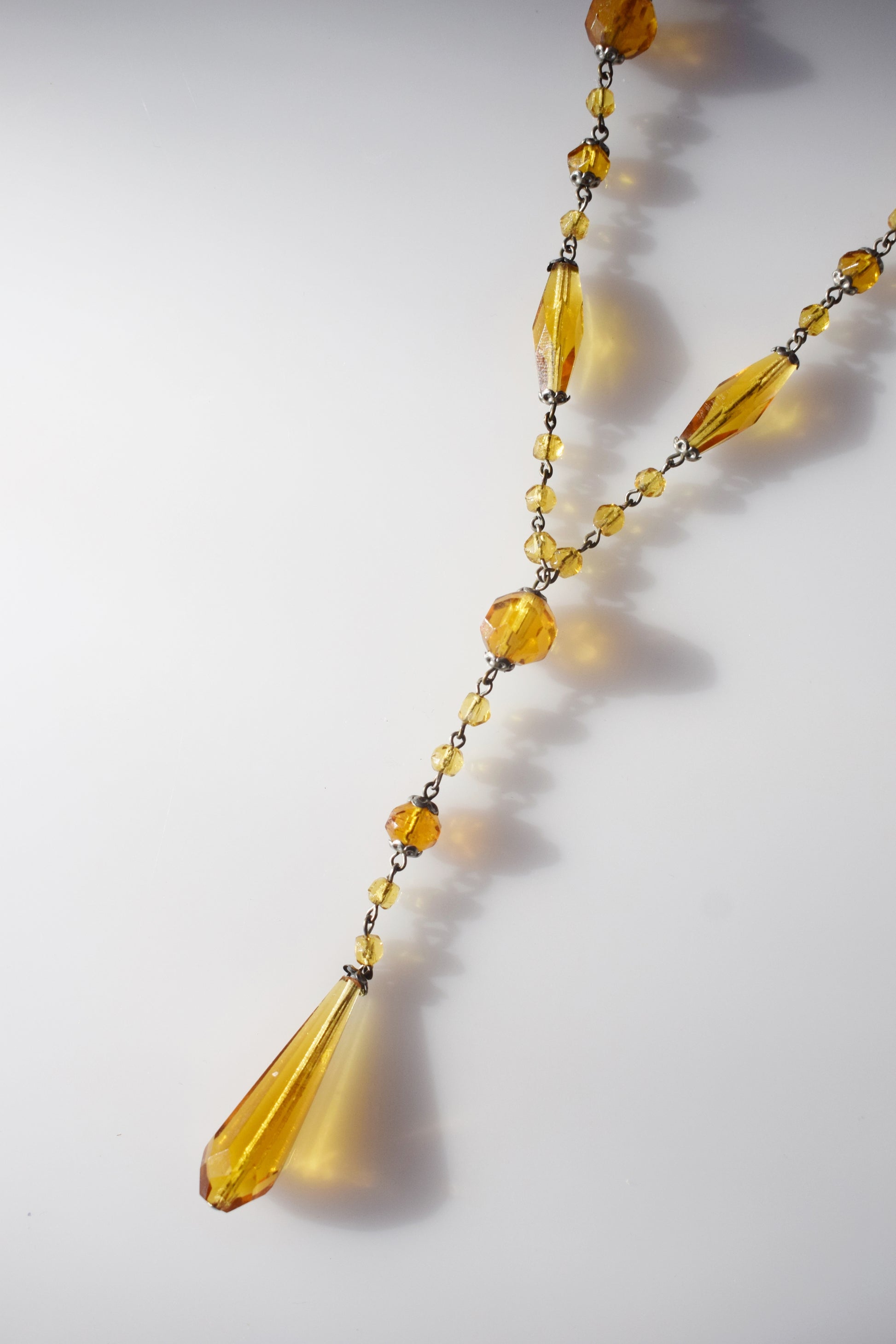 faceted citrine glass beads on a silver-tone brass chain. lariat drop. no clasp.