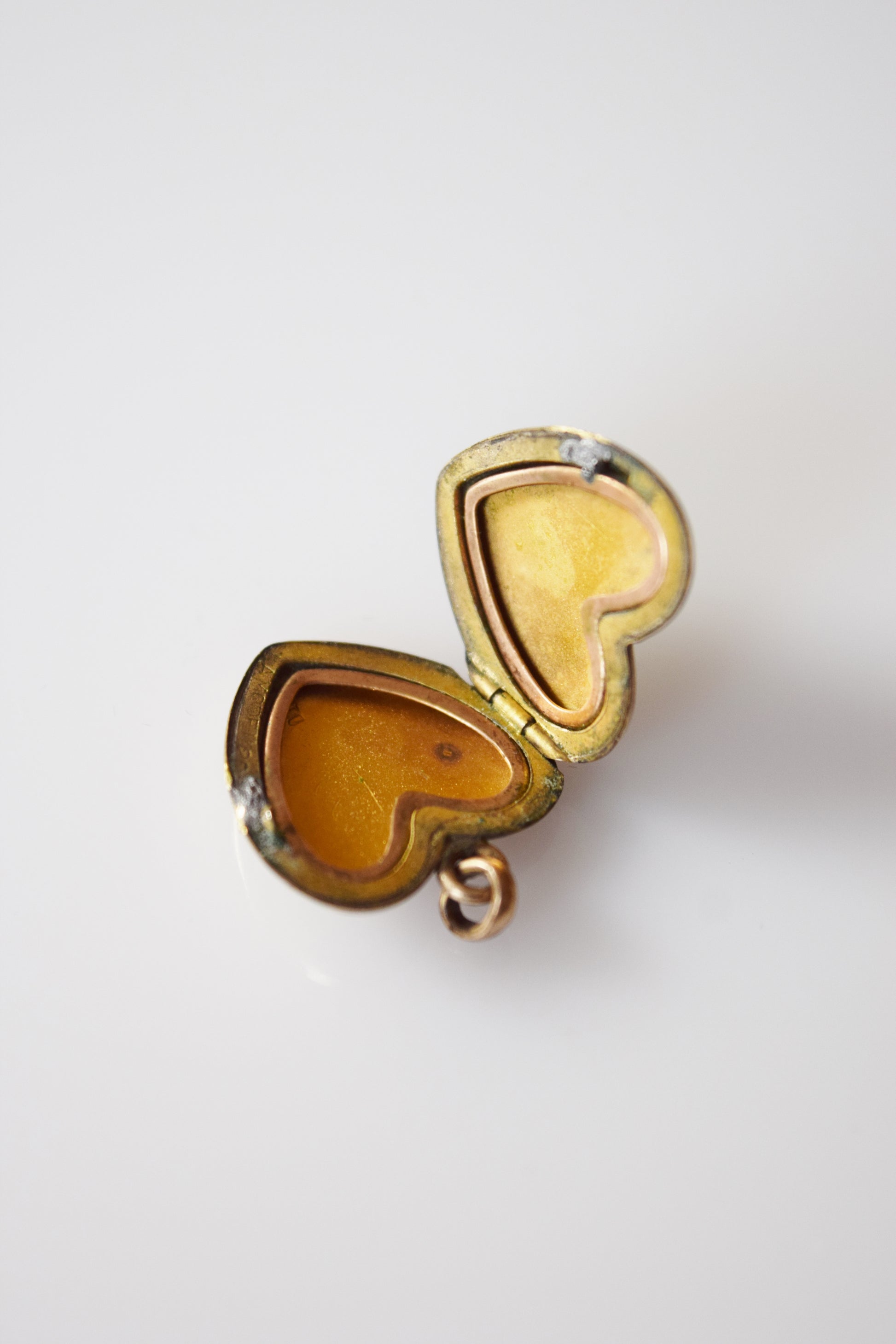 good vintage condition. some interior oxidization and patina, an old solder mark. clasp doesn't fully latch but locket stays closed and does not swing open.