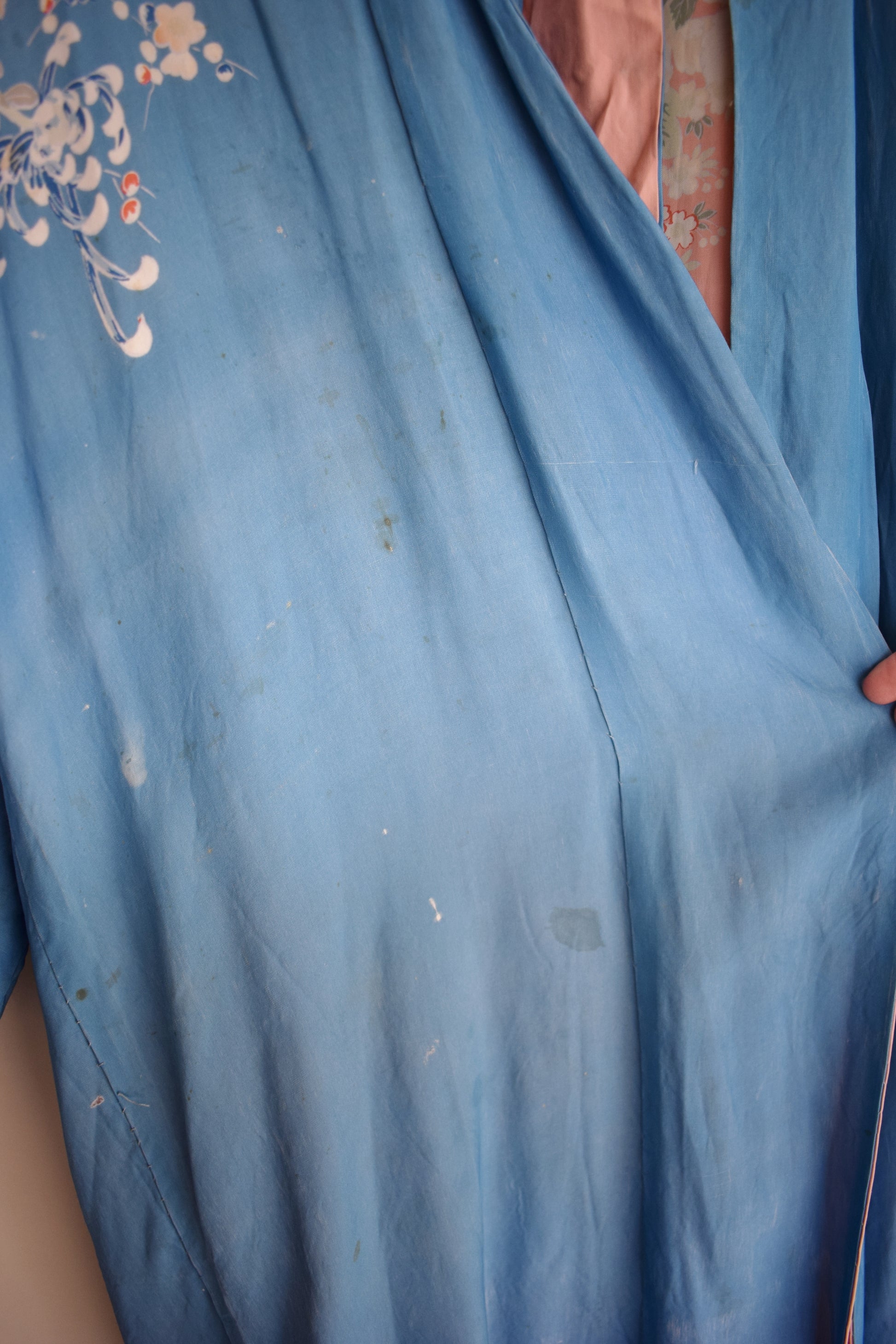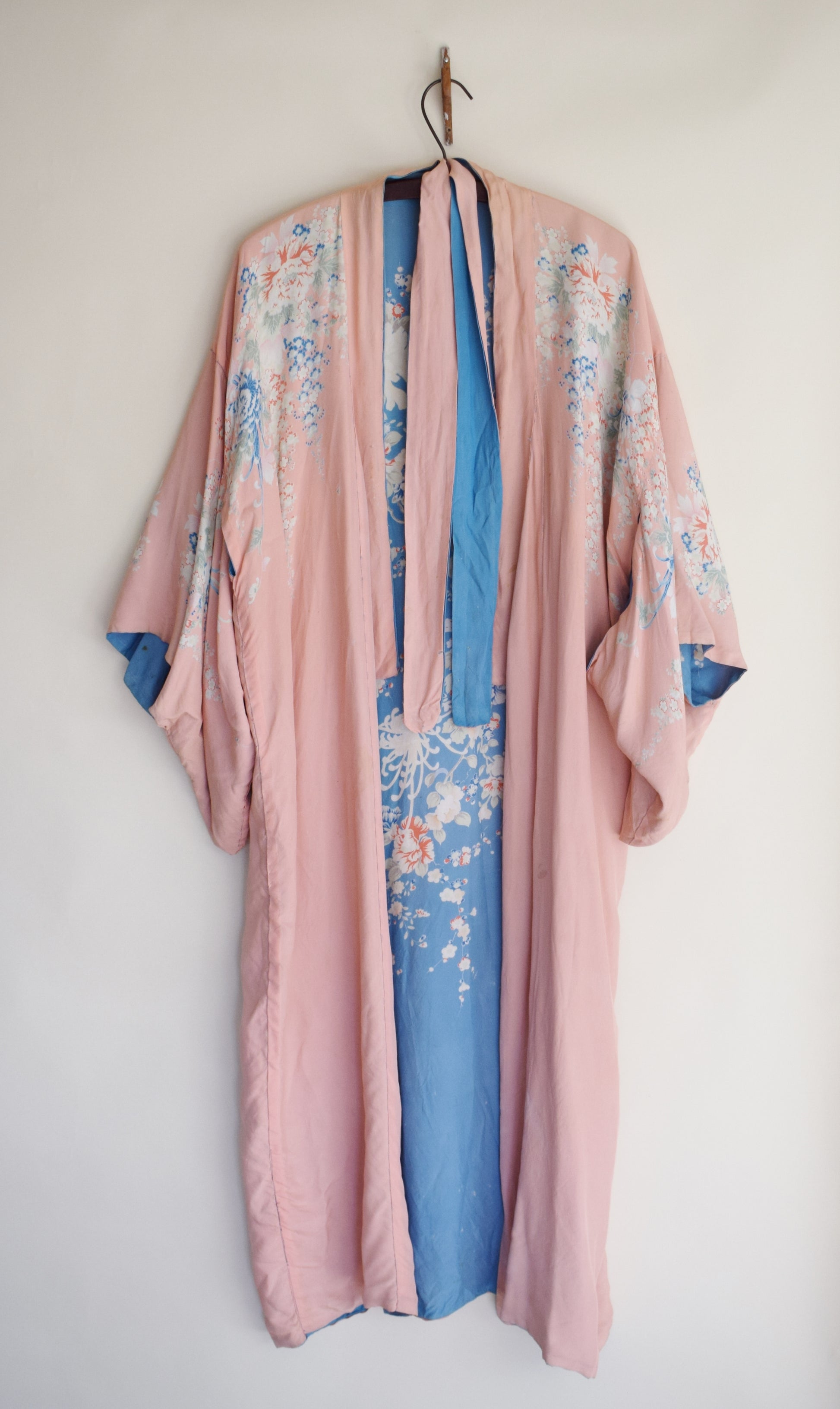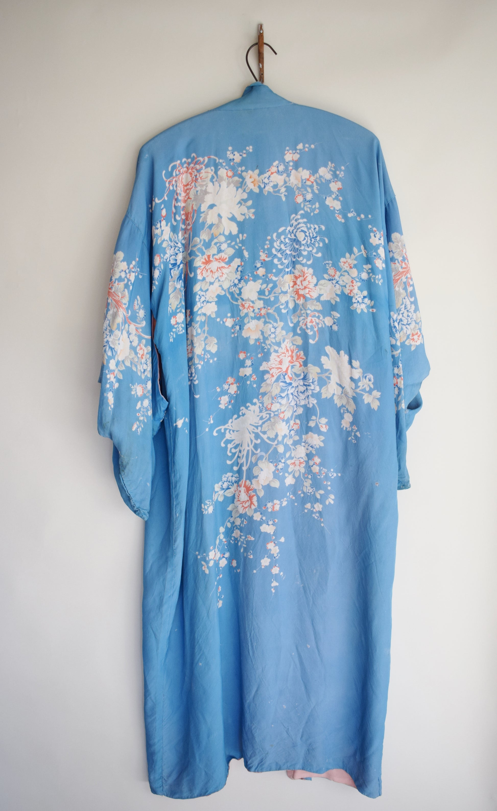 blue and pink silky soft rayon with romantic chrysanthemum prints. fully reversible with original matching belt.