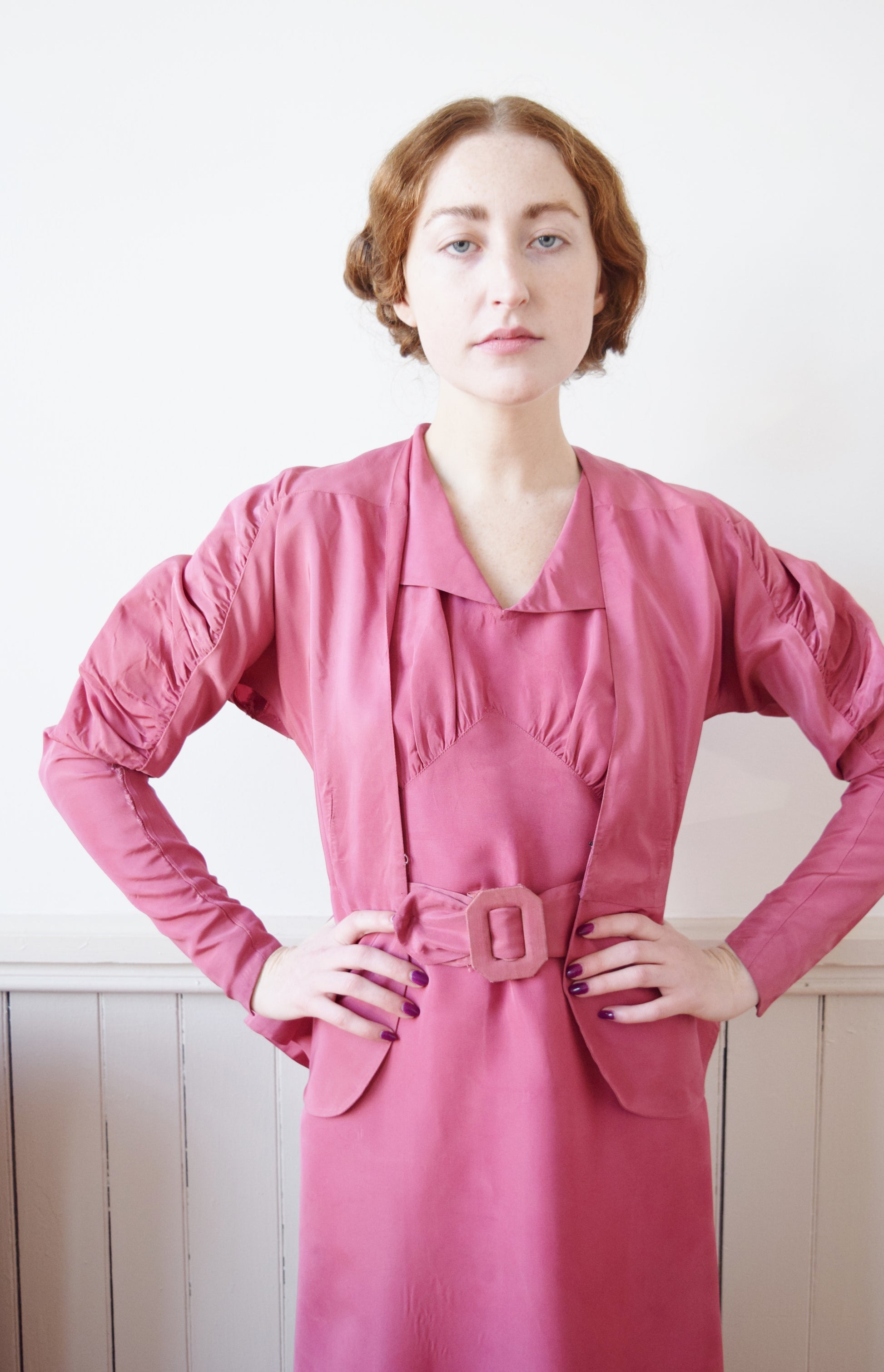 PINK set comprised of column dress with wide collar, cutout back detail, and fishtail skirt. Peplum jacket with long, heavily gathered puff sleeves. Wide belt with fabric covered buckle detail to top it off.