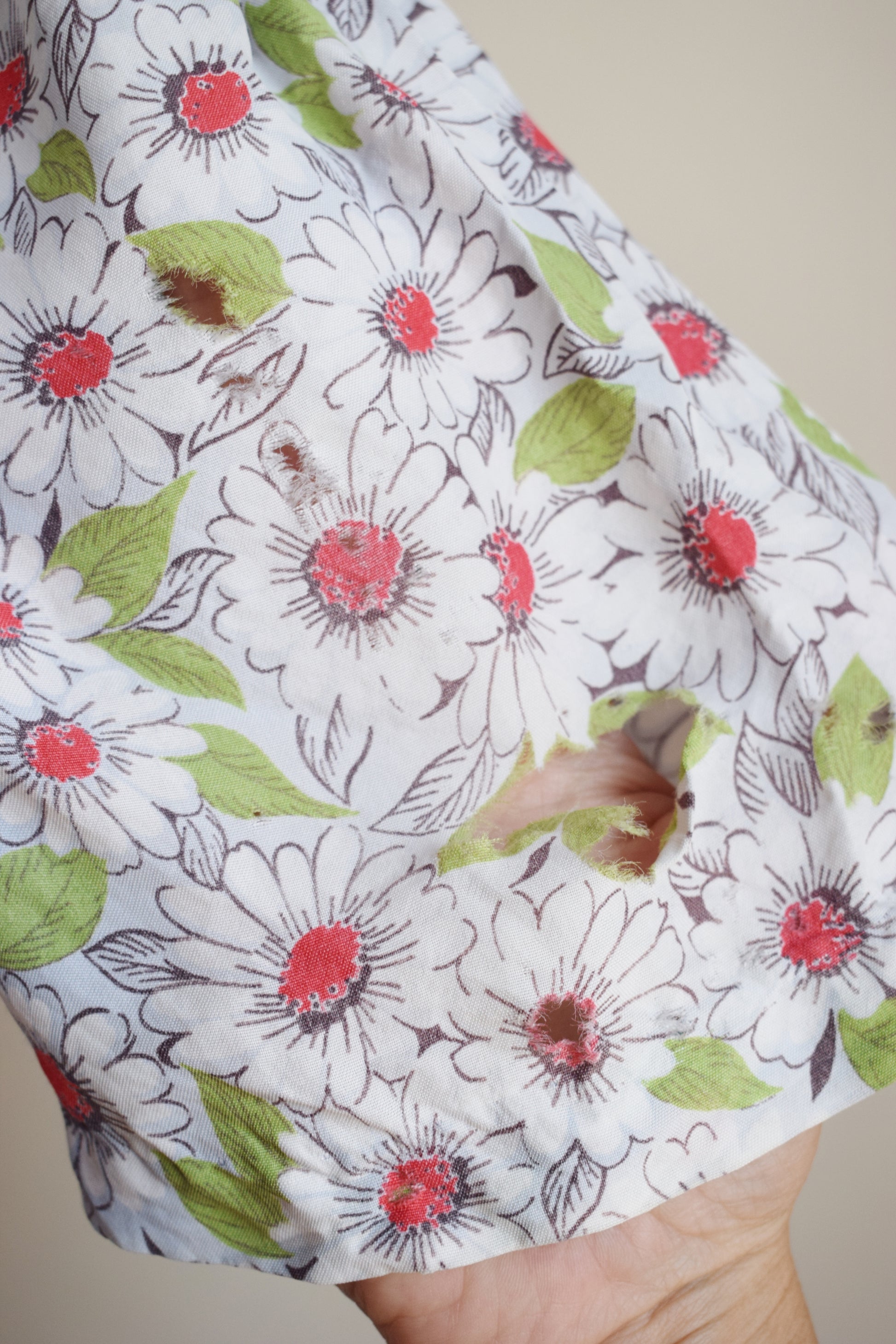 a bit of a mess (as John Hollywood would say) but the print is sooo great! and there's lots of good sturdy rayon fabric still in there. I dreamed of shortening the sleeves or skirt and using the fabric to patch up any holes. but... time to pass the dream along.
