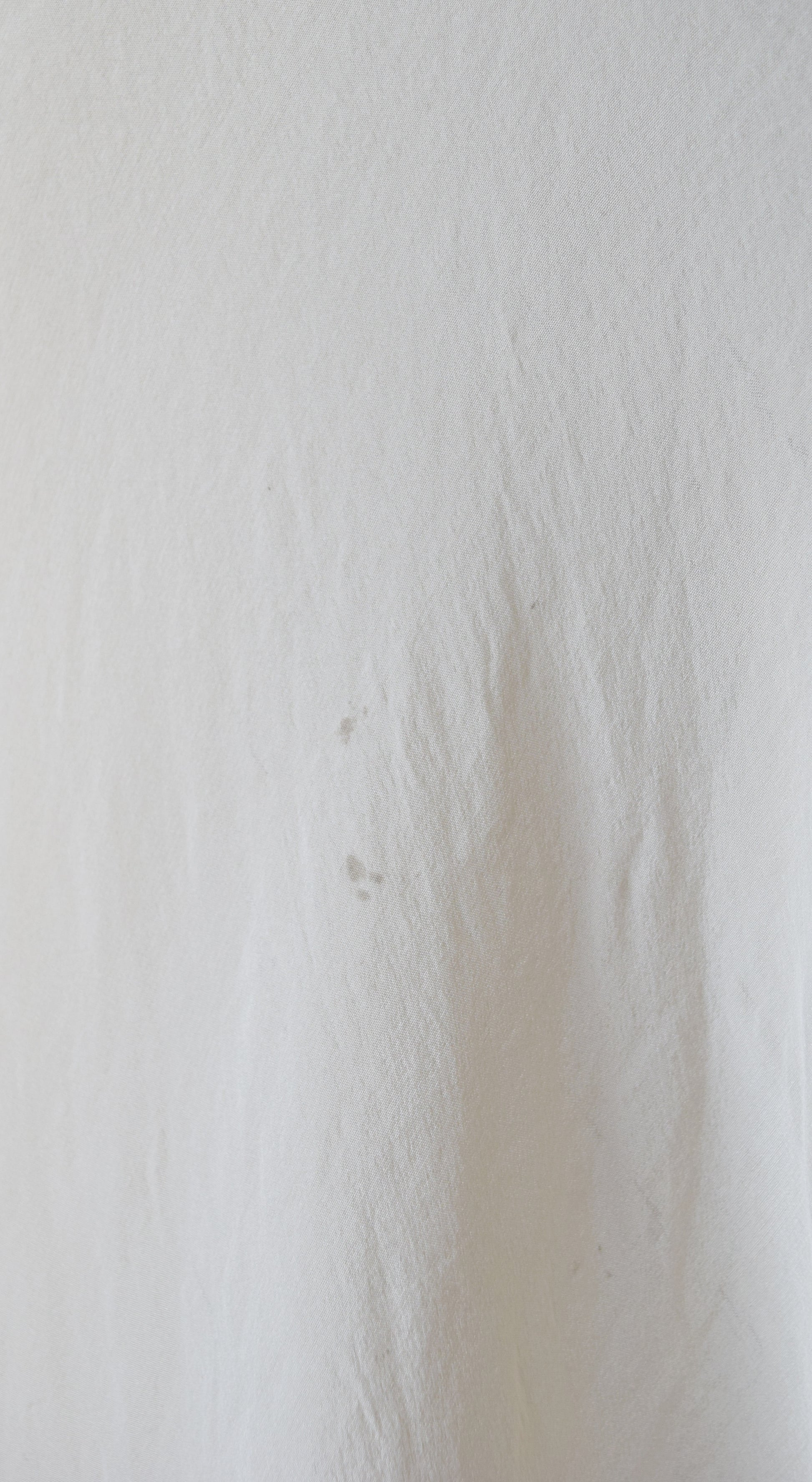 condition: fair-good vintage condition. Freshly washed, sturdy, and still presents quite nicely, however due to numerous scattered cosmetic flaws, I’m selling as-is. I noted scattered pinholes, including at the right bust and left waist/hip. The hand-finished French seaming along the sides is popping in multiple places. The seams themselves aren’t open, just the top seaming. Side seam has opened about 1” where waist ties are tacked in. there is one additional spot along side that is open. Faint and small scattered smudges. Two whitish marks on the front bodice. Back point of v-neck is mended. See images for examples. Priced at a discount and sold as-is.