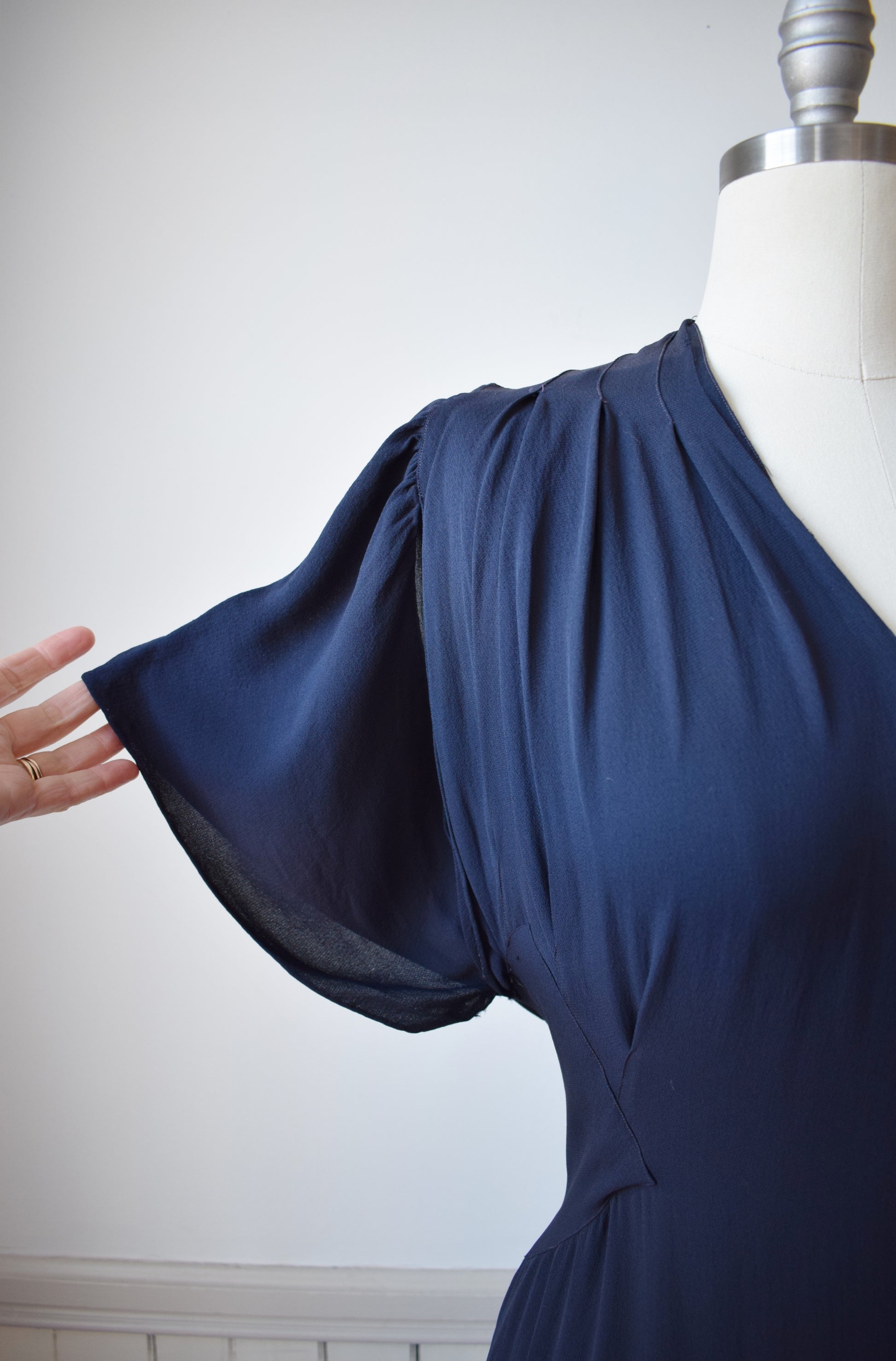 elegant deep blue matte rayon with skillfully draped and seamed bodice. flutter sleeves with keyhole detail, open back, and draped mini-train.