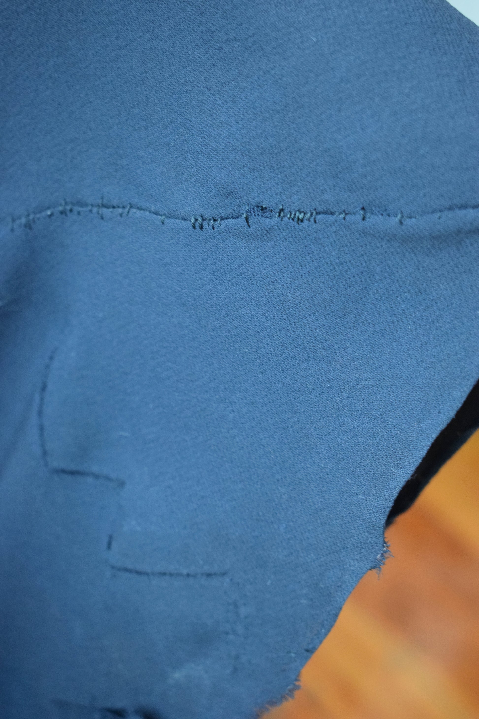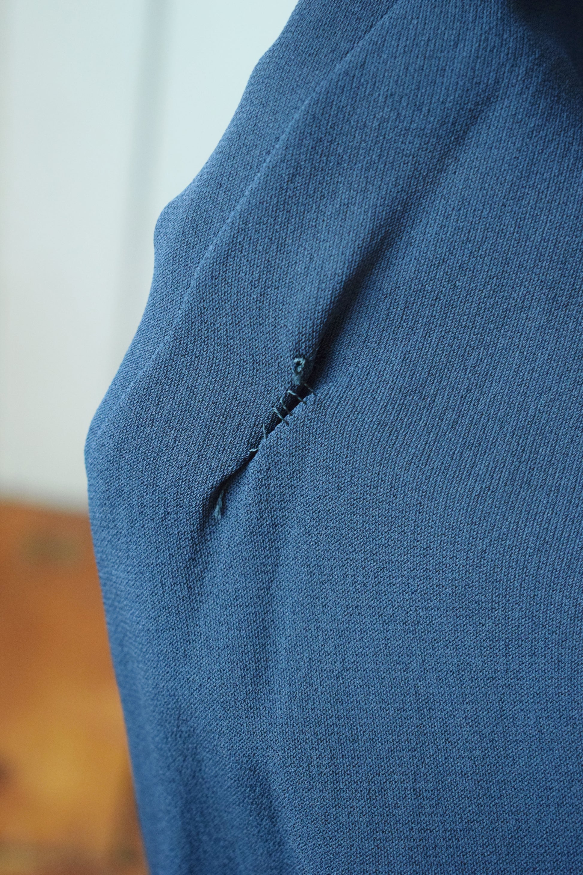 condition: fair. sturdy and wearable. clean although not recently washed. some overall use wear, fabric strain/ some seam separation at underarms, a small tear at one shoulder pleat. some fade. major flaws are in the loweer back skirt, mostly the train, where there are half a dozen small-to-large tears that have been patched or mended. see images. these are luckily in a place on the dress that makes them over-lookable. hem is worn, as some small losses.