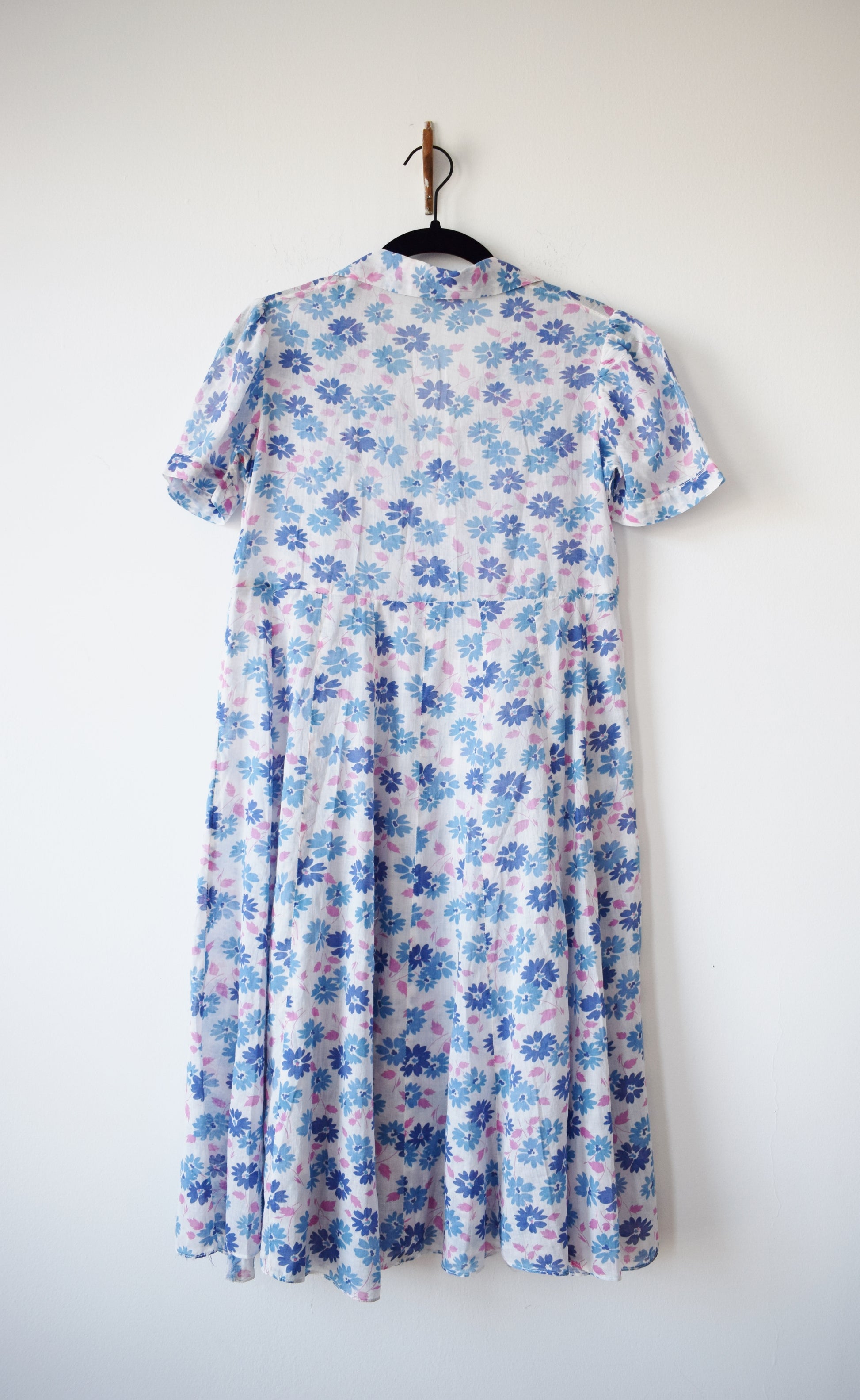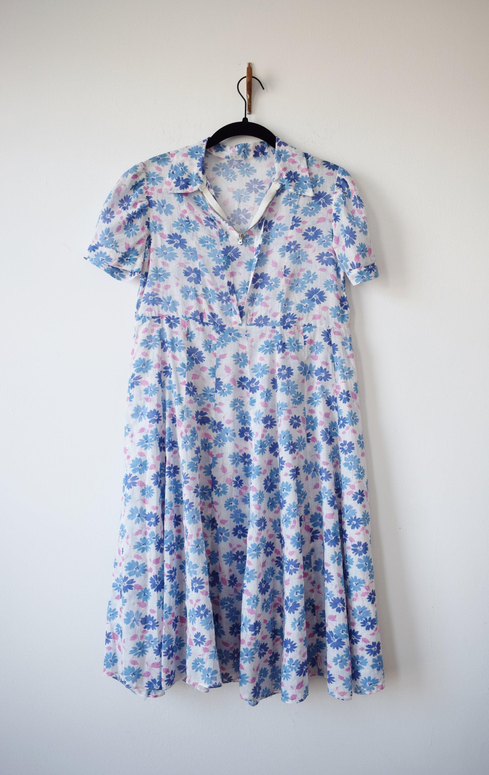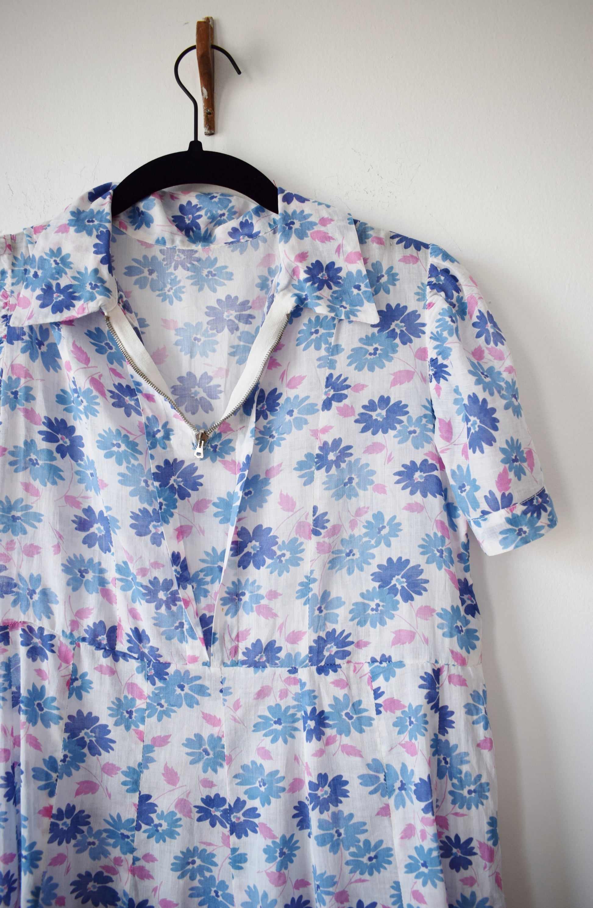 sweet semi-sheer floral cotton front with metal zipper at the neckline and 16-paneled skirt. pulls over head.