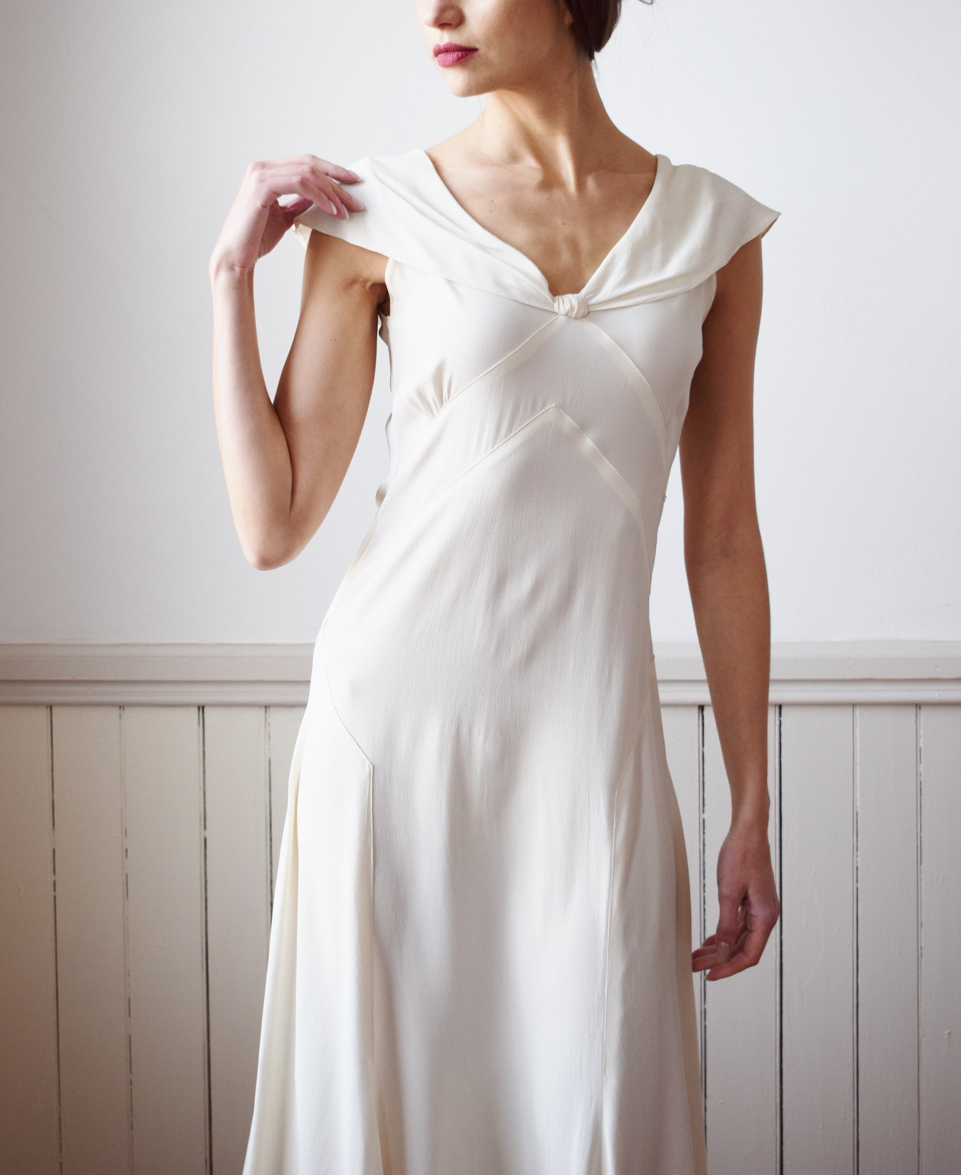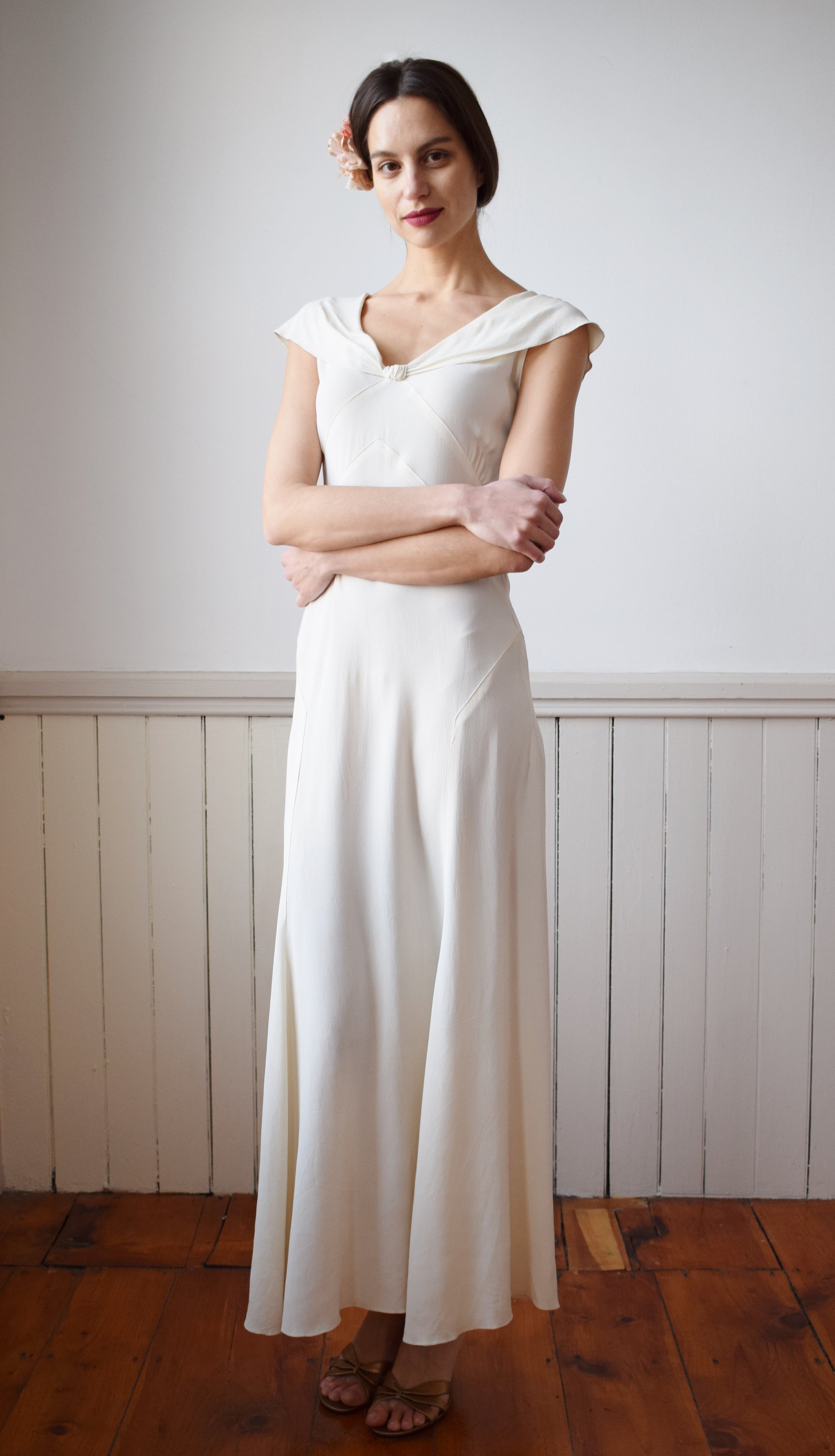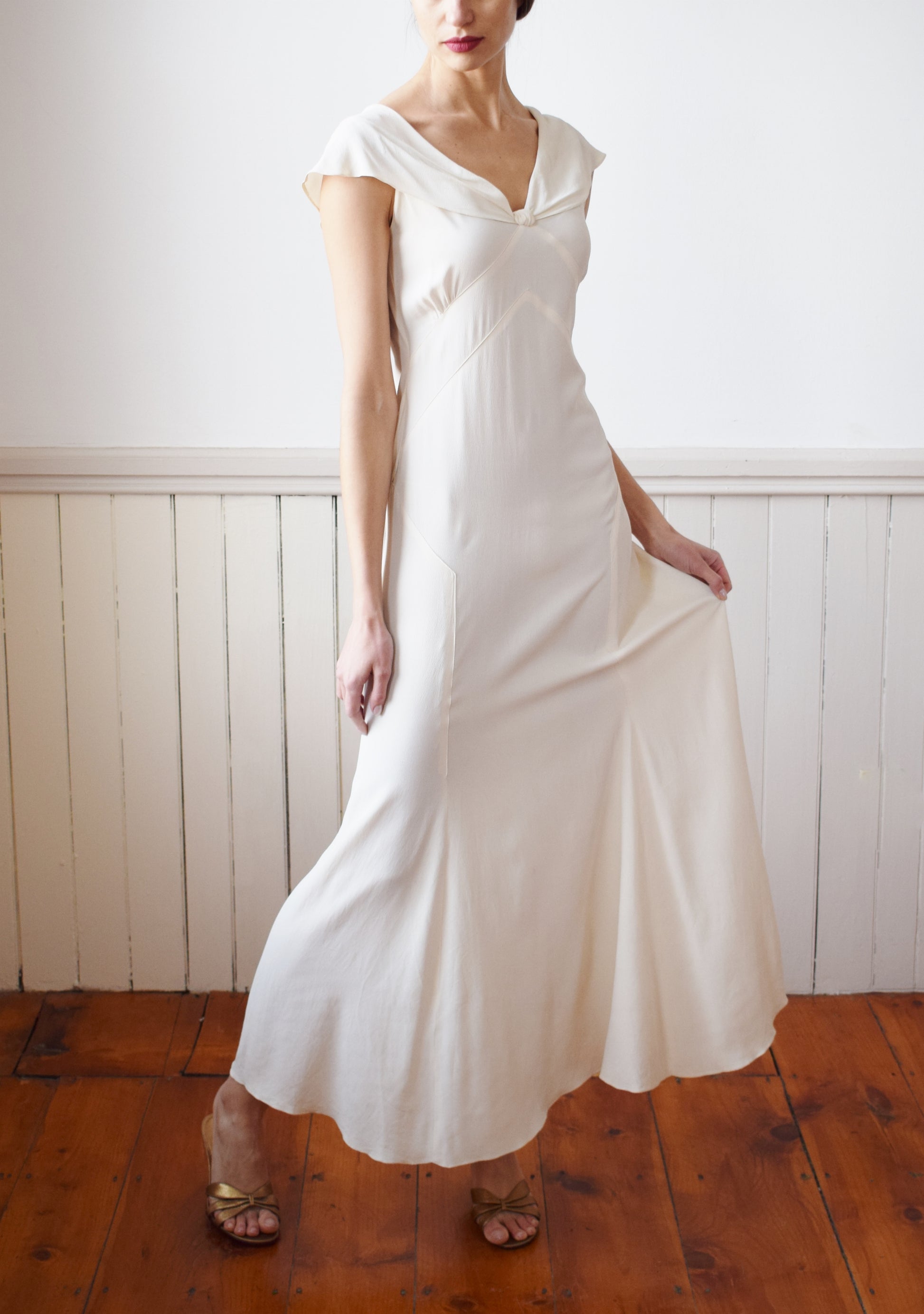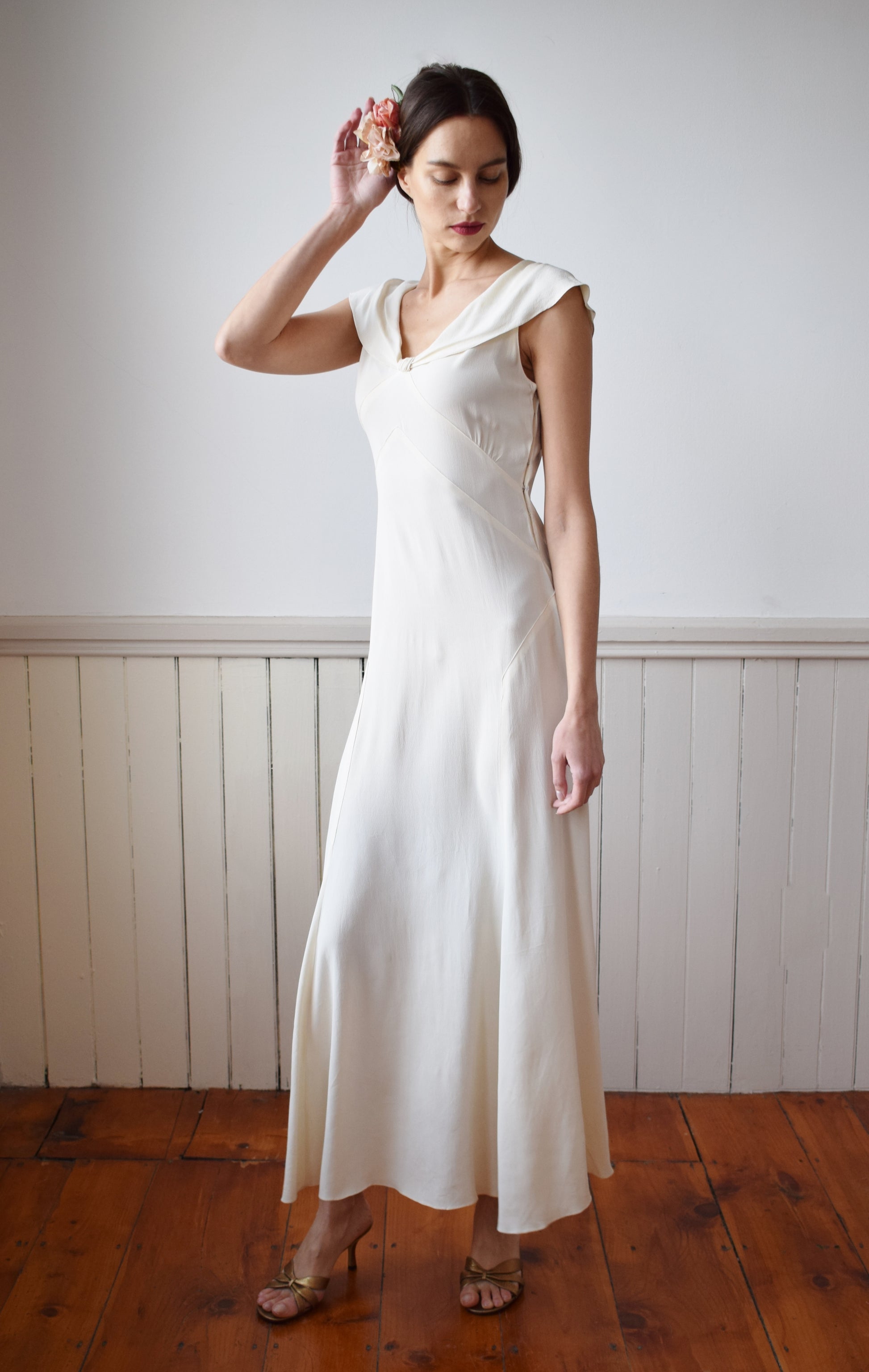 cream rayon crepe with elegant collar and classic 30s seaming details throughout. keyhole back neckline, and flared skirt panels for a pretty fullness and drape at the hem. snaps at the side waist.