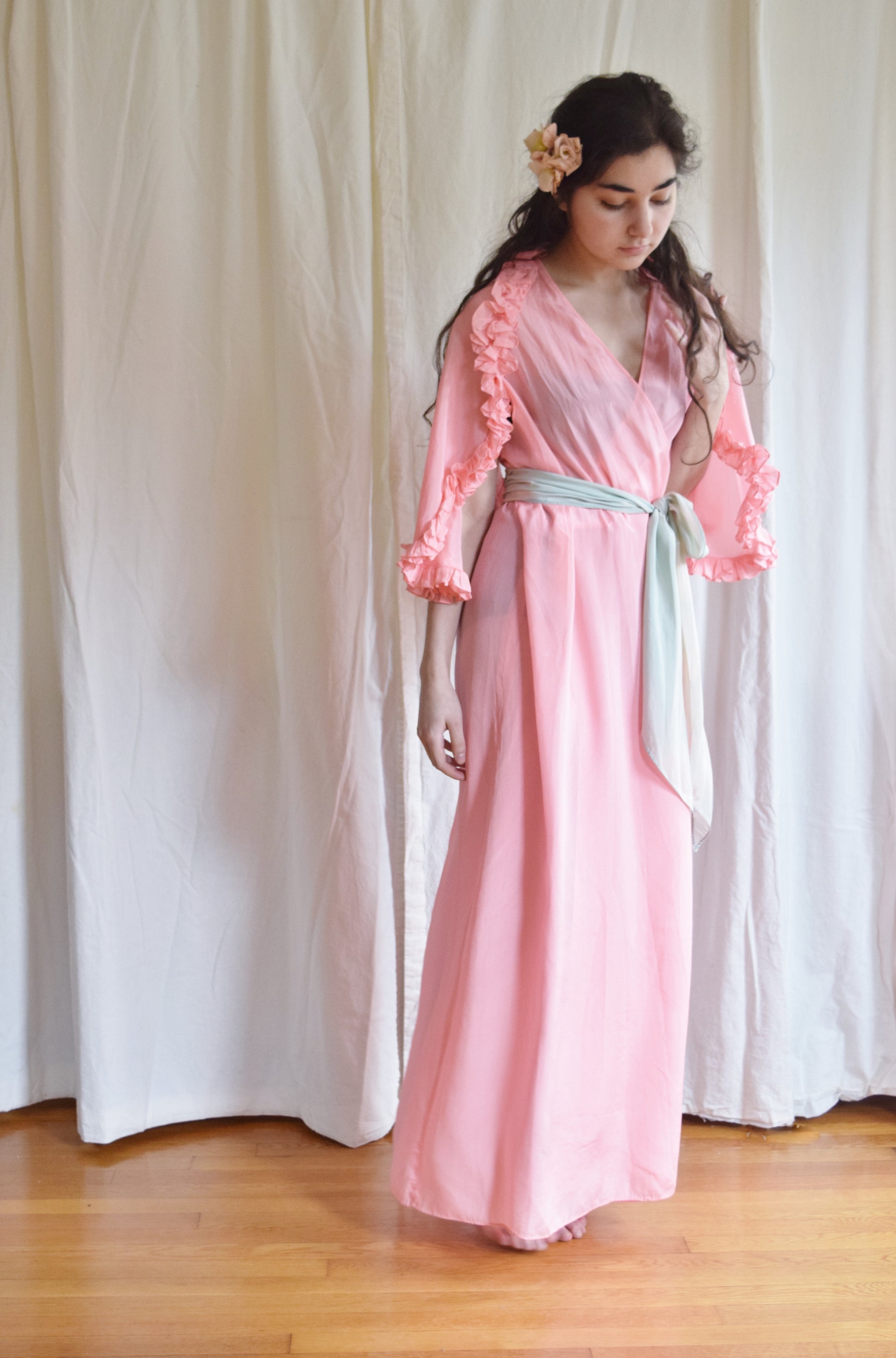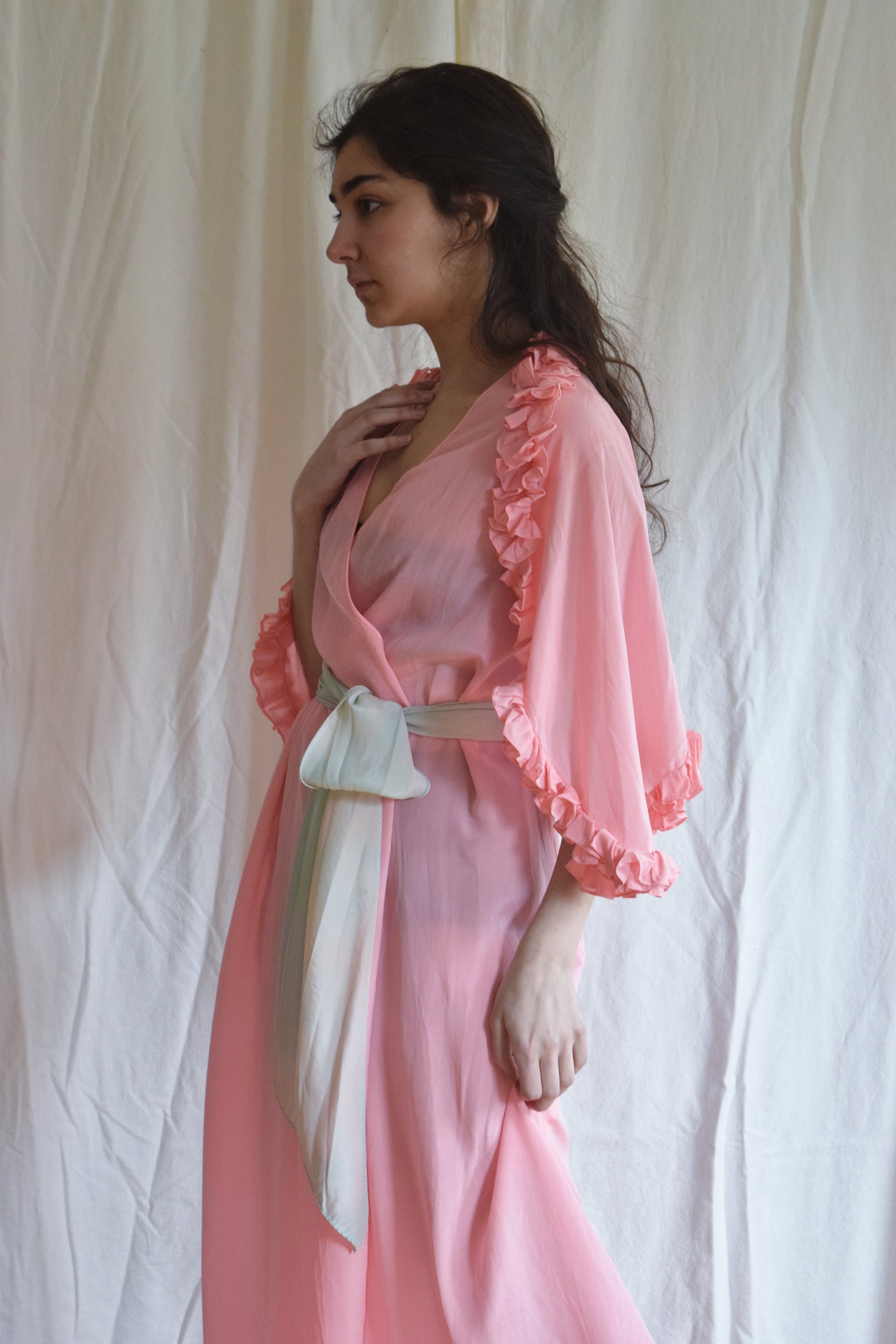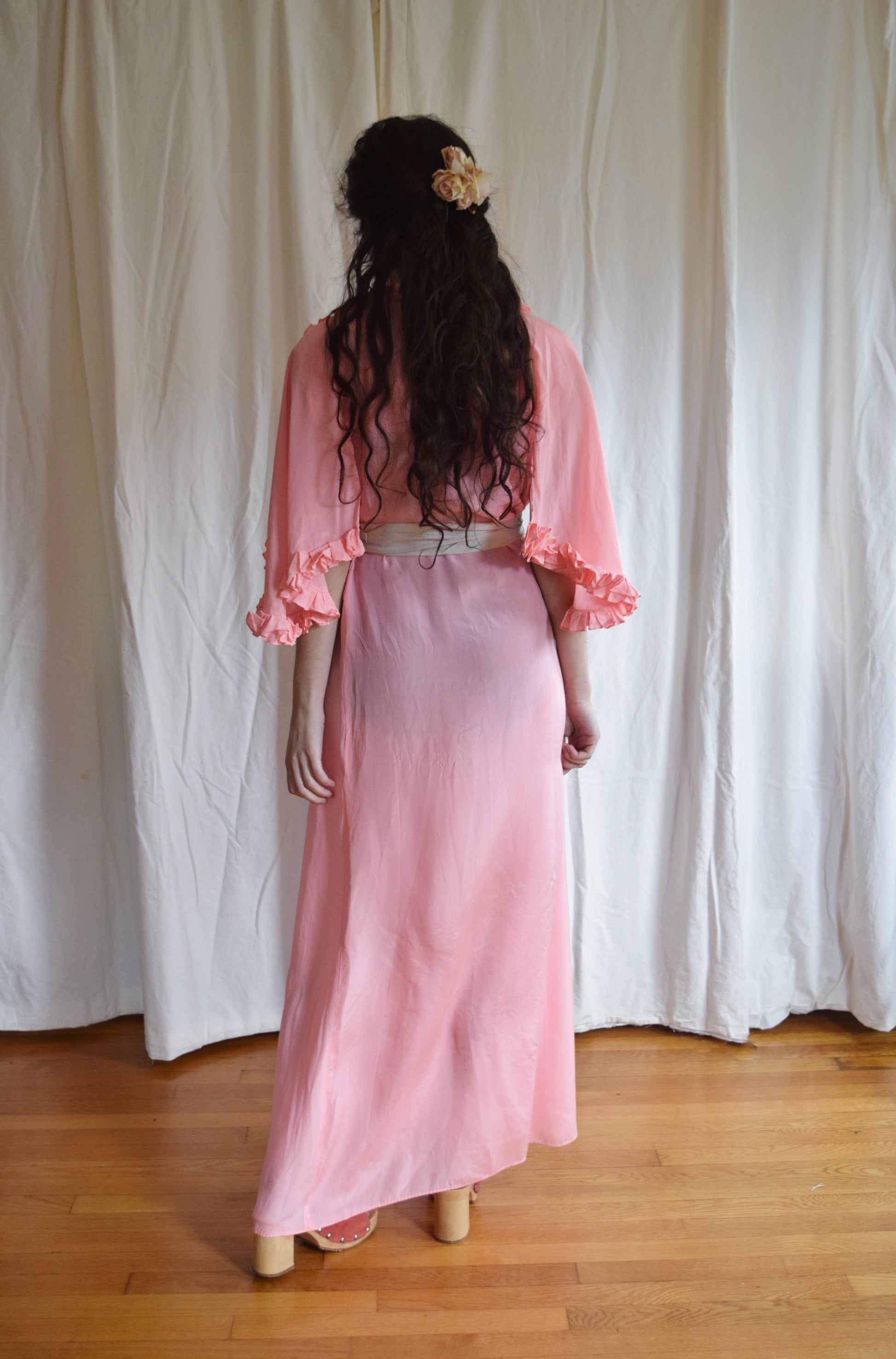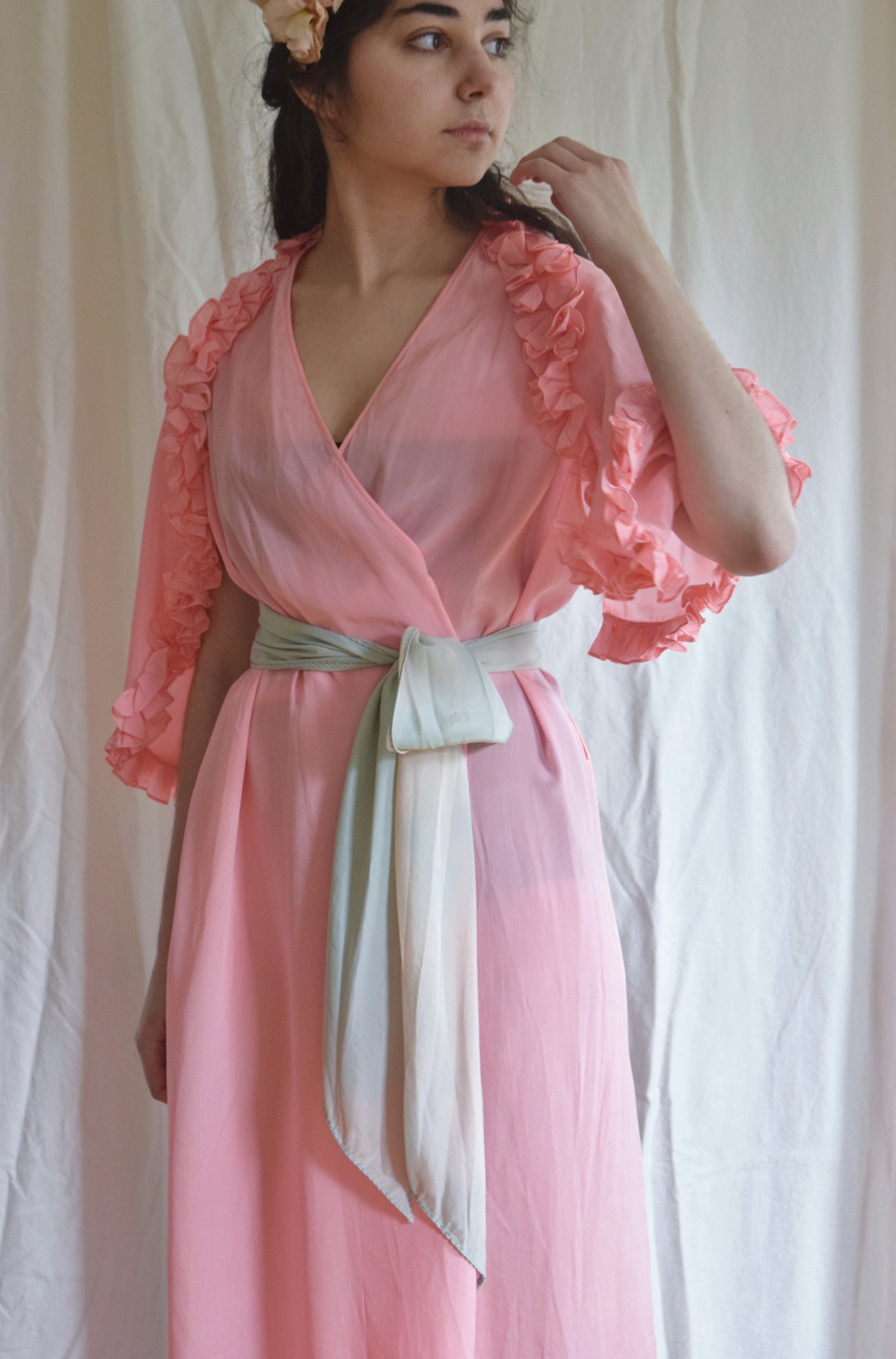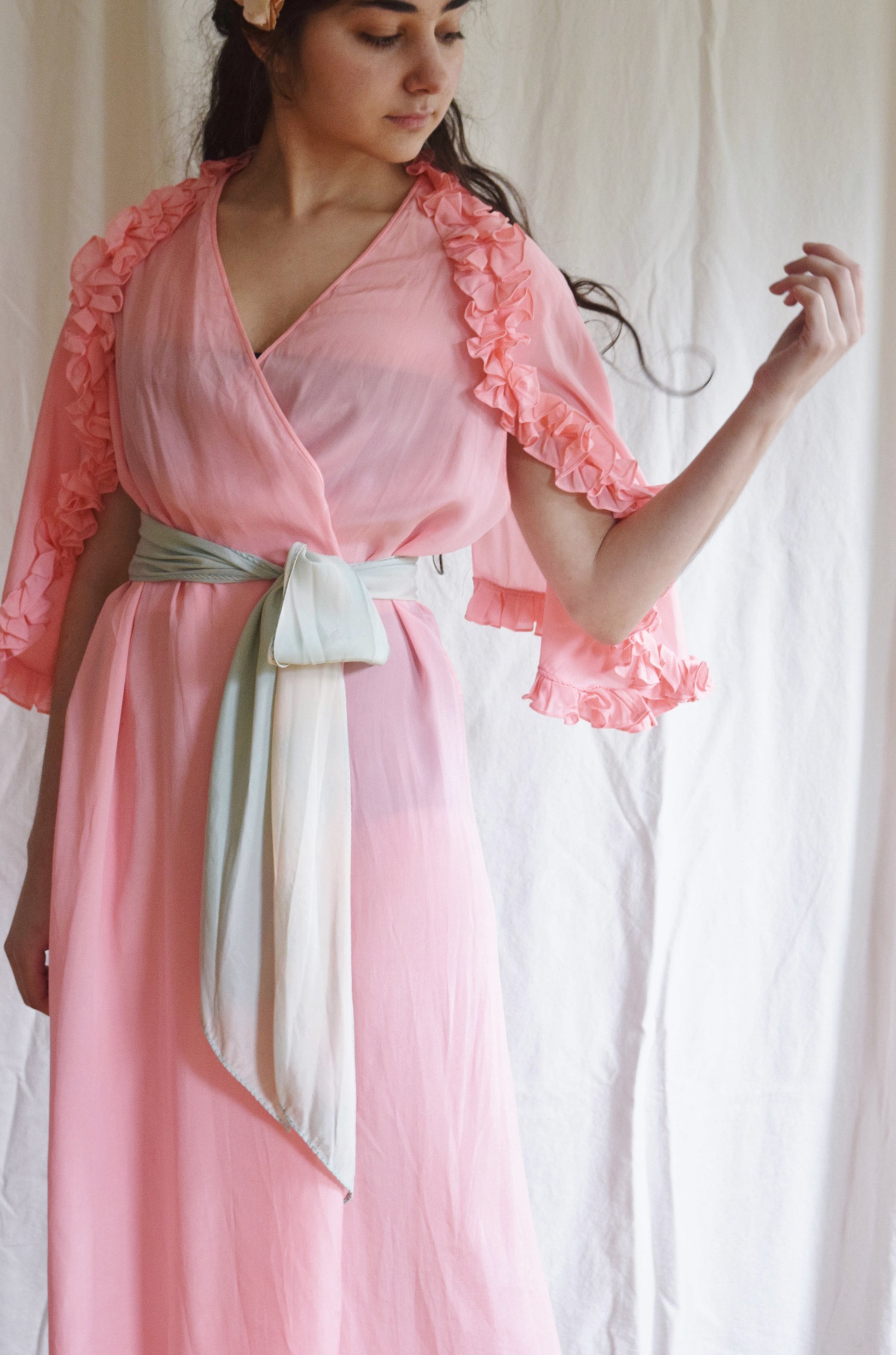 1930s Pink Ruffled Wrap Dress / Dressing Gown with Blue Sash