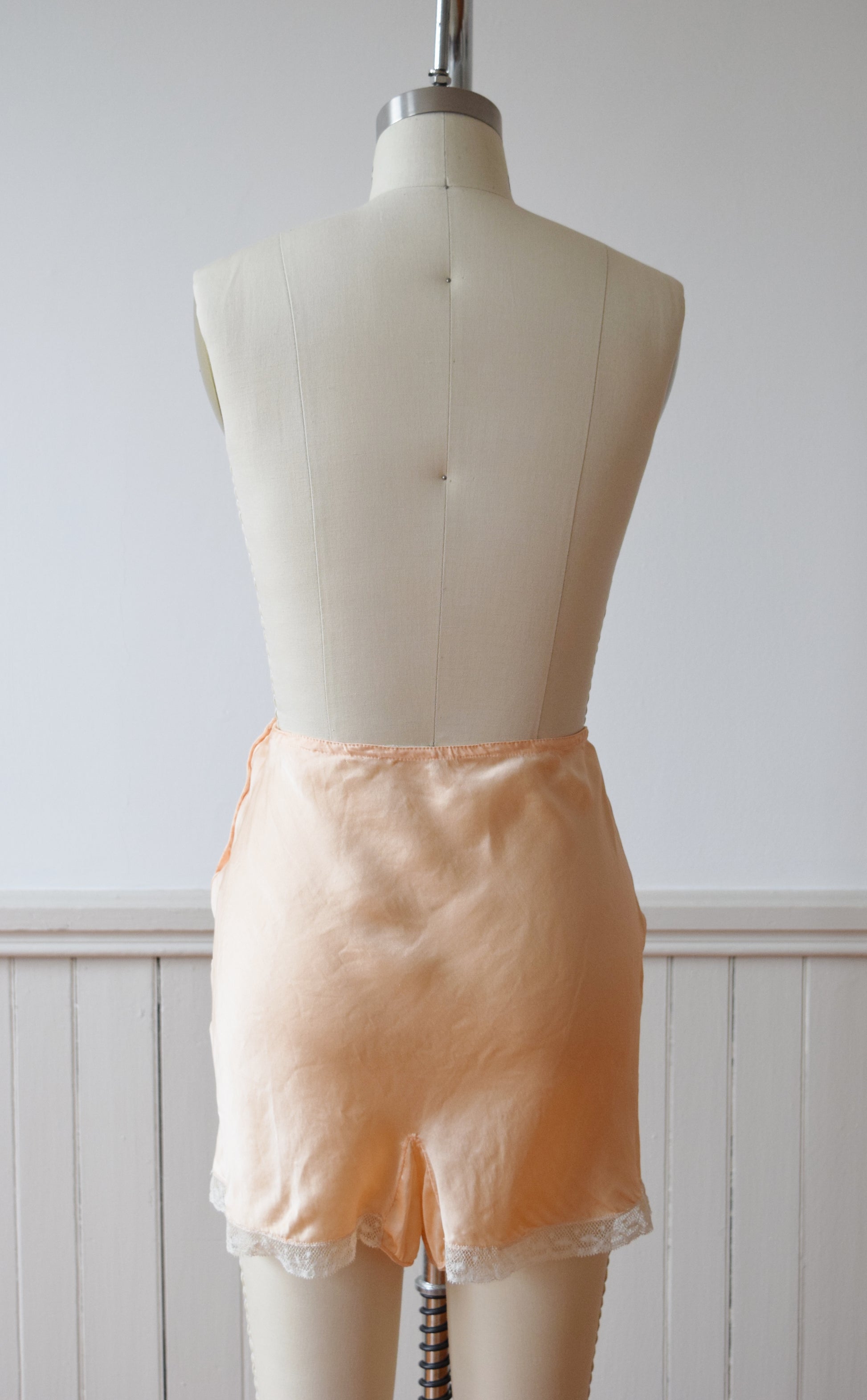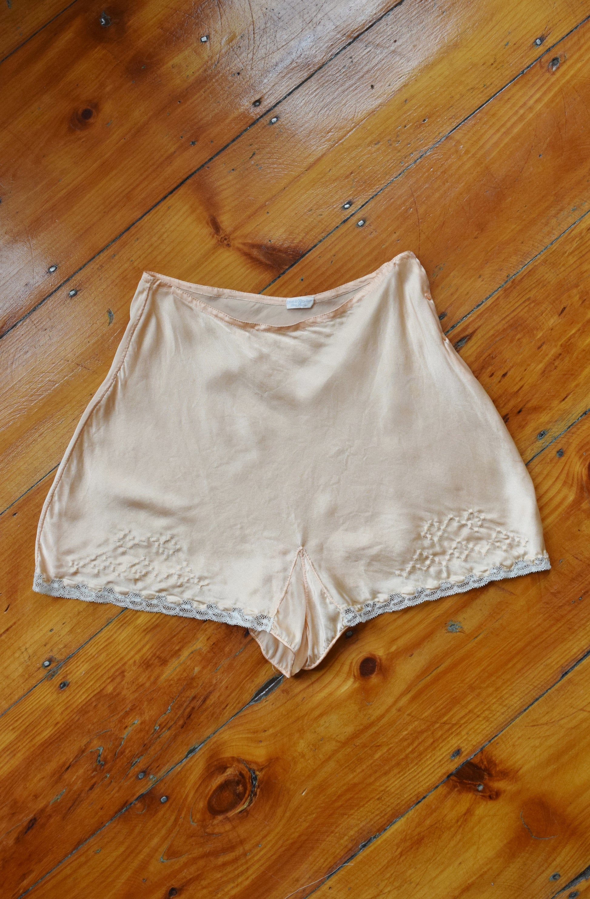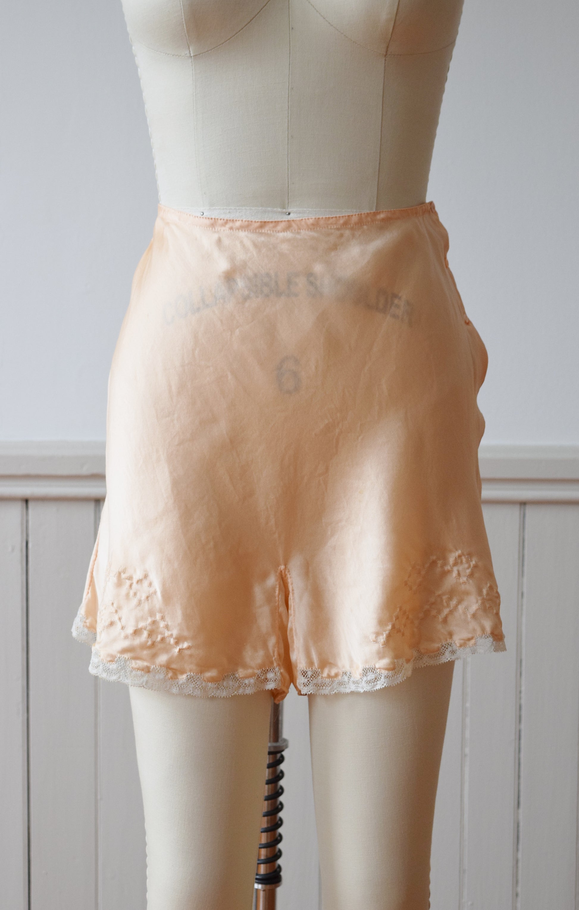 bias cut silk satin with trapunto deco embroidery. Lace trimmed. Gusseted crotch. All hand finished.