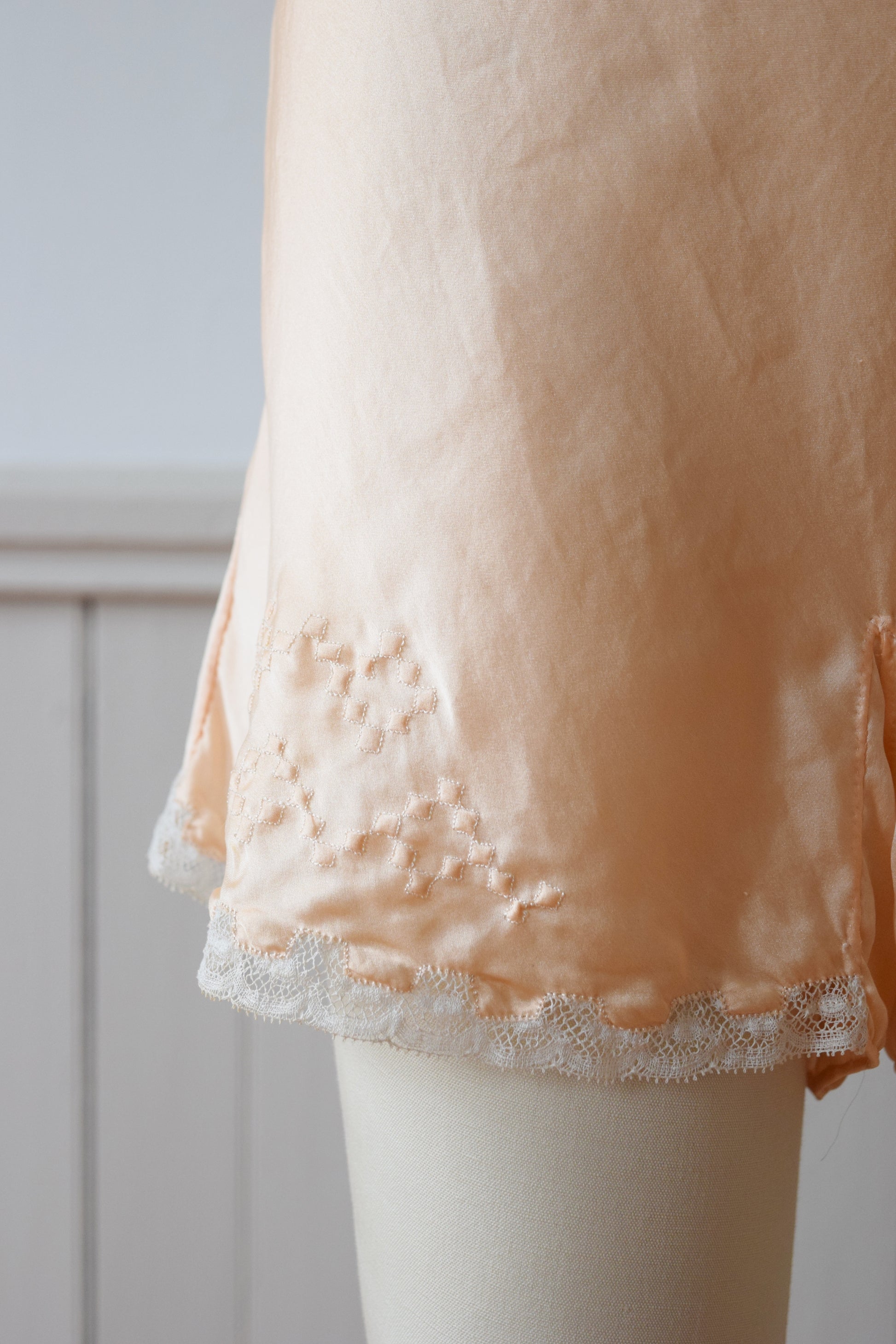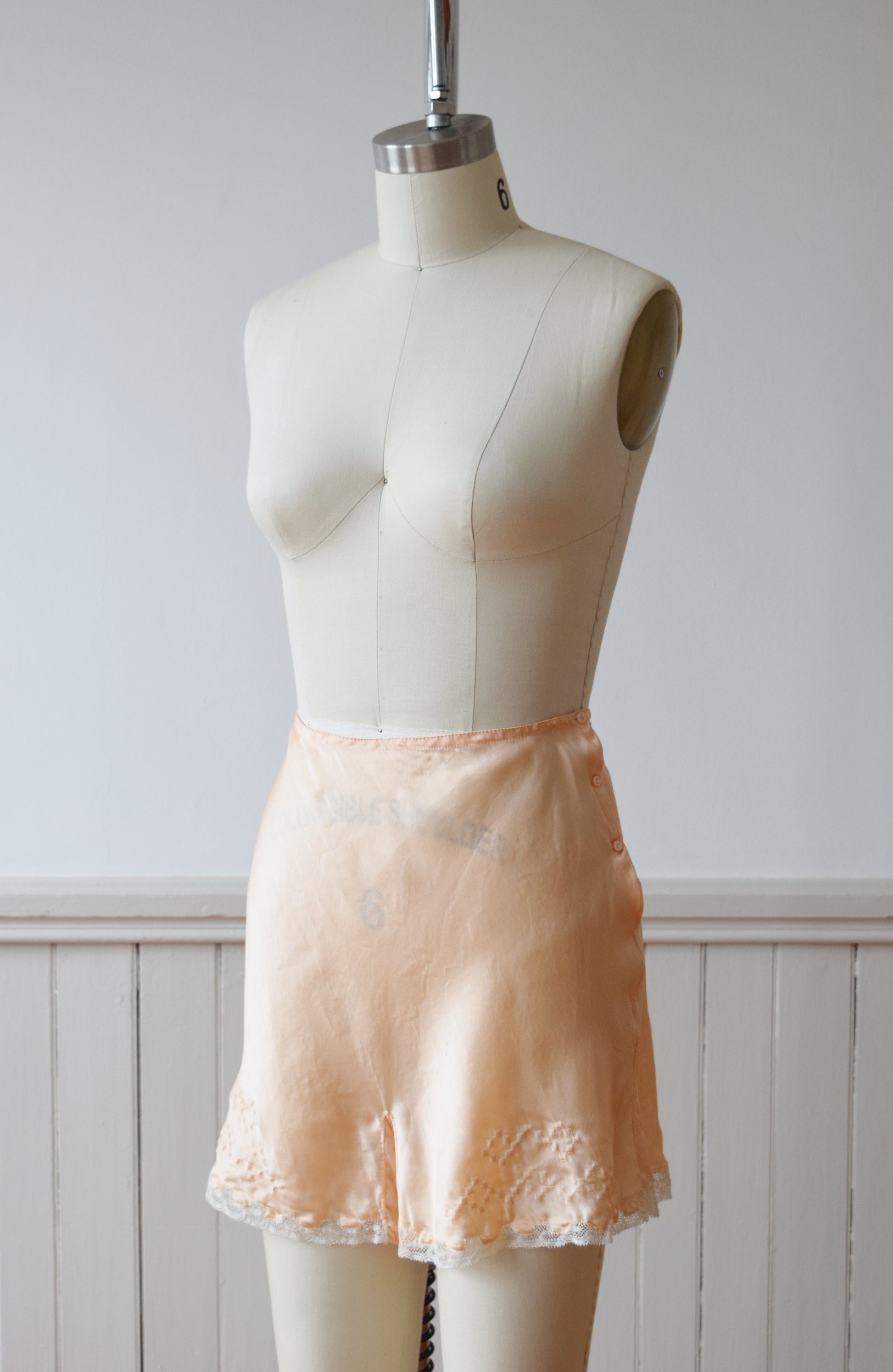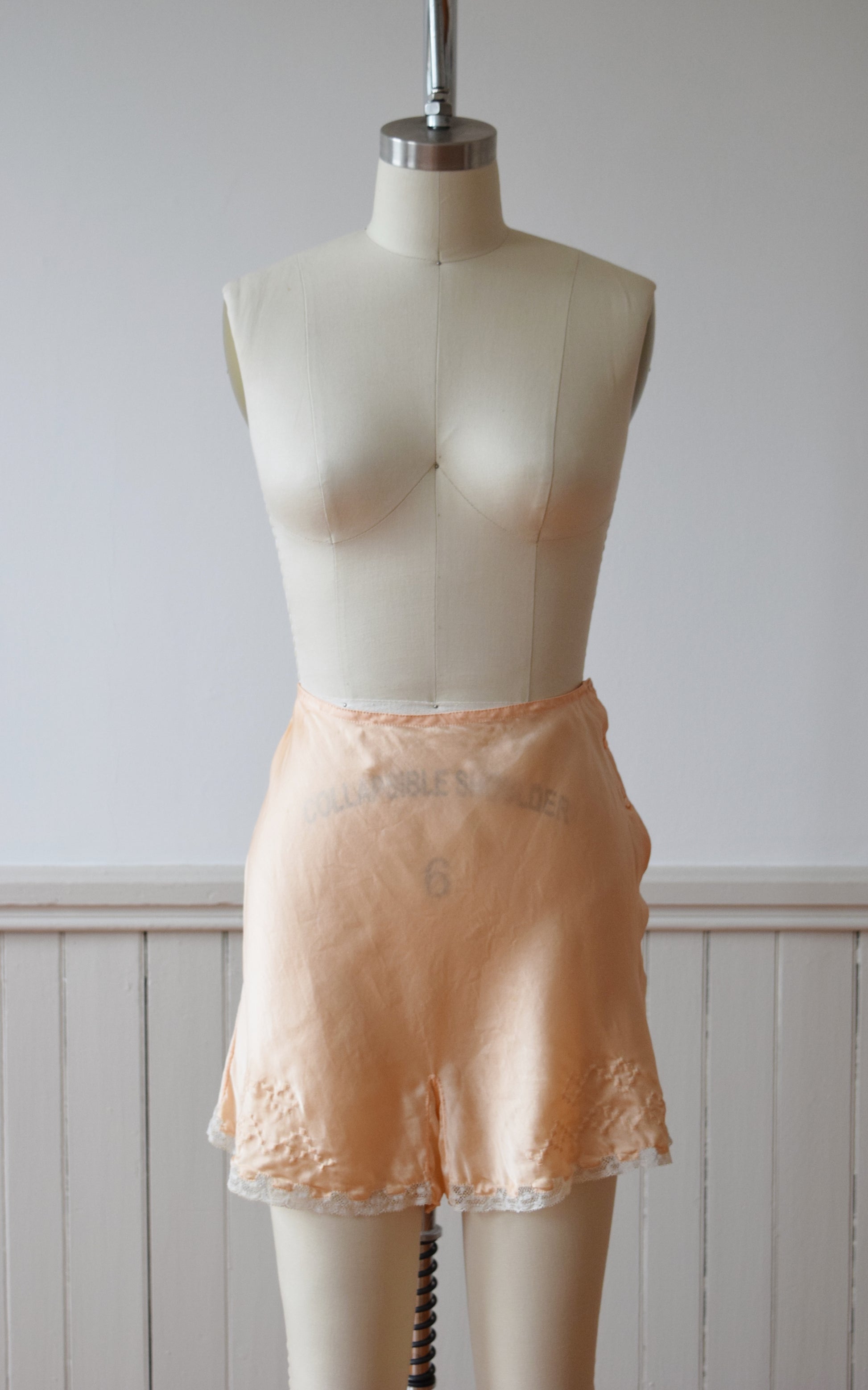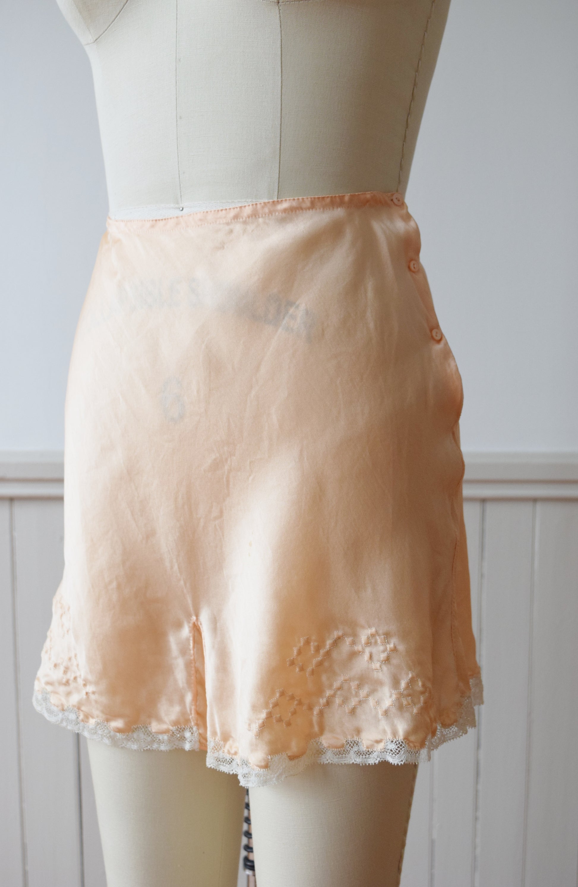 bias cut silk satin with trapunto deco embroidery. Lace trimmed. Gusseted crotch. All hand finished.