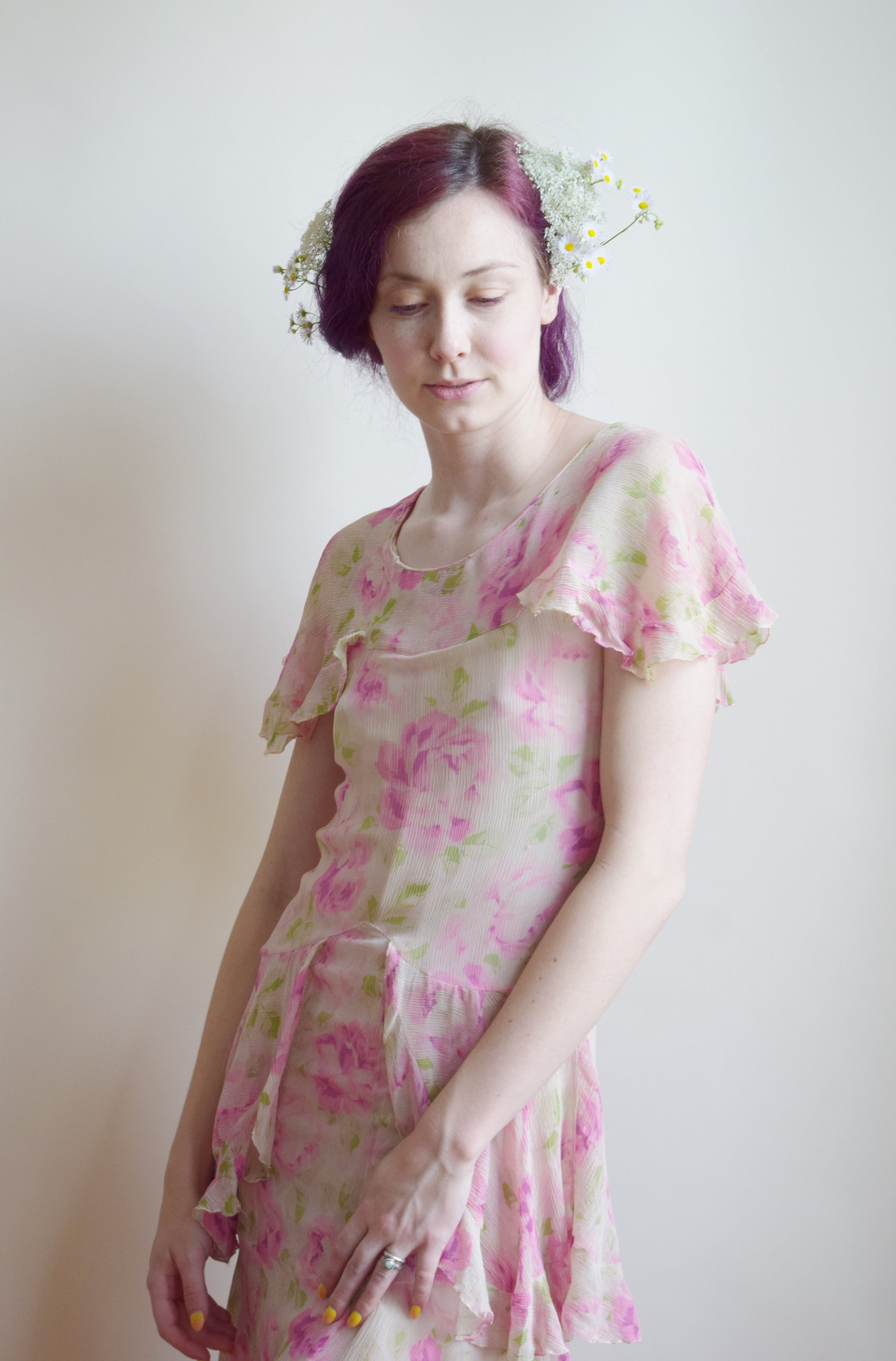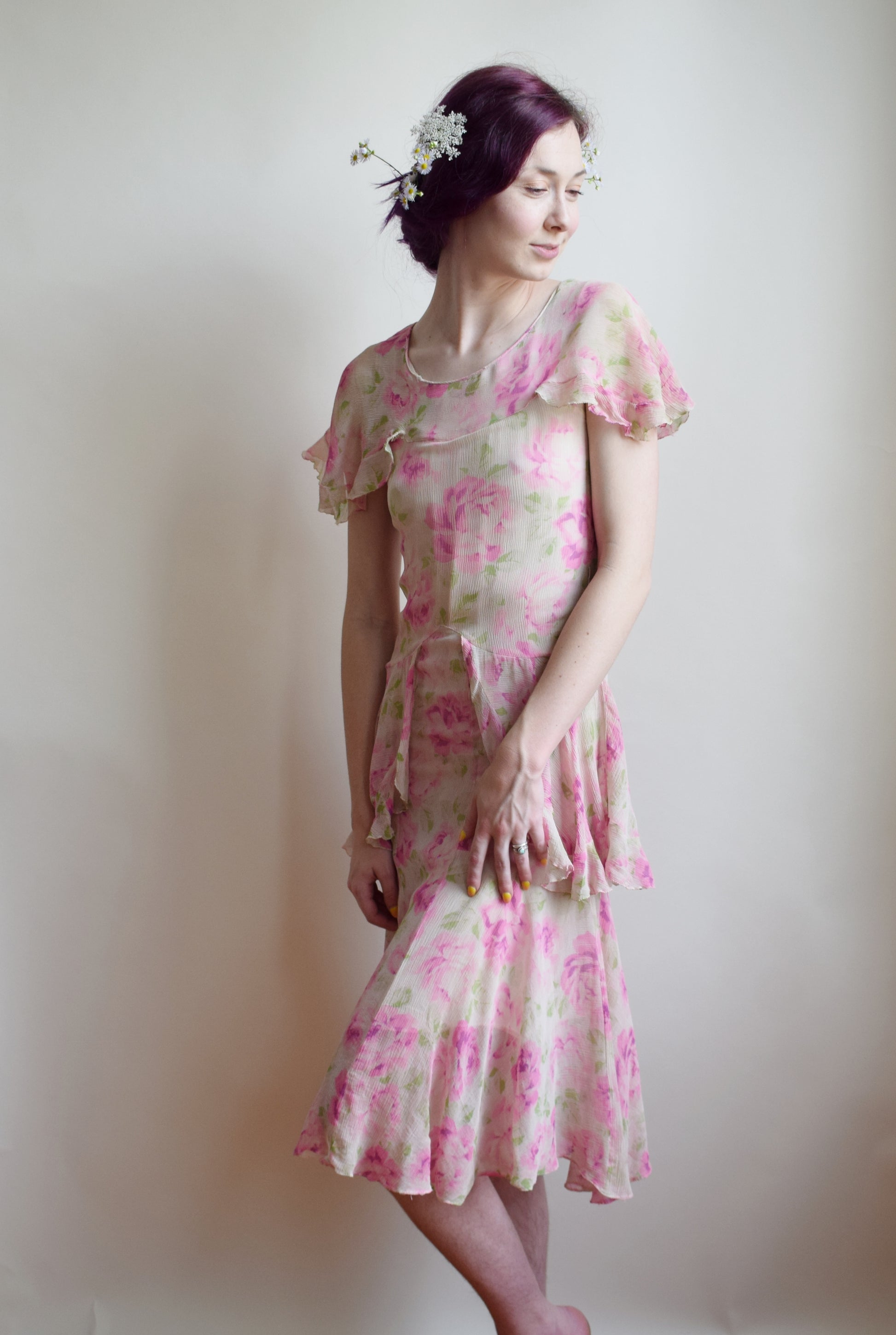 ethereal silk crepe with antiqued rose print. capelet, shaped dropped waist and ruffled hip panels/peplum and bias cut underskirt. attached silk crepe slip. loops for belt at natural waist.