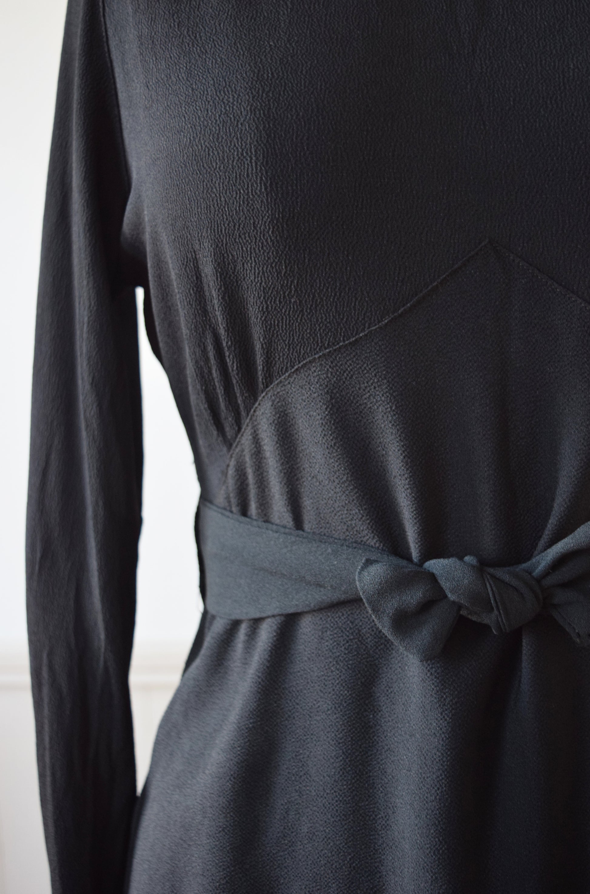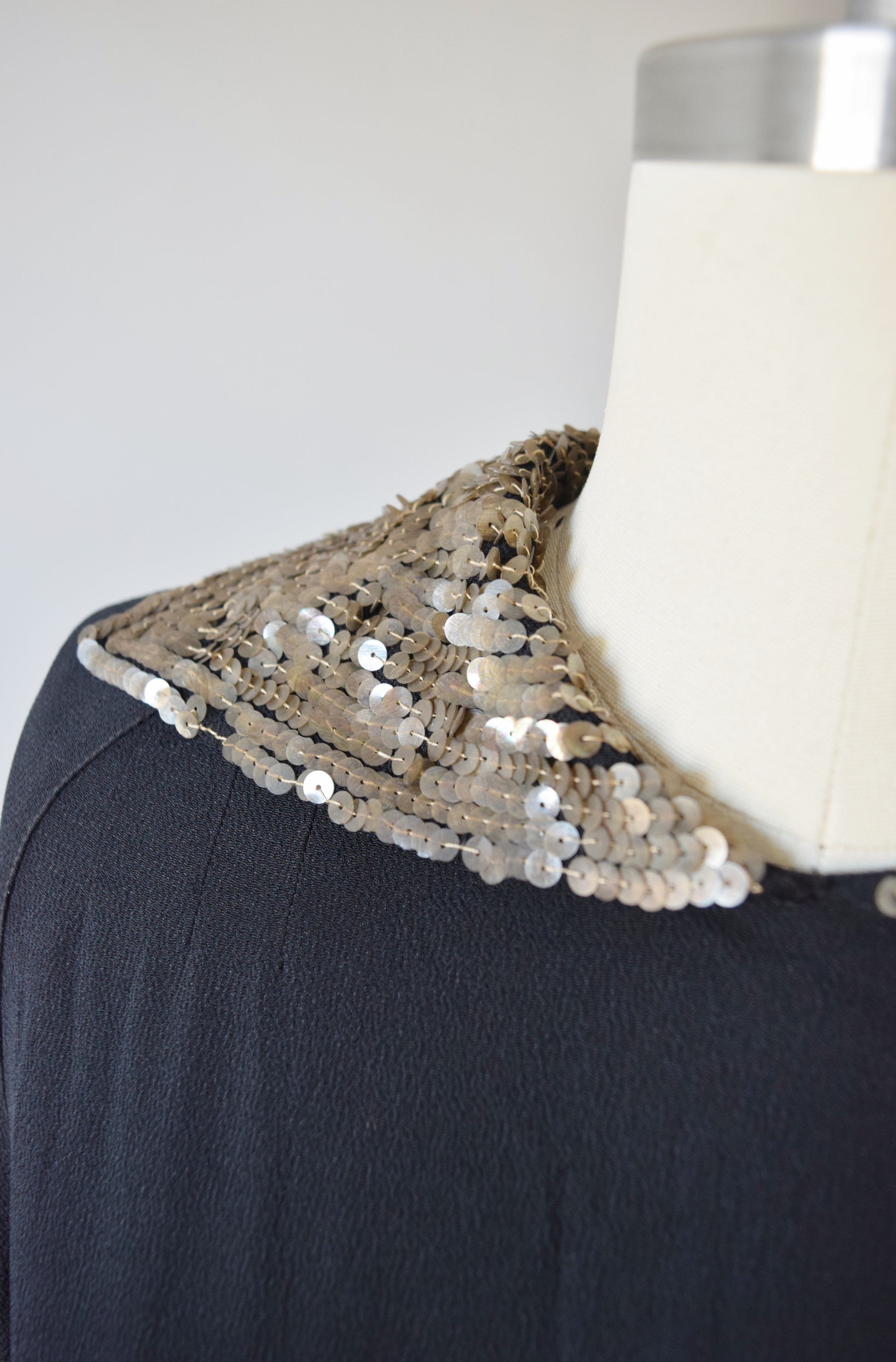 Long line blouse with peaked and lightly gathered underbust seam. Long raglan sleeves with wrist snaps. Lovely patinated gold sequins at wide collar and hem. Slits in side seam for half belt. Original belt is gone and is replaced with a custom made modern rayon tie belt. Deco buckle could easily be added if desired!