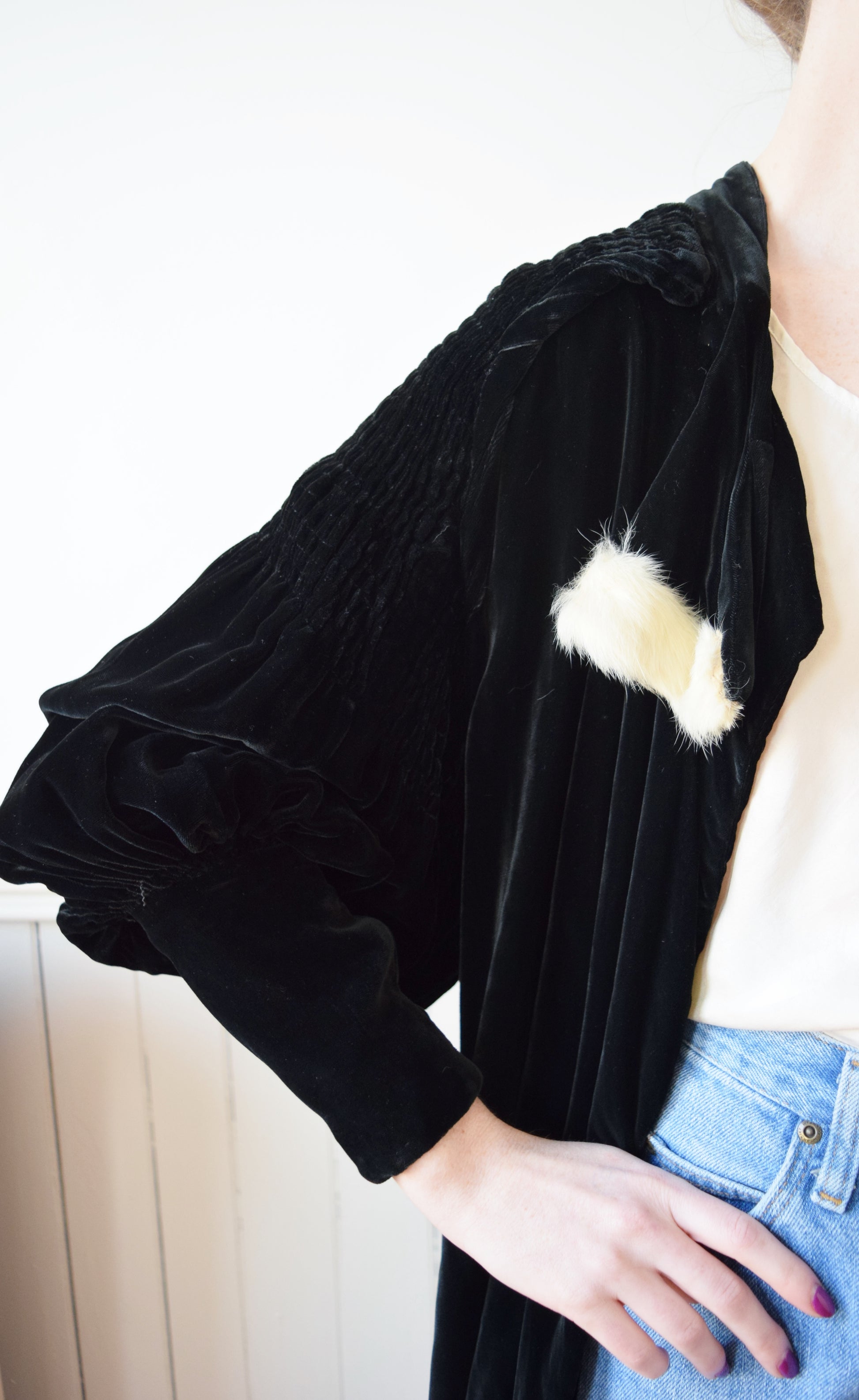 Opulent rich black velvet jacket heavily ruched across the shoulders with large bishop sleeves. Interesting rope detail drapes from the back neck and wraps under the arms to front. white fur accents at collar. boxy open cut.