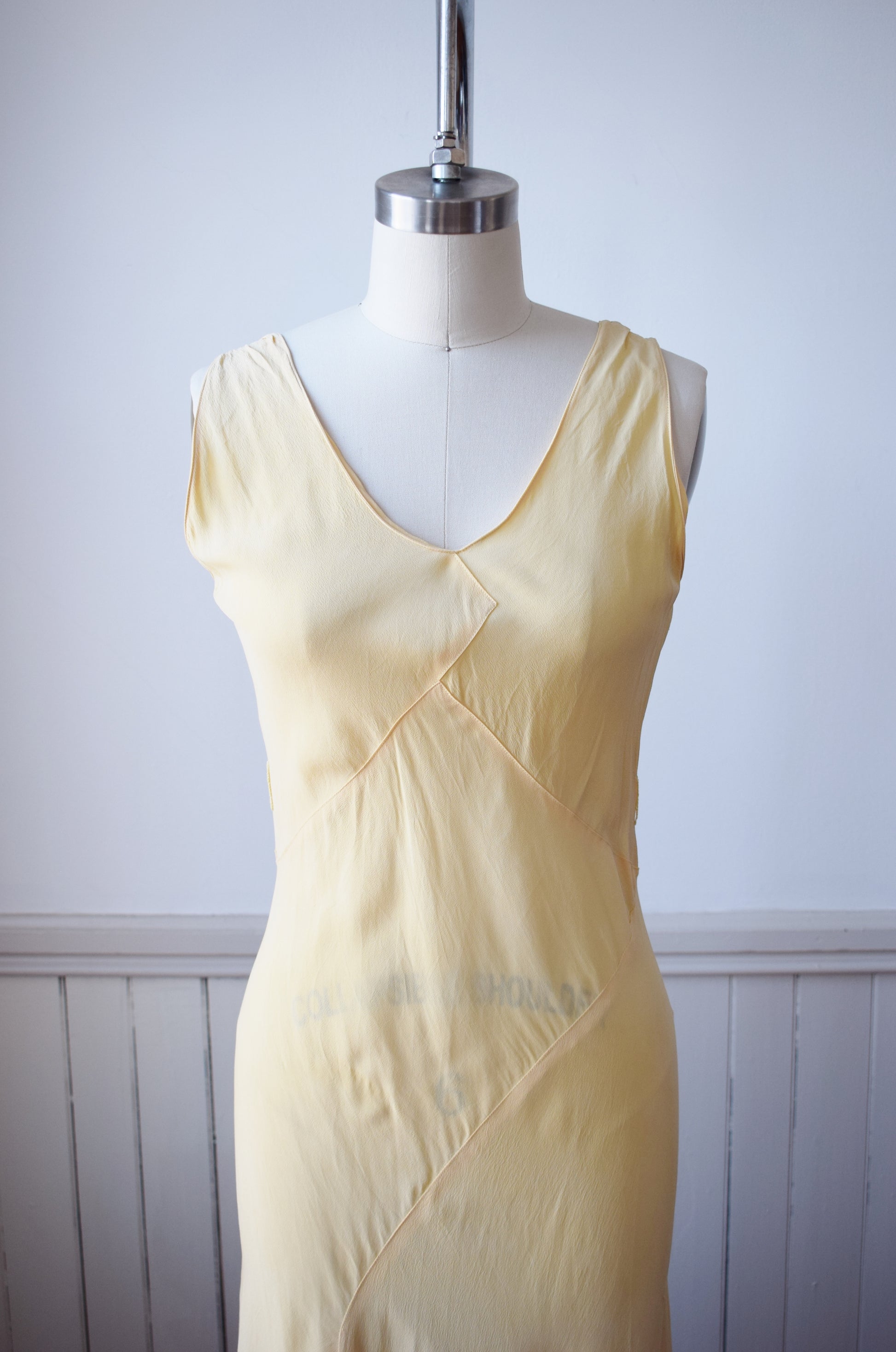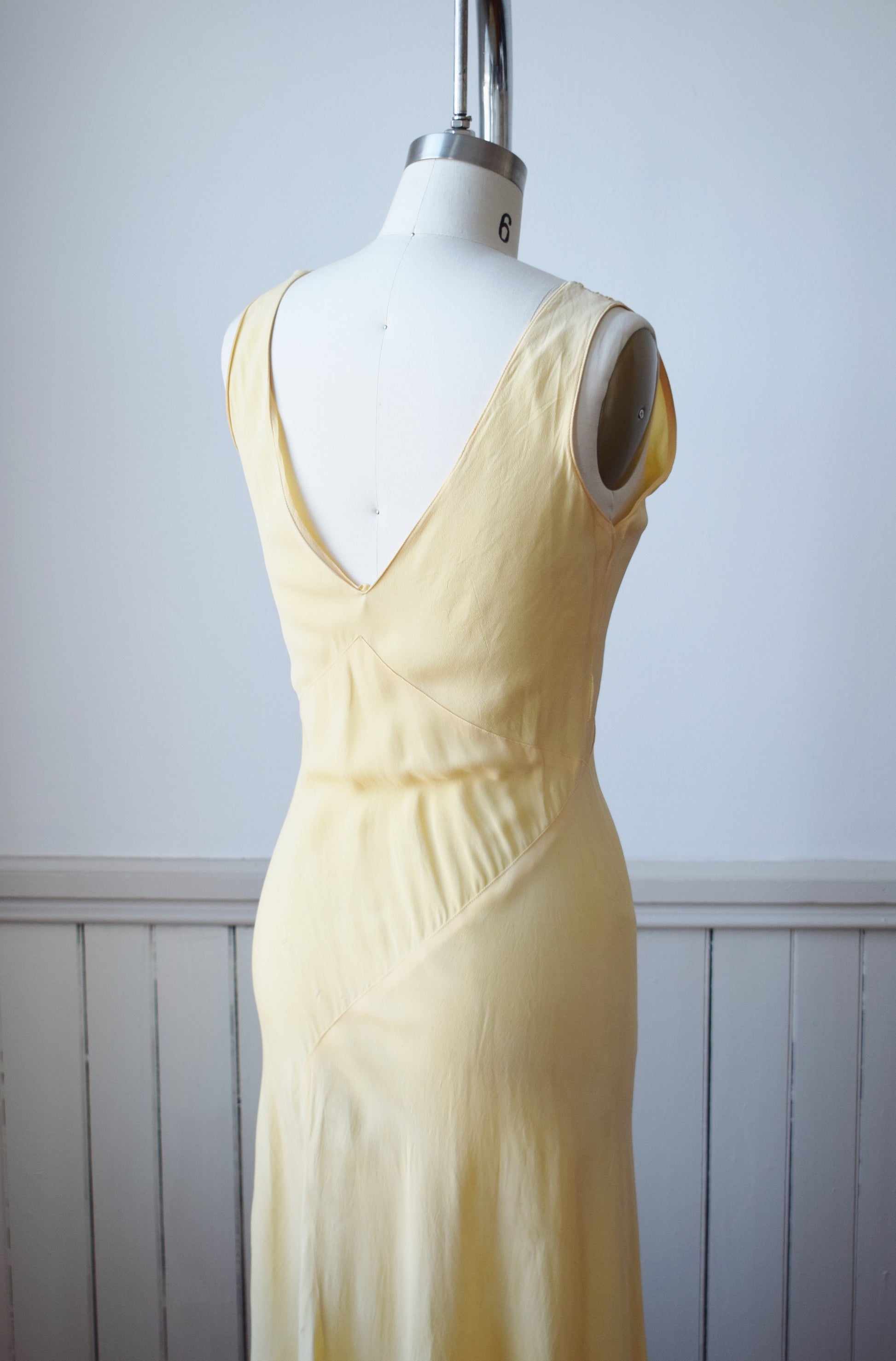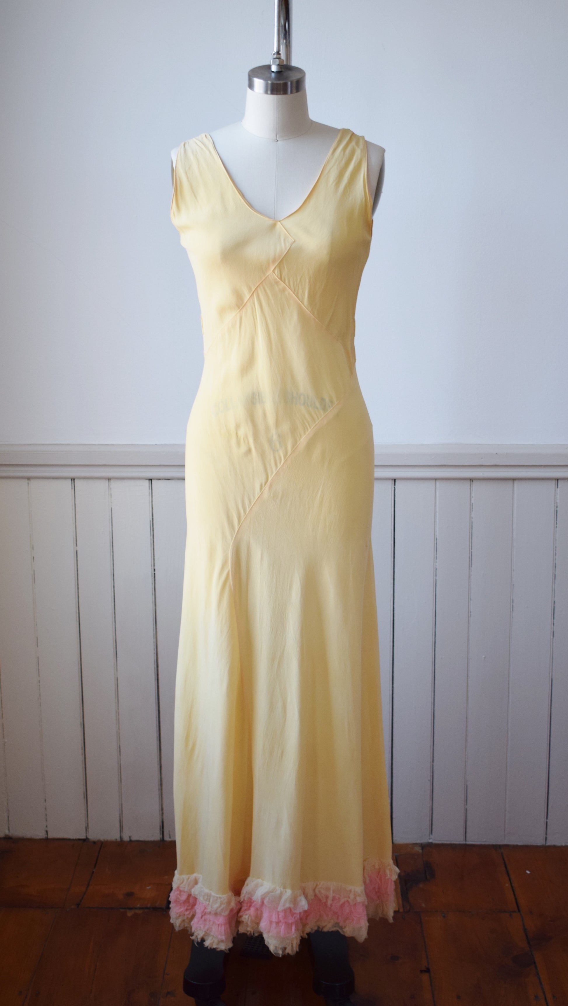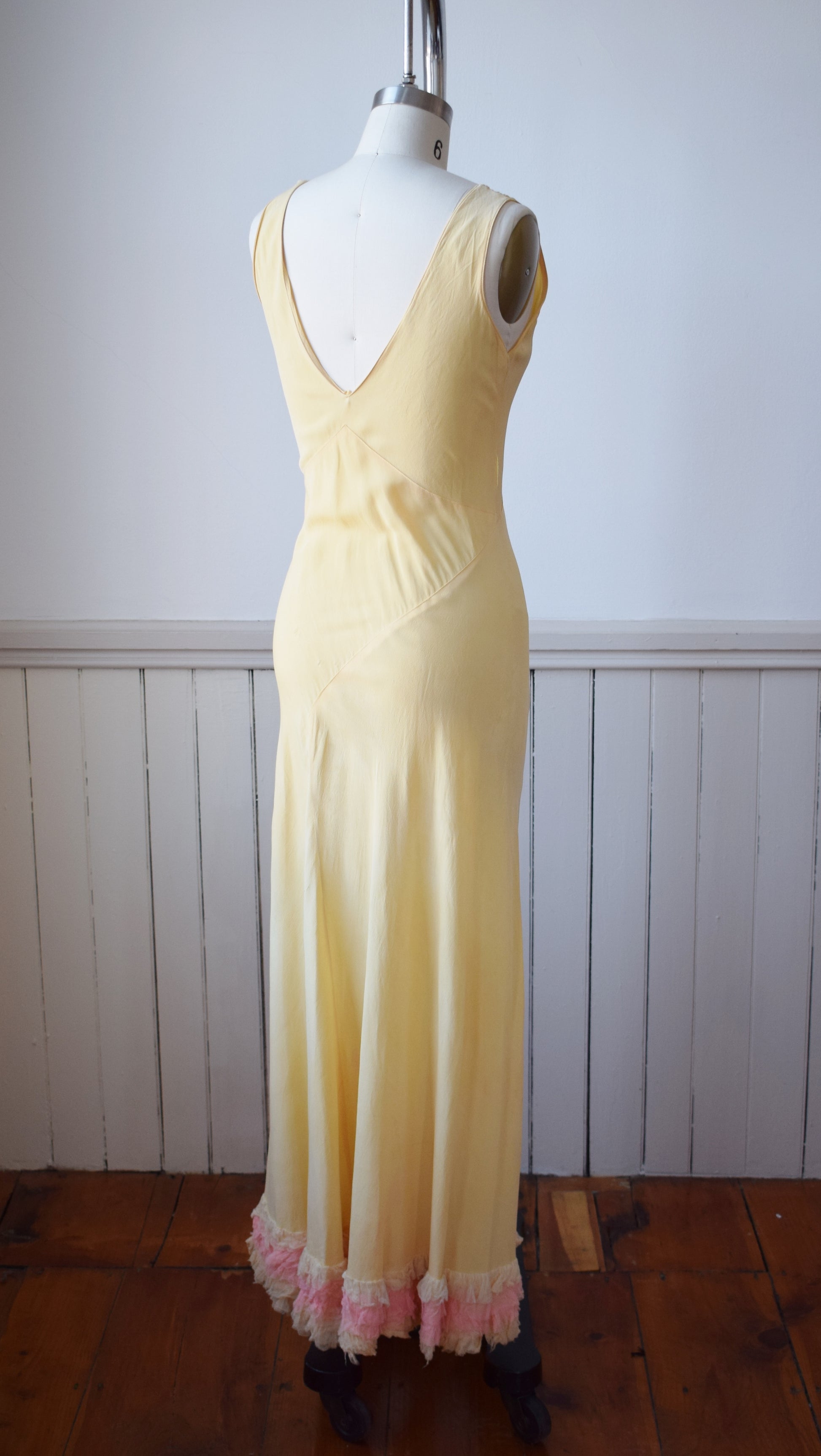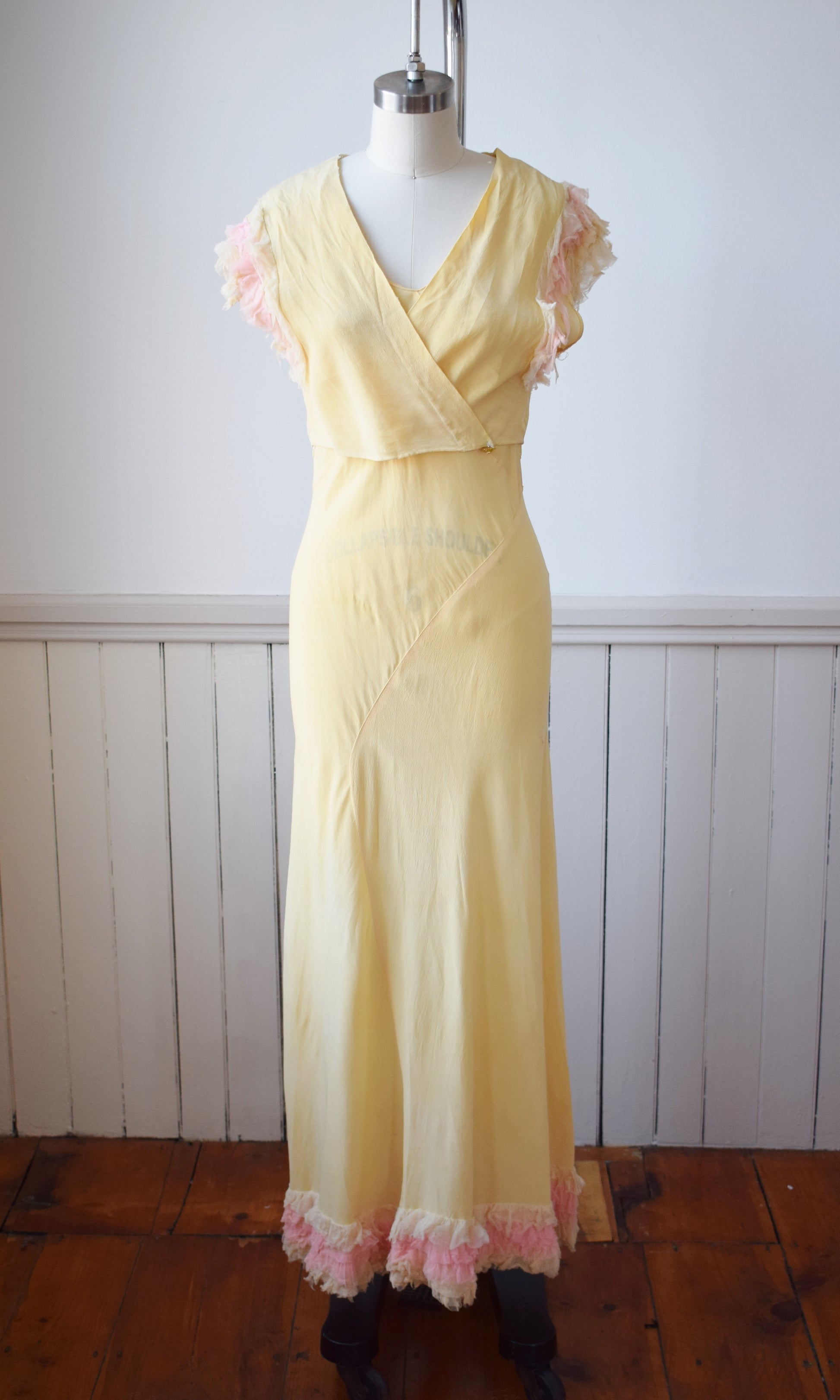 sweet yellow rayon gown cut on the bias with pretty seaming details and low V back. netting ruffle accents at hem and on jacket. pulls over head.