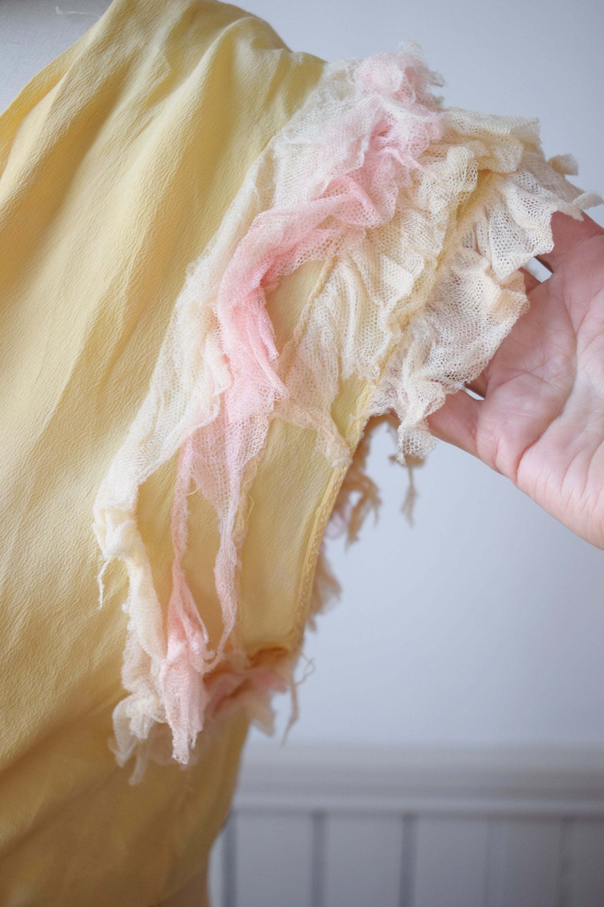 condition: fair. light fade and color variation throughout. some areas where rayon appears to be fragile or has small tears. netting is damaged and/or missing in some areas. a good piece for photos, study, short wearing sessions, or for one last hurrah (for the dress, not you!).
