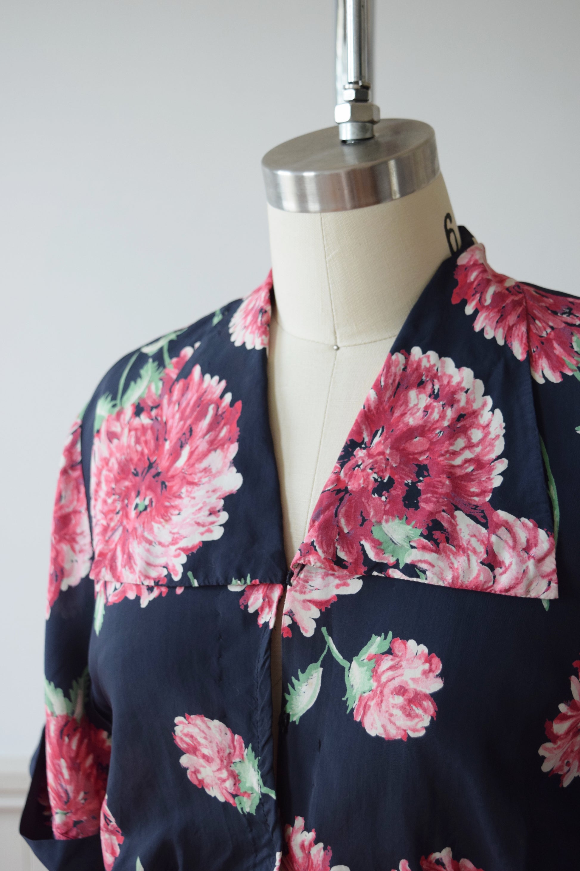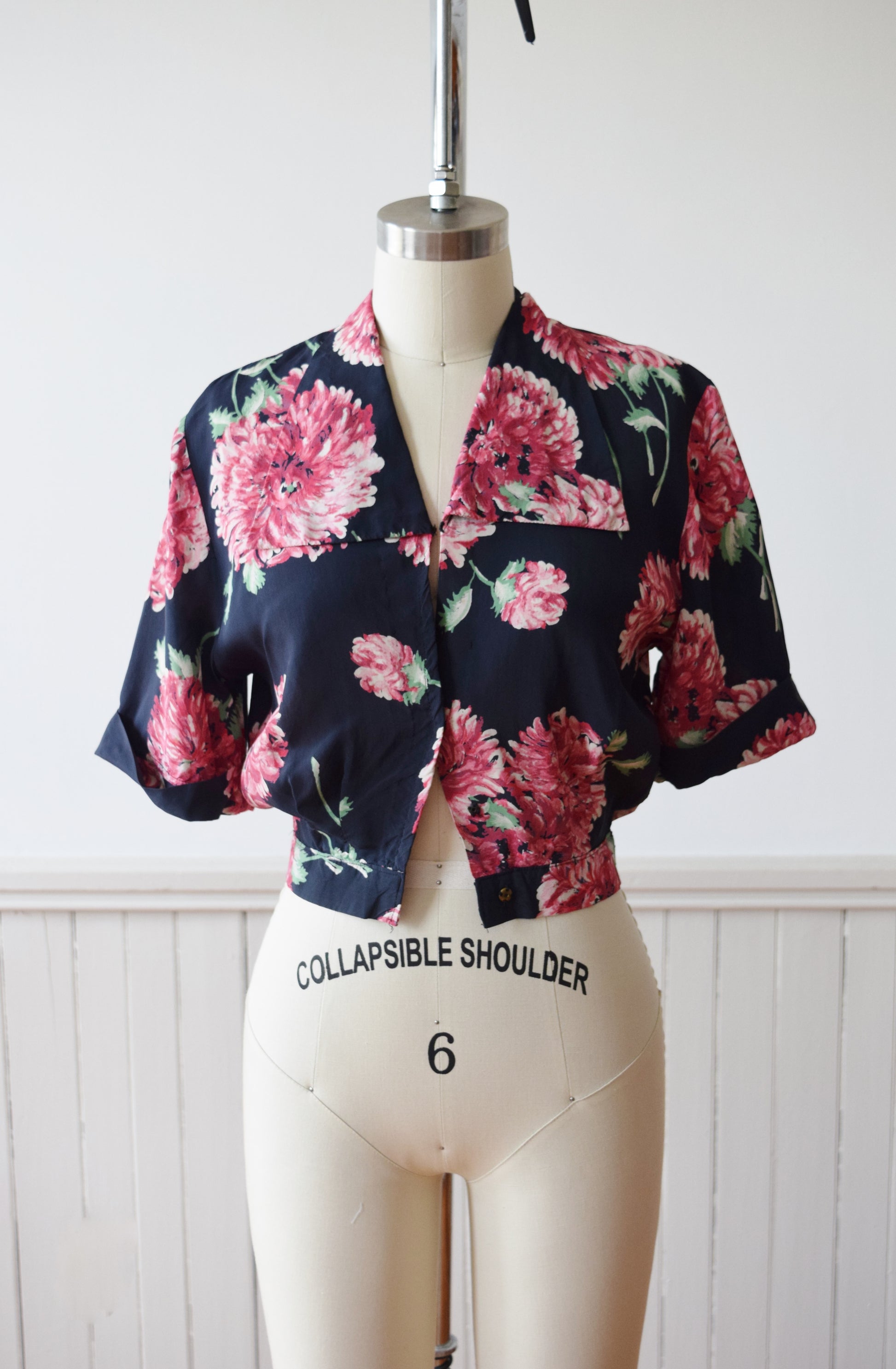 Perfect little silky soft cold rayon in a midnight blue/black with show stopping pink floral print. wide collar, cuffed sleeves, blouson cut with darted cinched waist. A perfect pairing with palazzo pants or high rise denim.