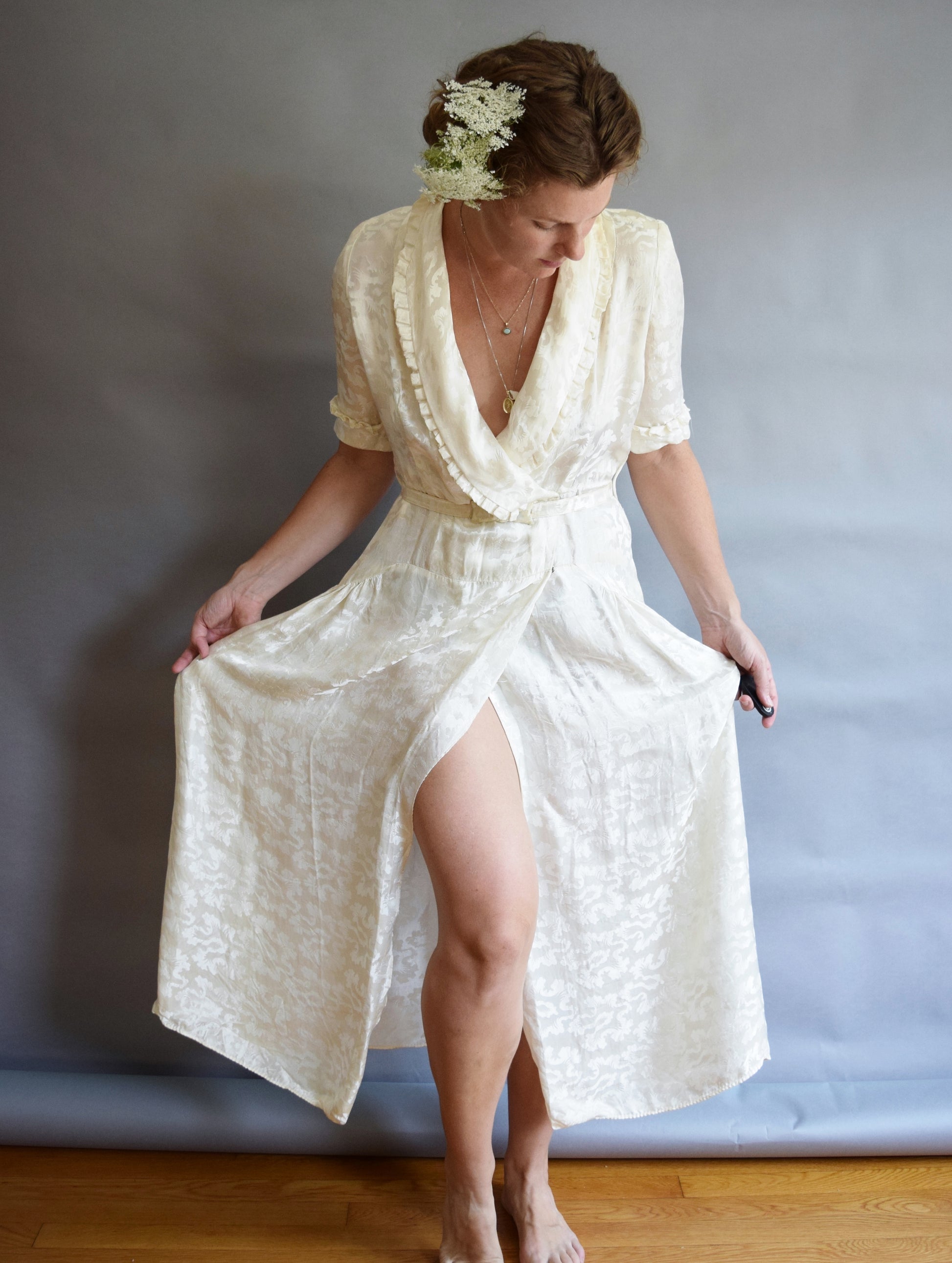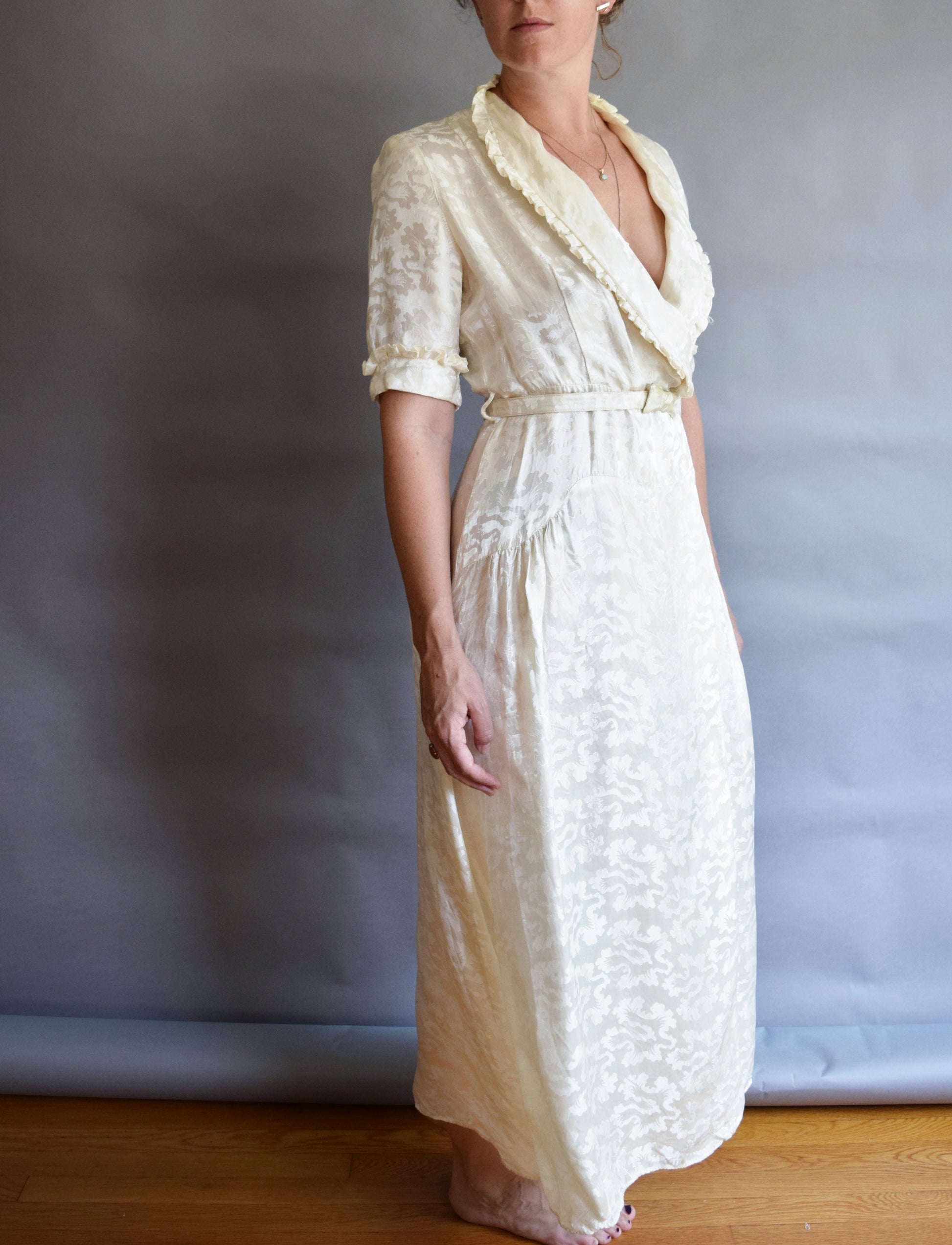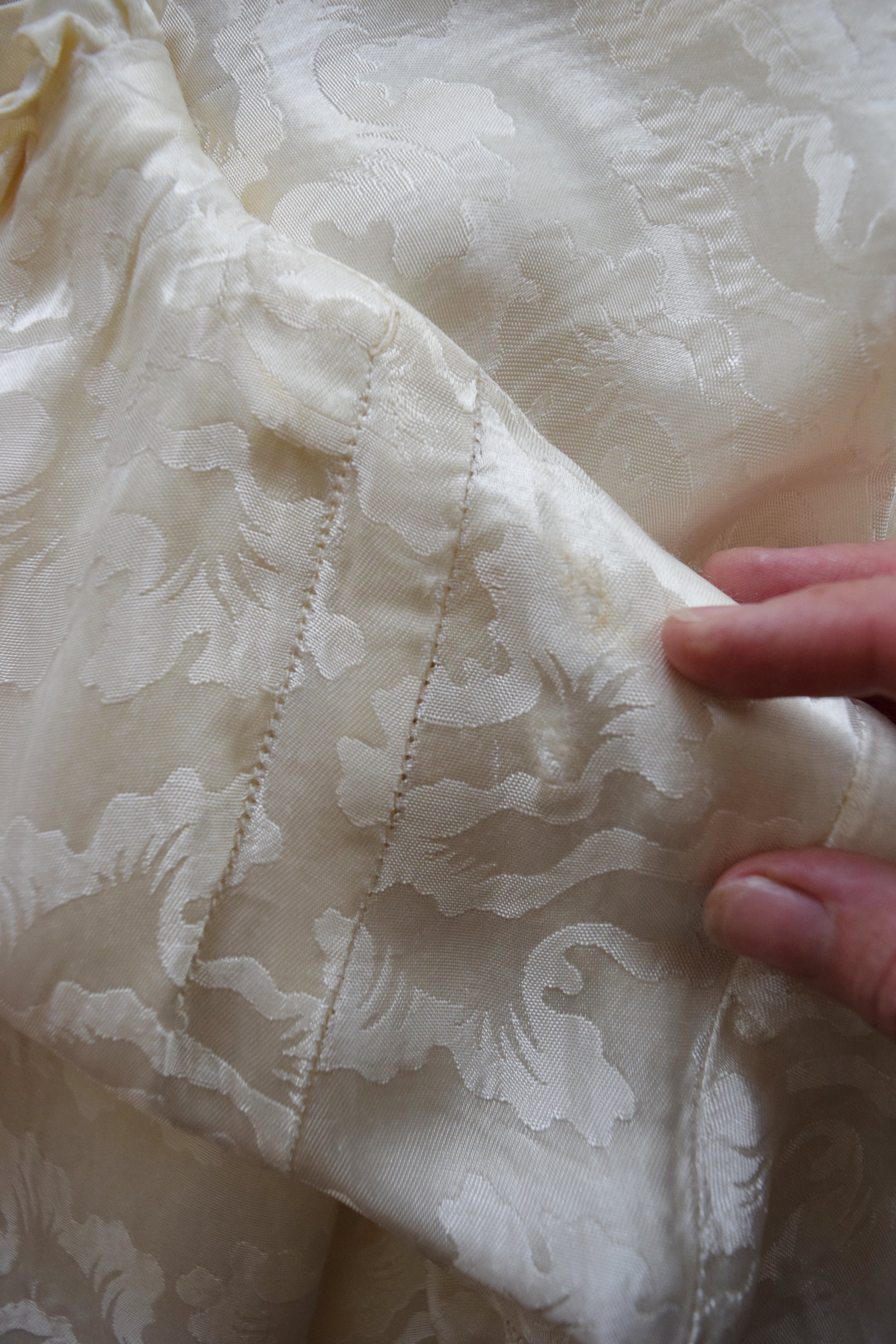 soft and drapey cream satin jacquard with Asian-inspired cloud motif. Pleated ruffle accents, padded shoulders. Yoked waist with lovely seaming and lightly gathered skirt. Original fabric covered belt with bow-shaped buckle.