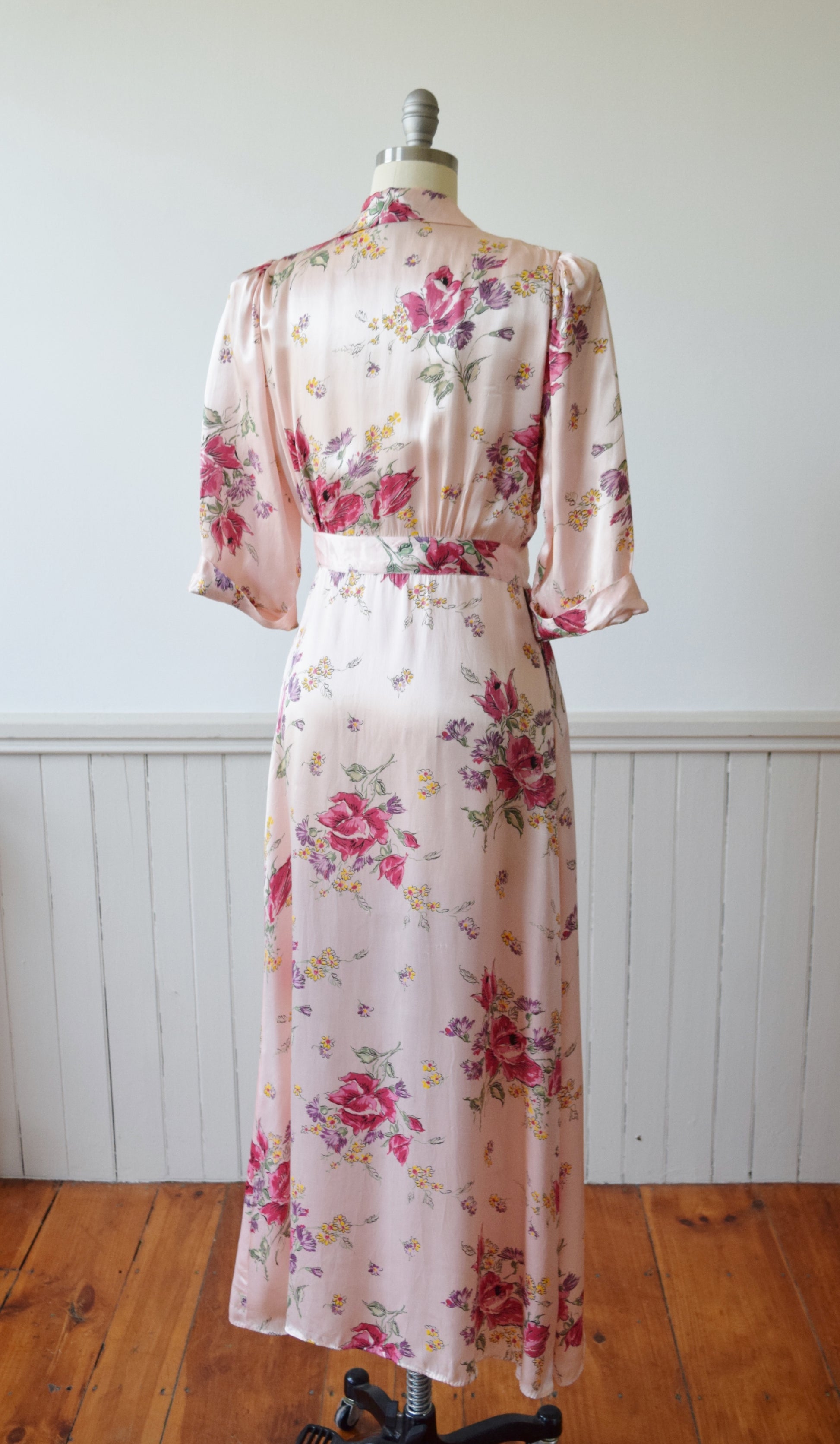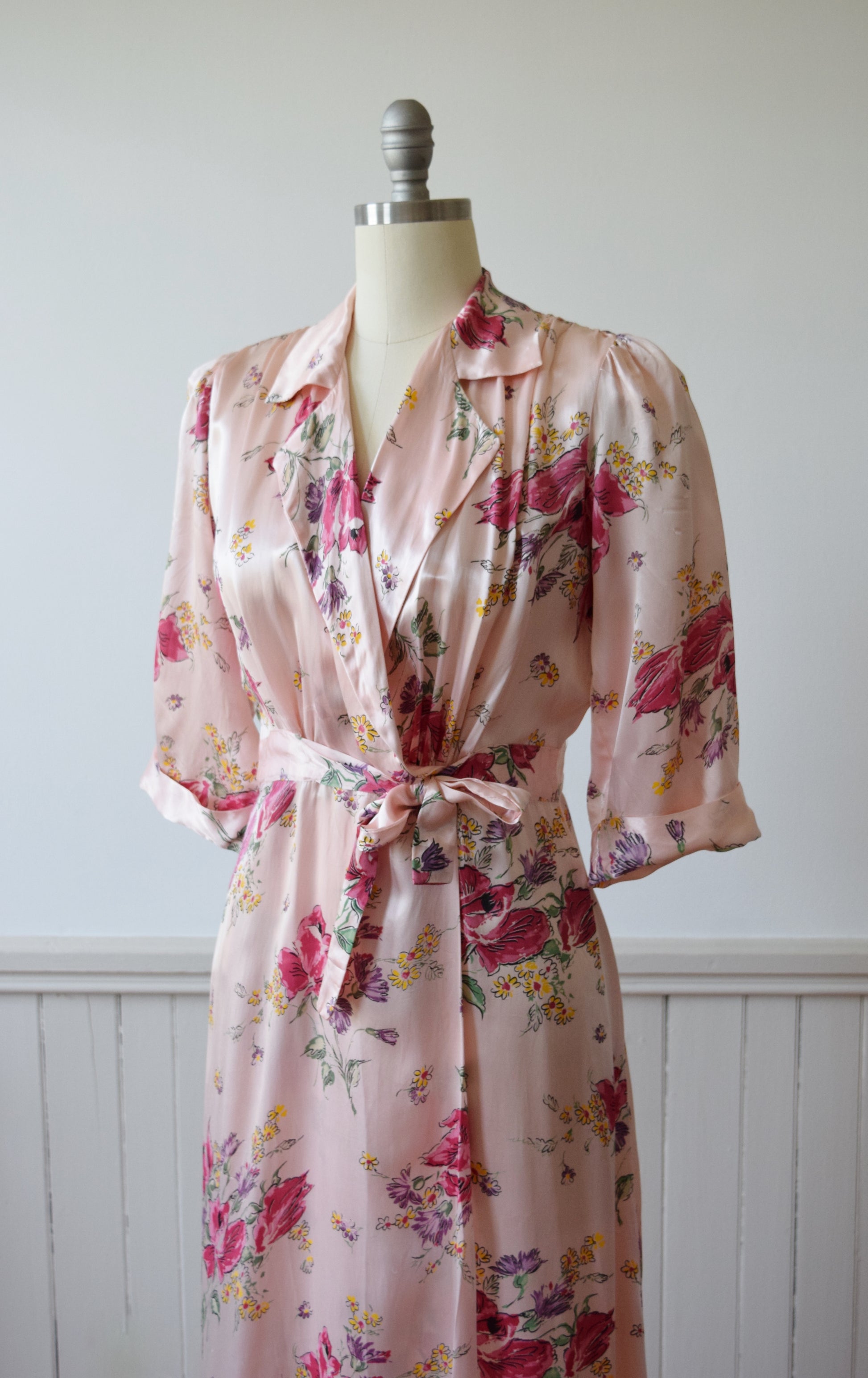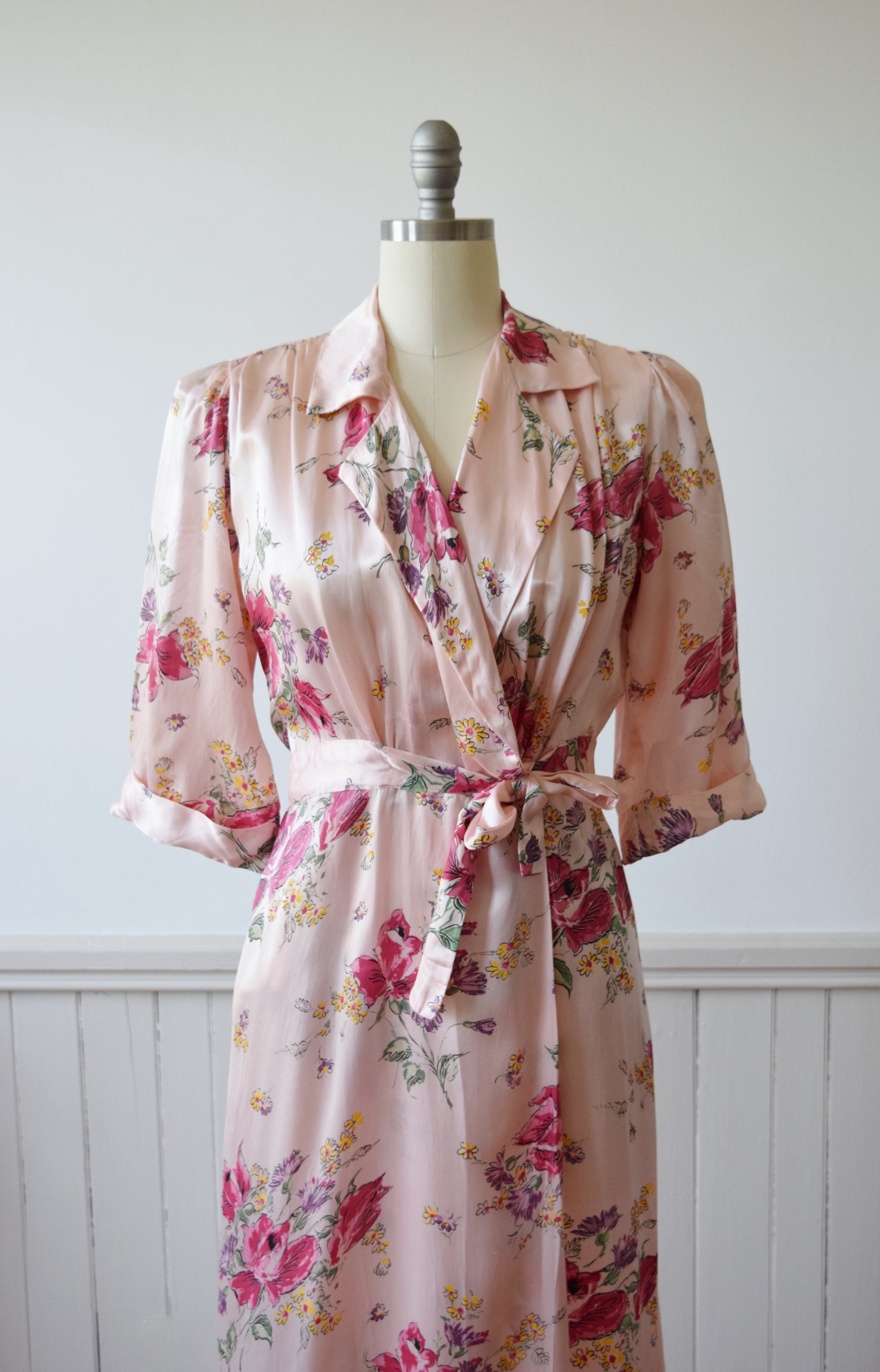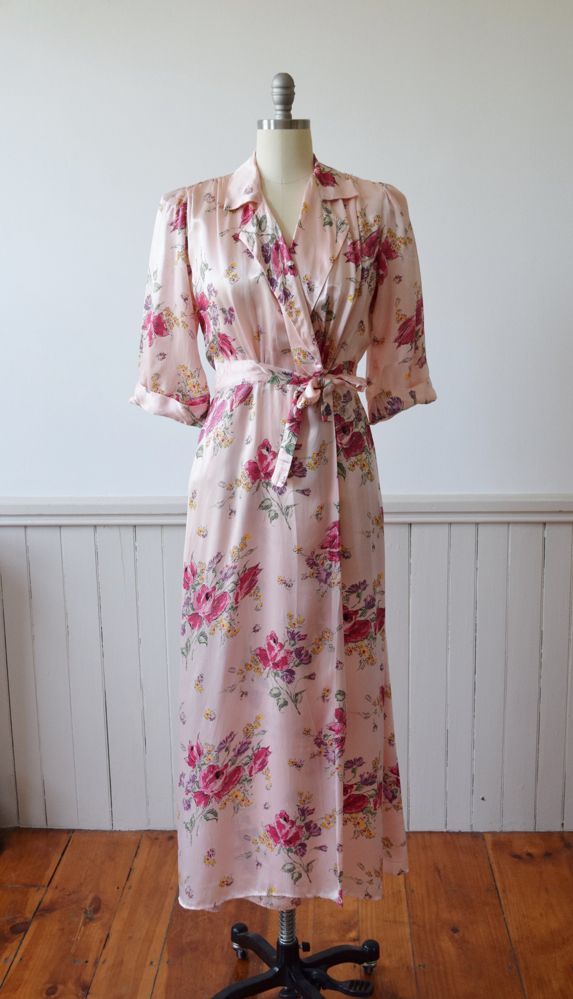 silky satin with colorful floral print on a pink ground. Classic wrap-style with small shoulder pads, gathered and cuffed ¾” sleeves. Attached belt ties at the front left.
