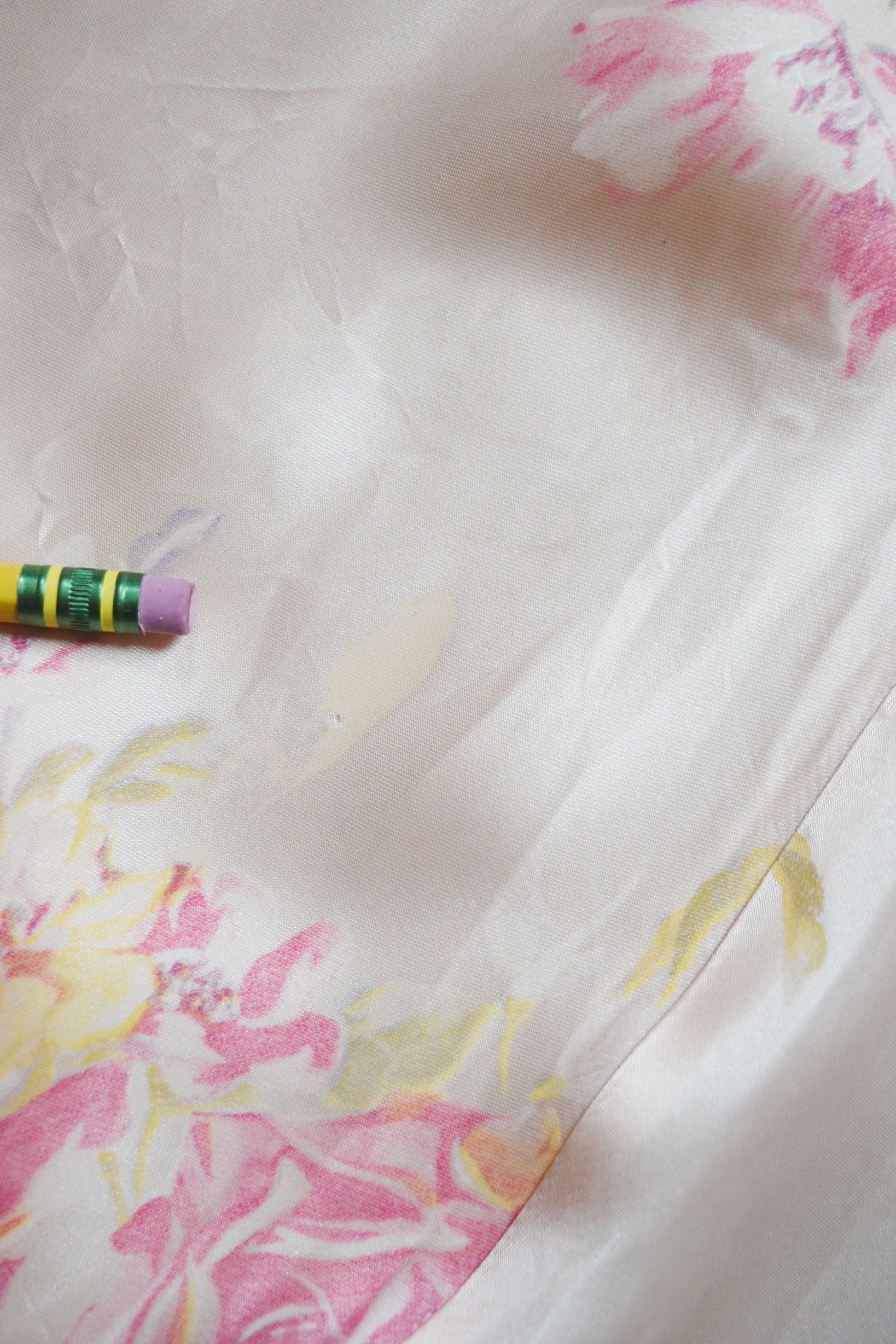 Condition: very good. Sturdy, presents beautifully, freshly laundered. A few scattered beige spots in the lower back skirt appeared when ironing, they are pretty lost in the print / sheen / drape. See image. a water mark that is visible from certain angles at the left lapel did not lift with further washing / soaking. Little ink dot in same area. Original elastic loops at waist have slackened but still functional. (please note: images added for condition purposes aren't always color-correct!).