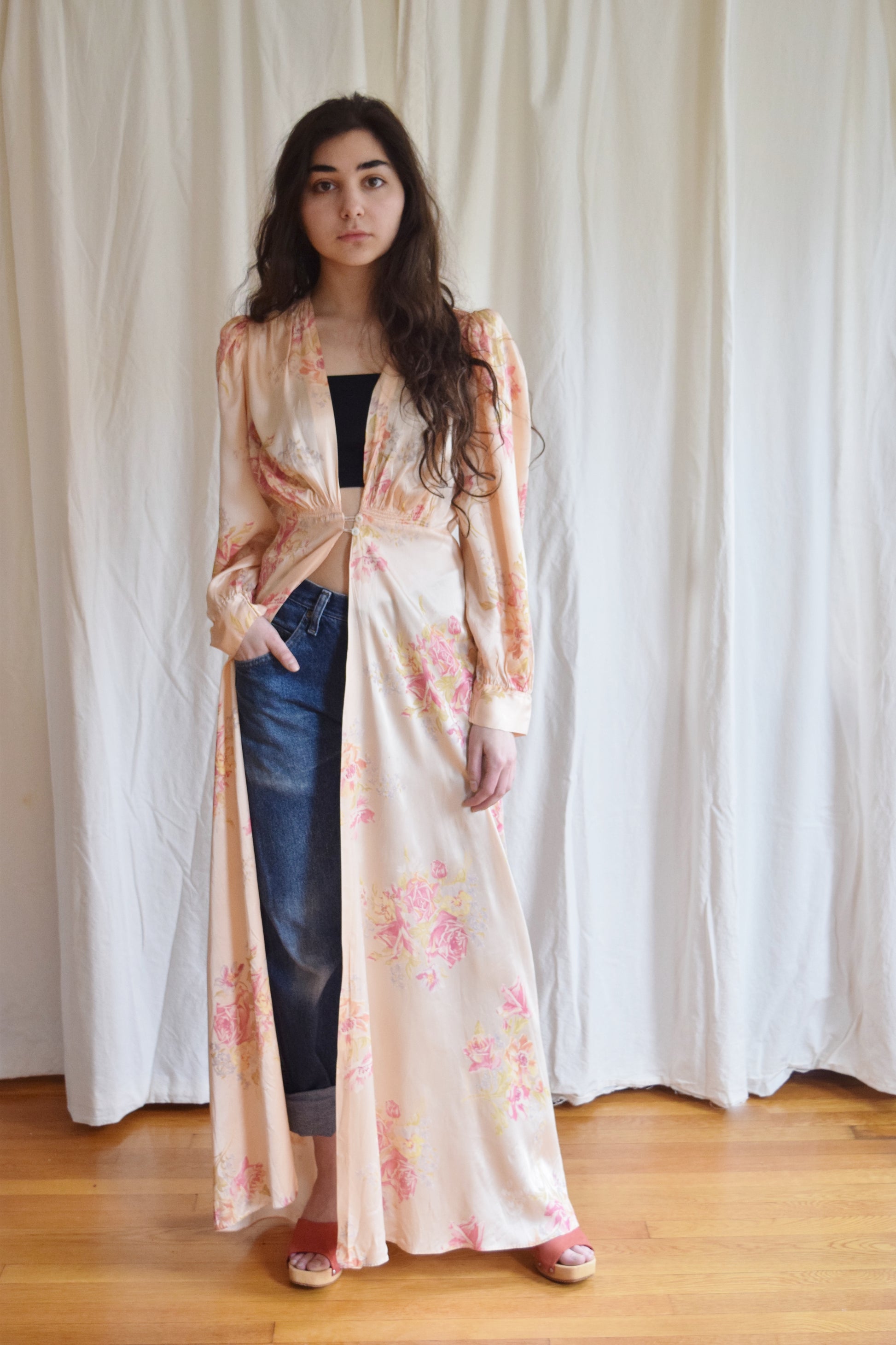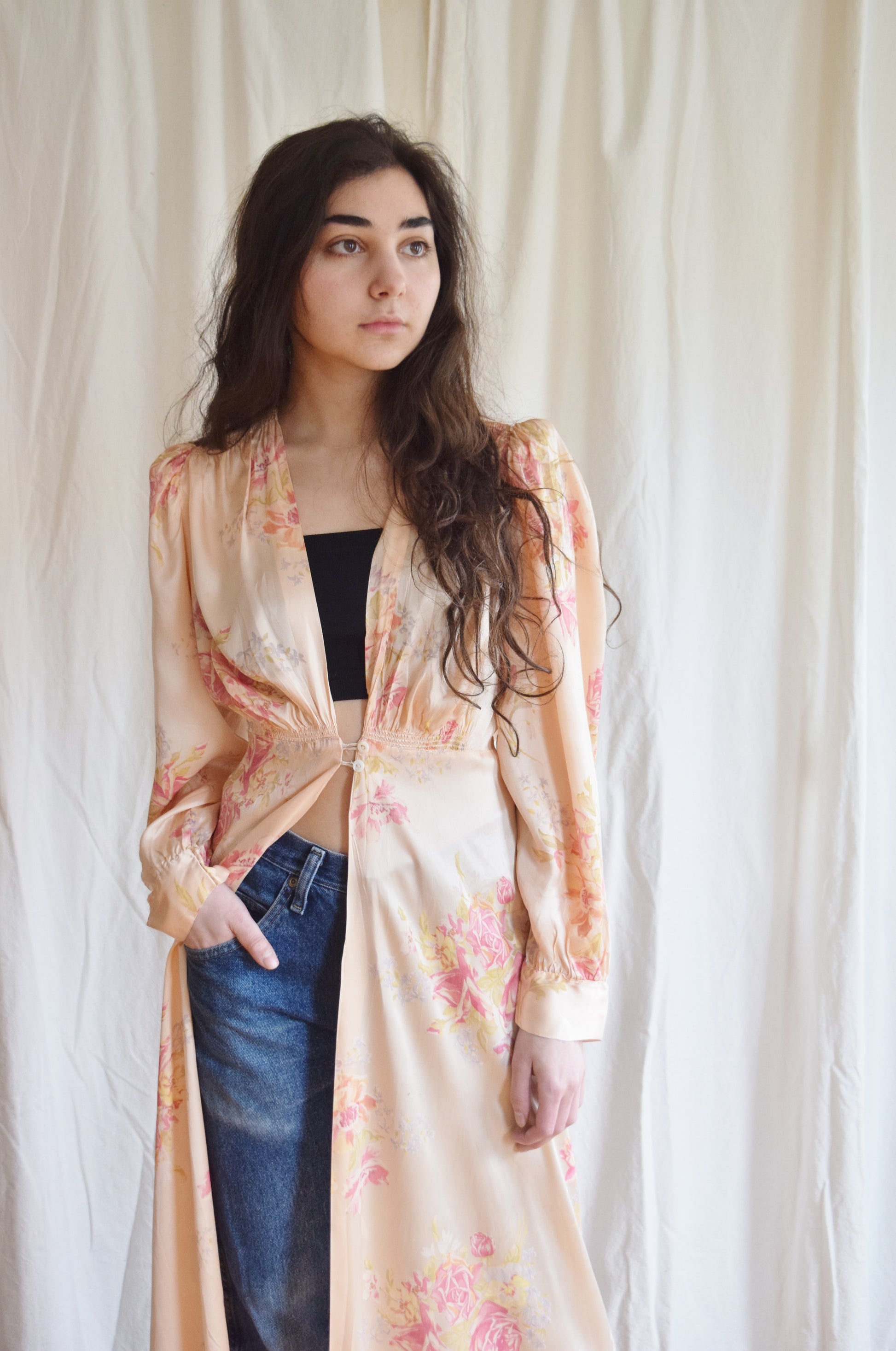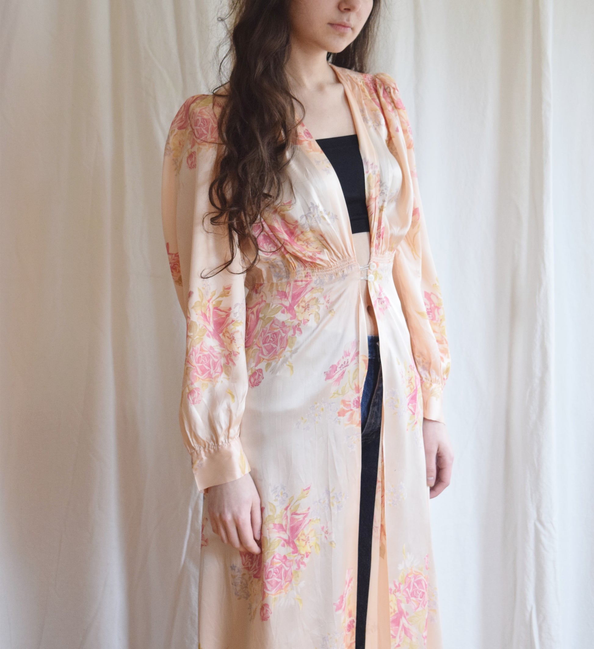 Designed in peachy pink satin with romantic rose bouquet print. Shirred bodice, dramatic bishop sleeves with small shoulder pads and bias cut skirt. Fastens with double button and elastic loops.