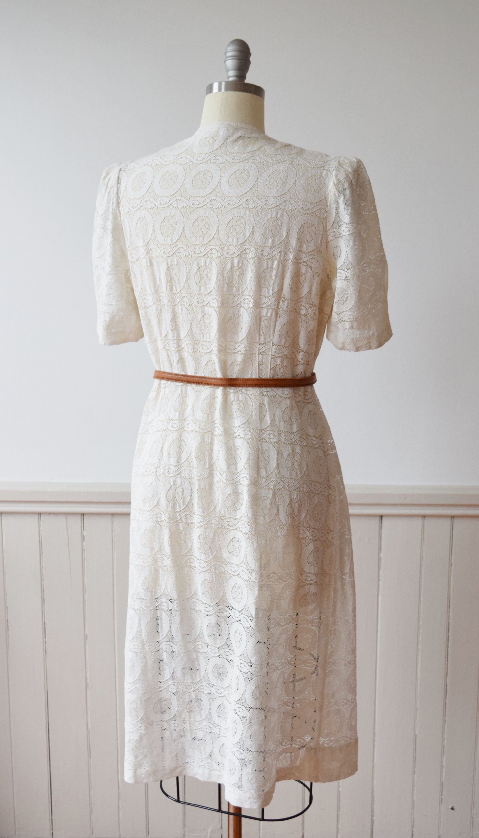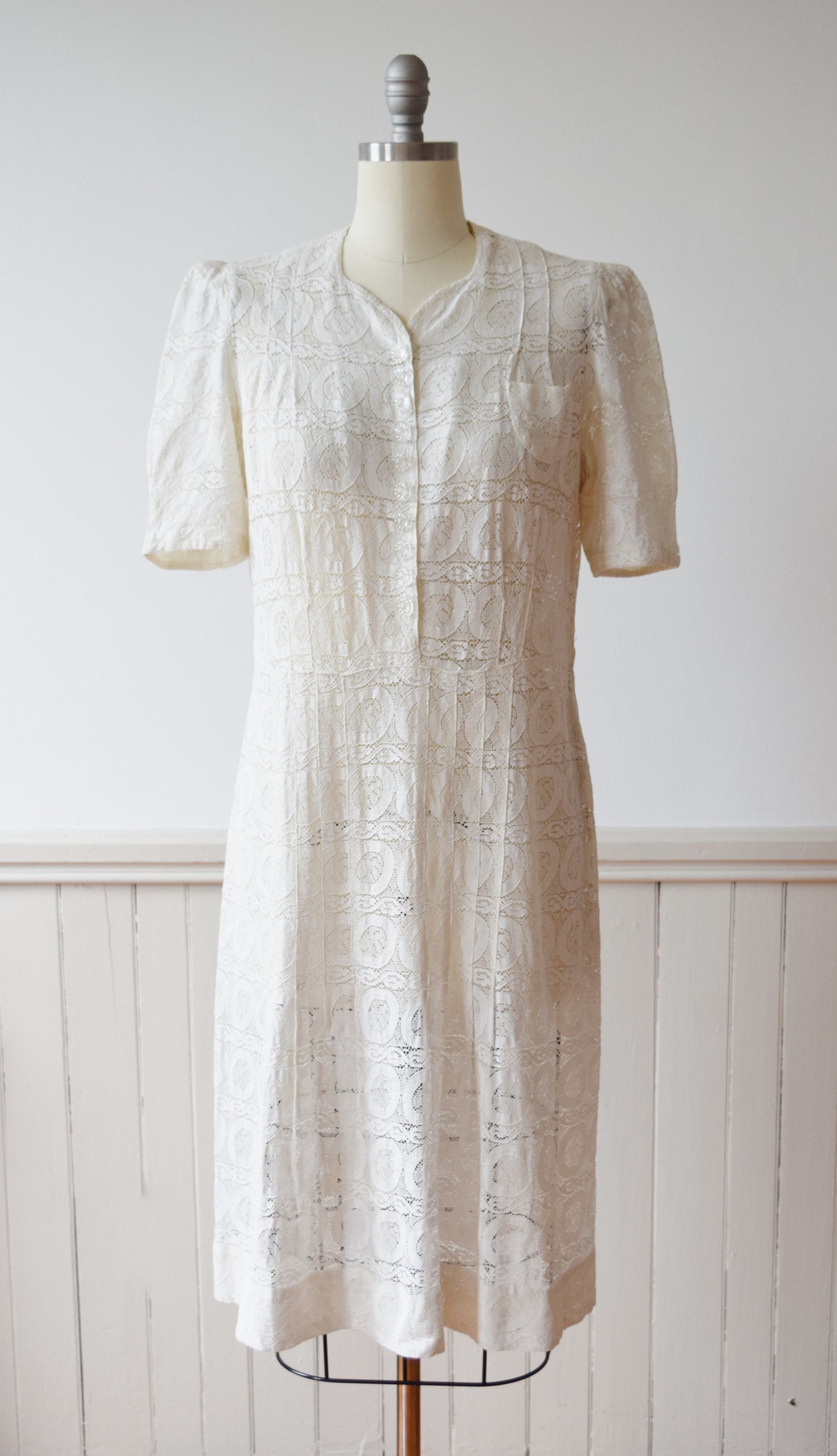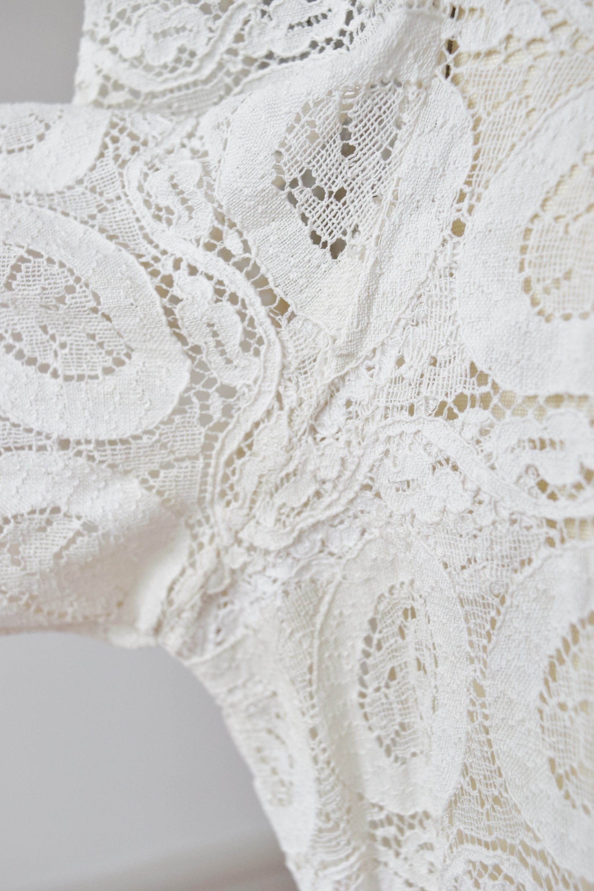 condition: good. freshly washed and ready to wear. small light area of rust where old hook and eye had been (not visible at all when belted). a couple small holes in skirt were invisibly patched using excess hem material, these are not easy to spot. Right underarm had several tears that were patched as well, the patching came out nicely, but I have some concern that overall the lace may be a bit fragile, although not deteriorating by any means. I think this dress is still very wearable, and perfect for an event (small wedding?!) or photoshoot, just not for every day wear and tear. I recommend storing flat to prevent stress to shoulders + neckline area. Priced accordingly, sold AS IS.