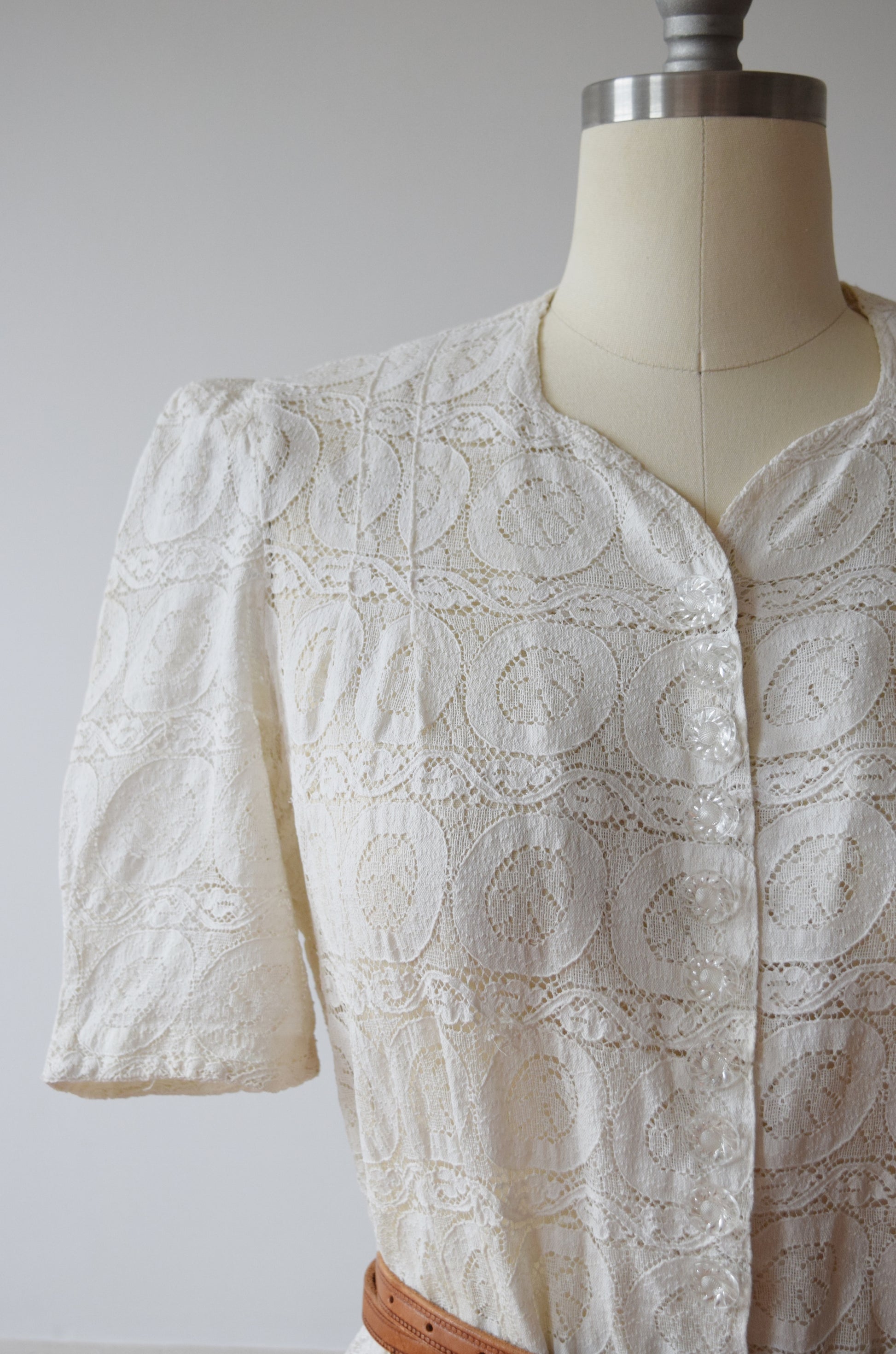 Interesting O-pattern lace, with decorative glass buttons down the bodice, lightly padded sleeves, pretty dart and pintuck detailing on bodice, sleeves, and skirt. (belt not included).