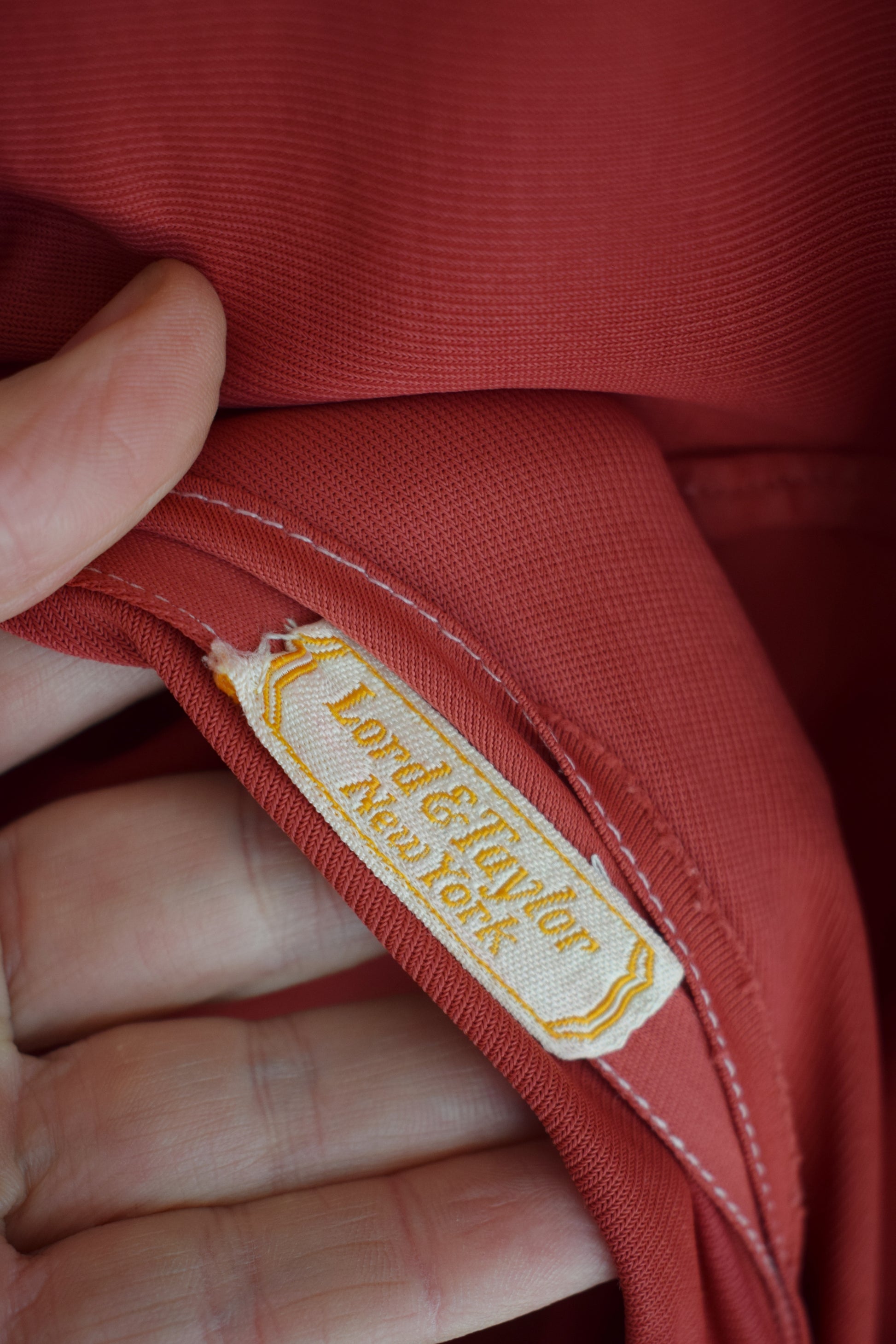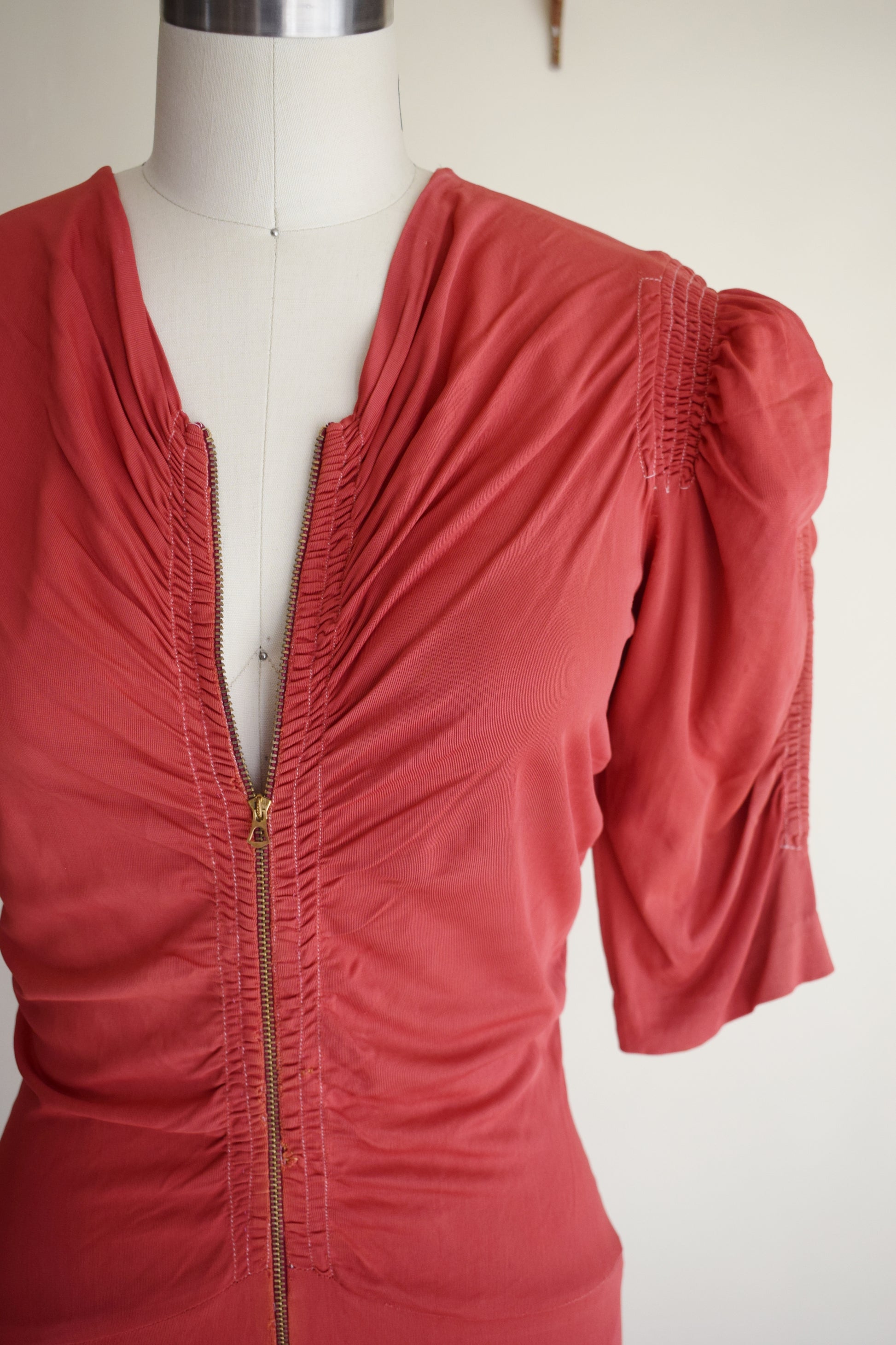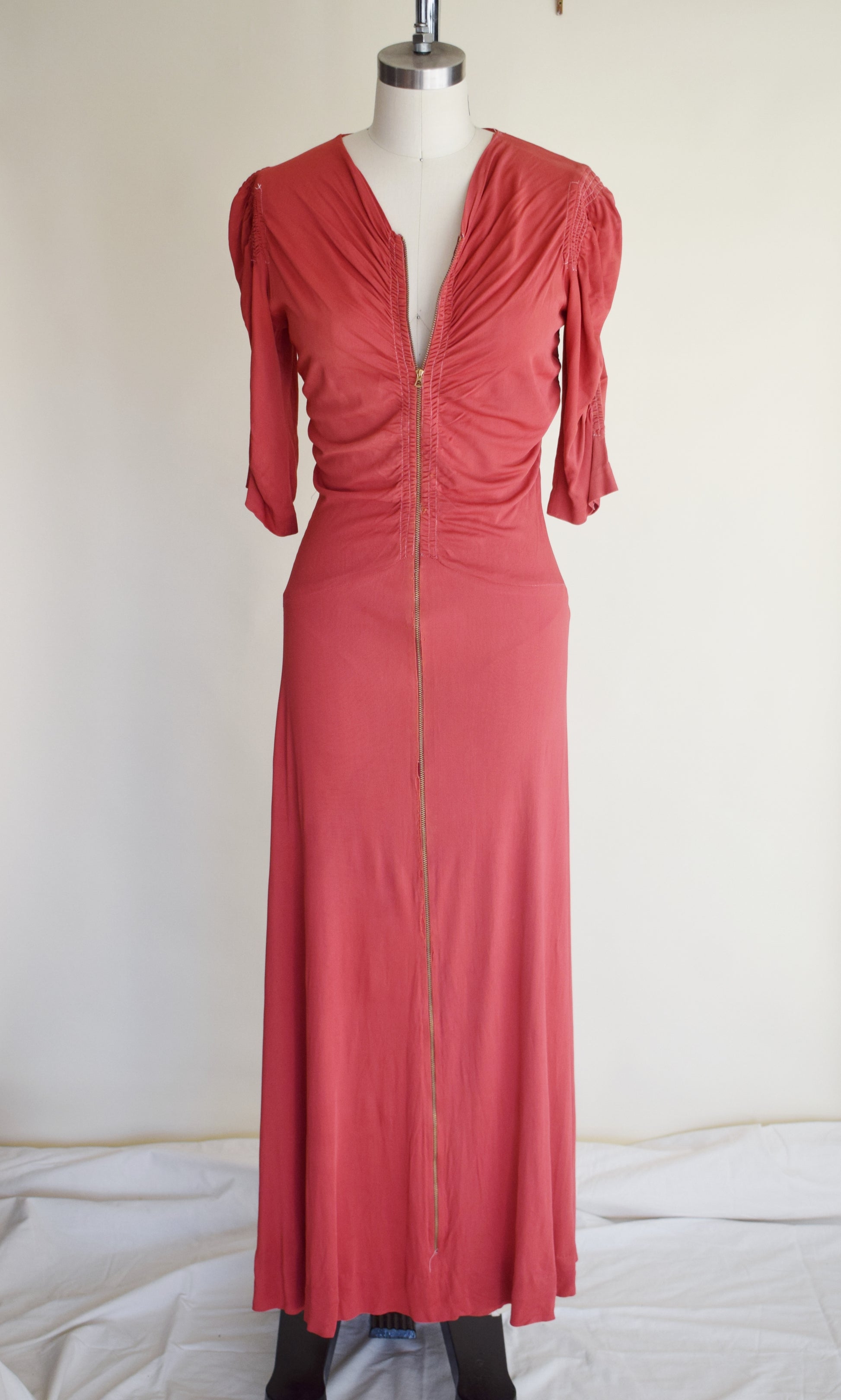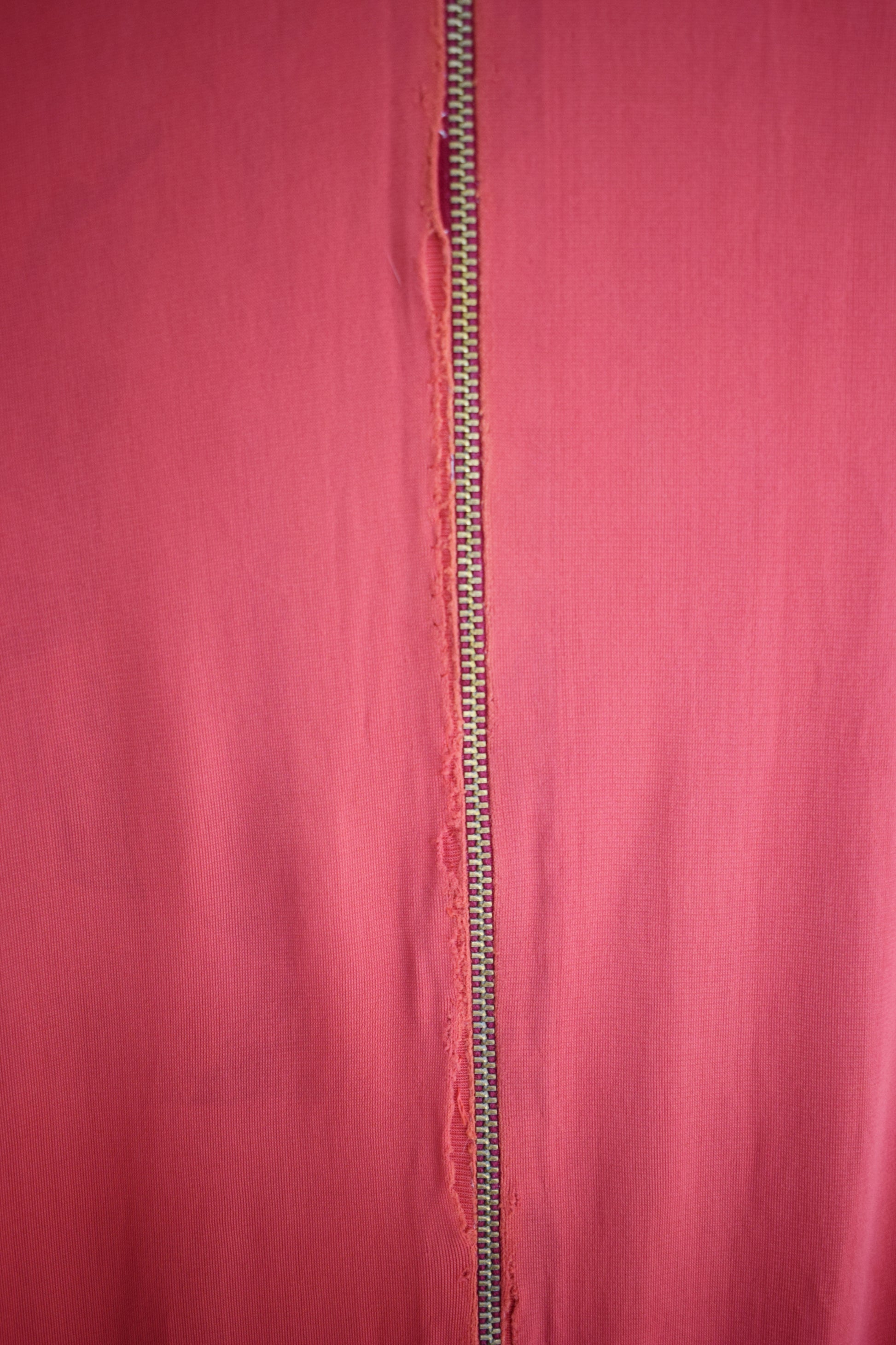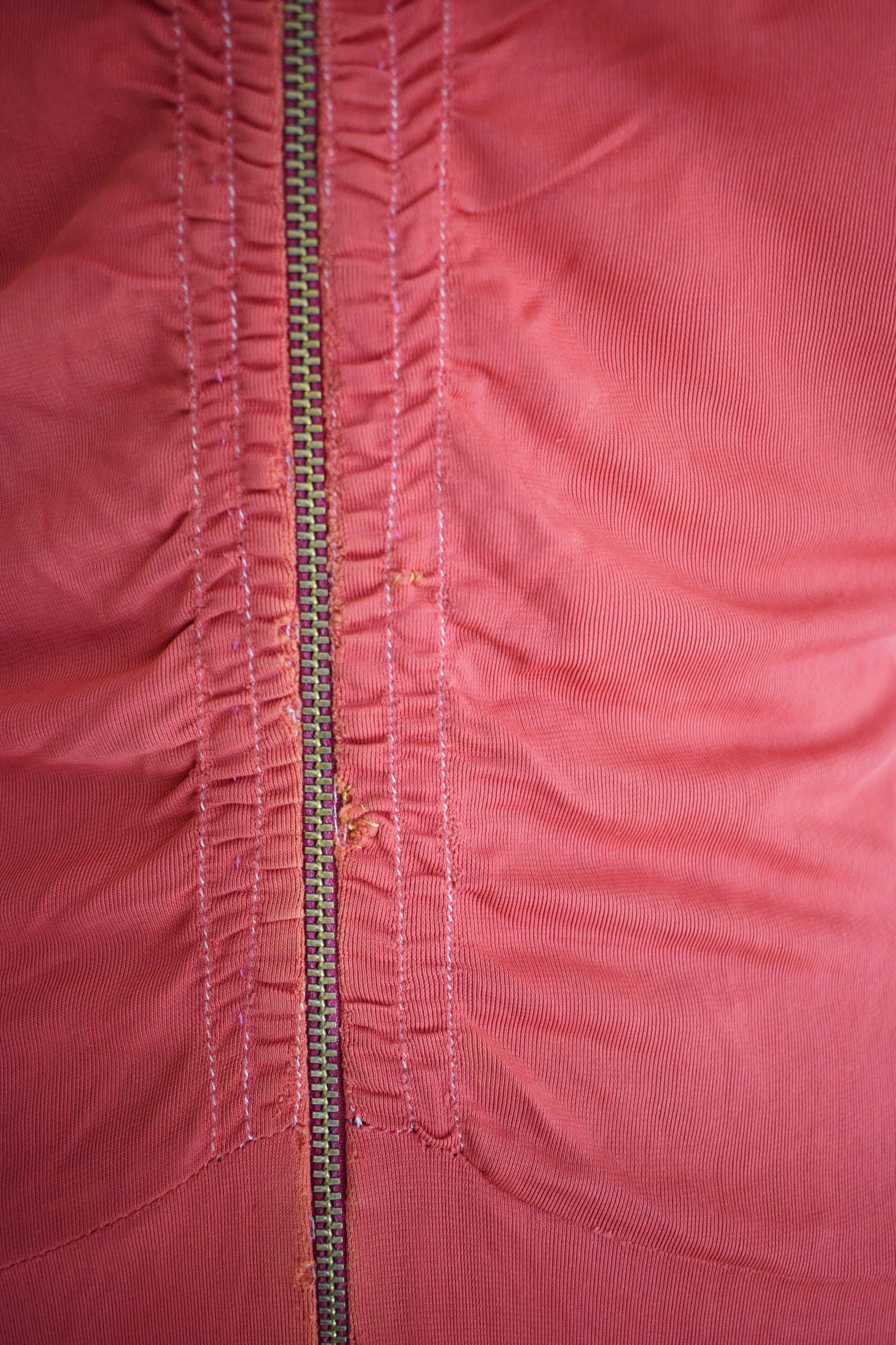 rosy-mauve stretchy nylon jersey with brass bell-pull Talon zipper all the way down the front. gathered bodice/sleeve details. color is a tad cooler in person.