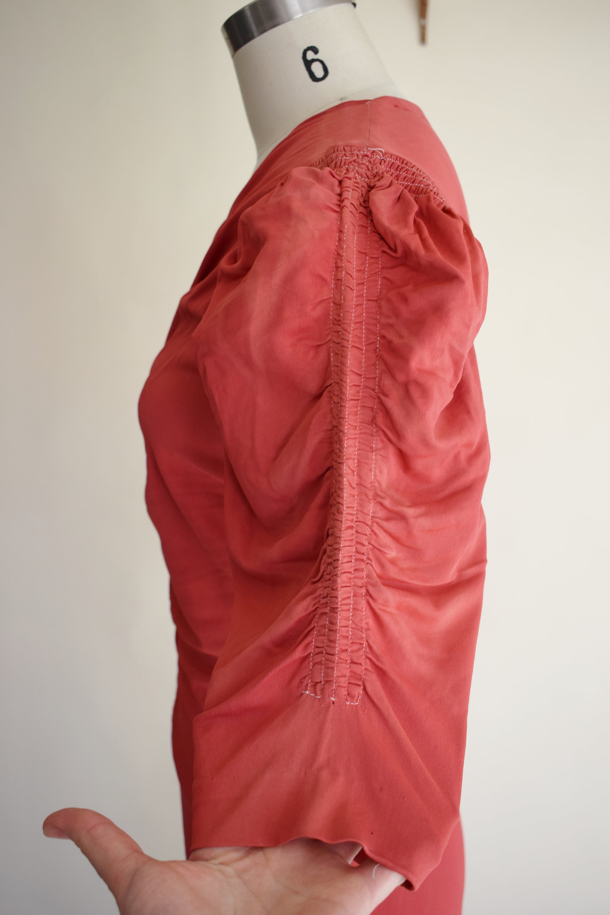 fair condition. signs of wear throughout, some fade to shoulders/sleeves. notable wear and mends to fabric along right side of zipper (some wear on left side as well). dress taken up about 2 1/2" at the hem, could be let down.