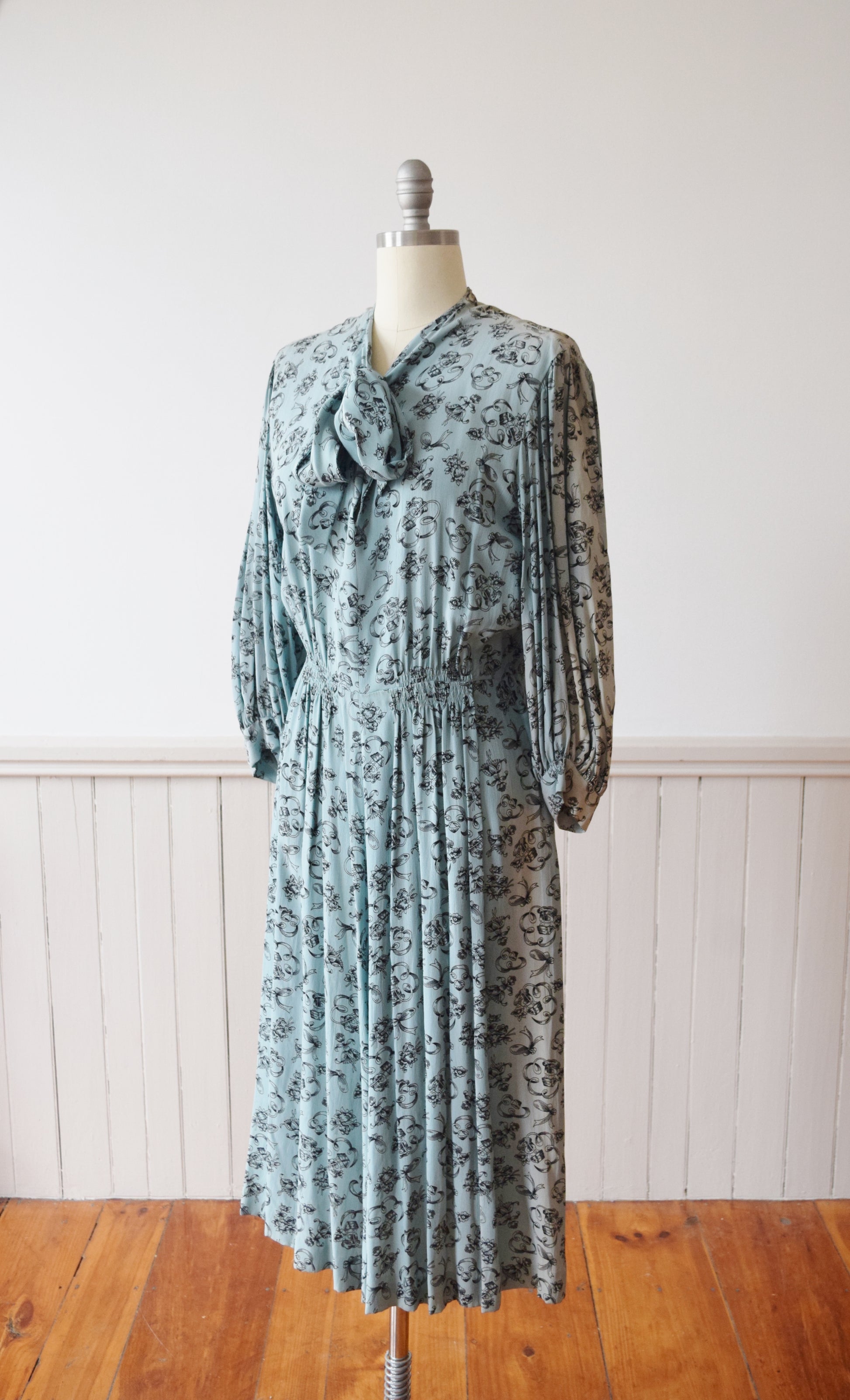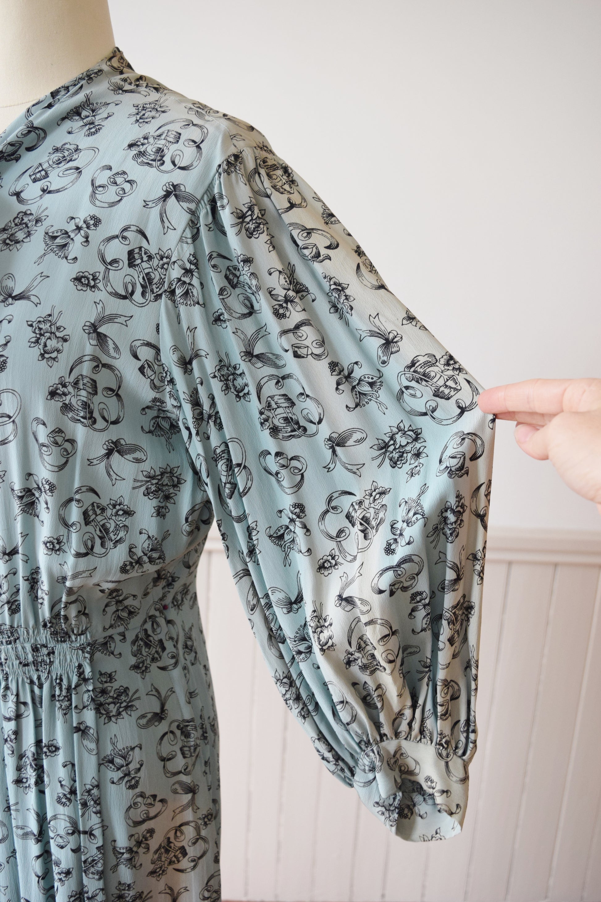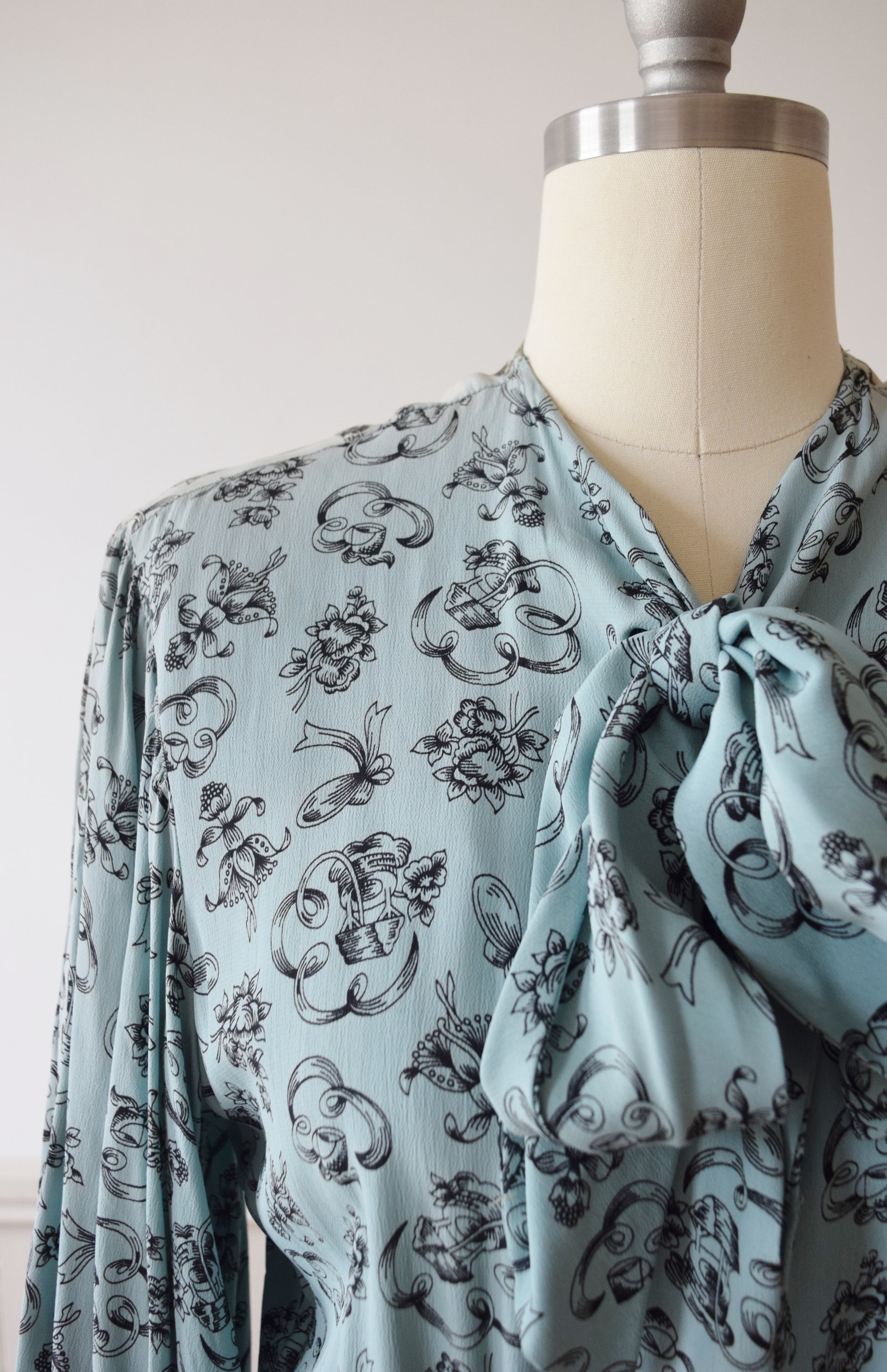 cold rayon in robin's egg blue with ink-drawing style print of wells, buckets, bonnets, and flowers (some of whom appear to be dancing) with lots of scrolling, looping accents. blouson bodice with ¾ length bishop sleeves and neck ties/bow. shirred waist detail, and flattering draped/gathered skirt front.
