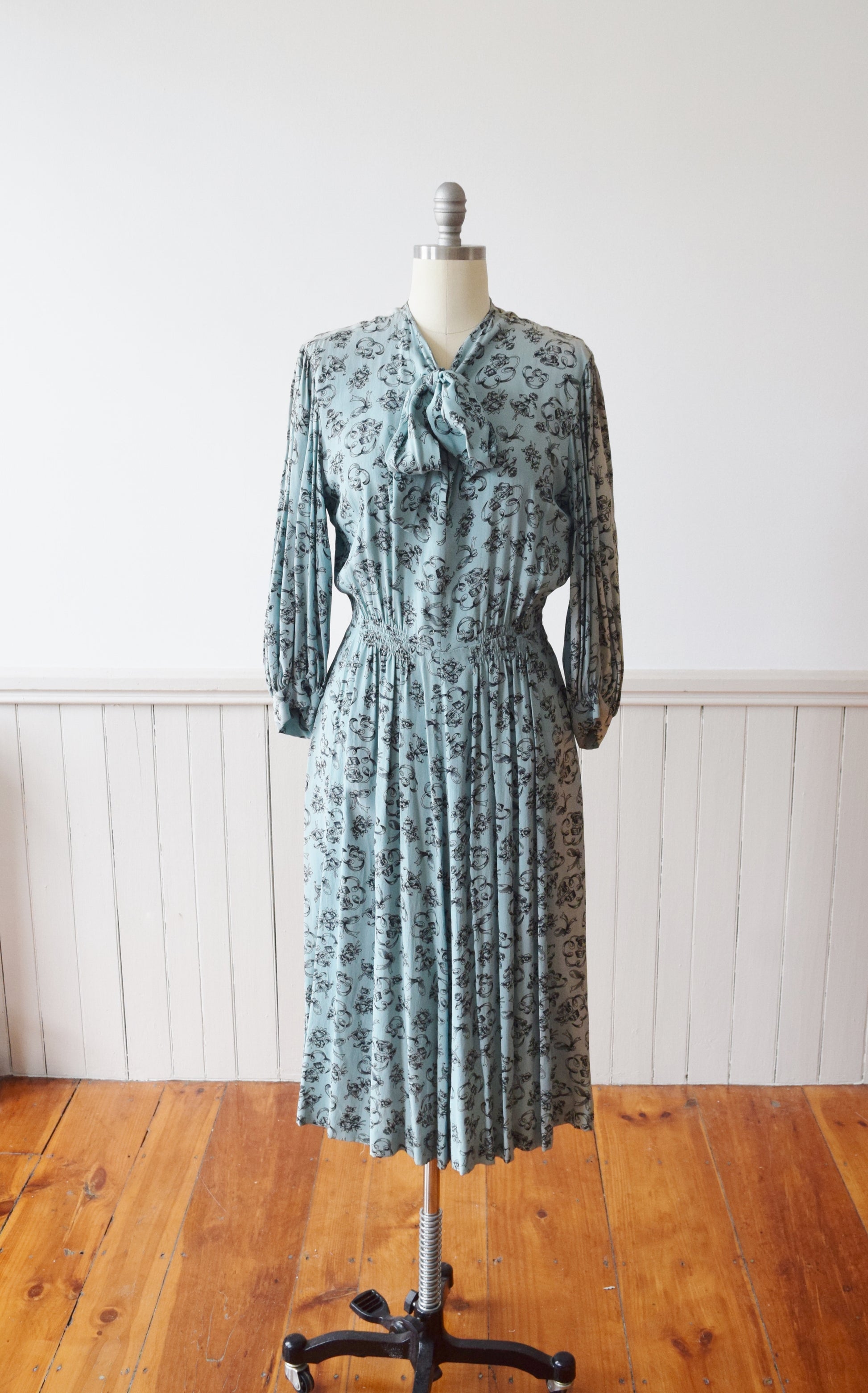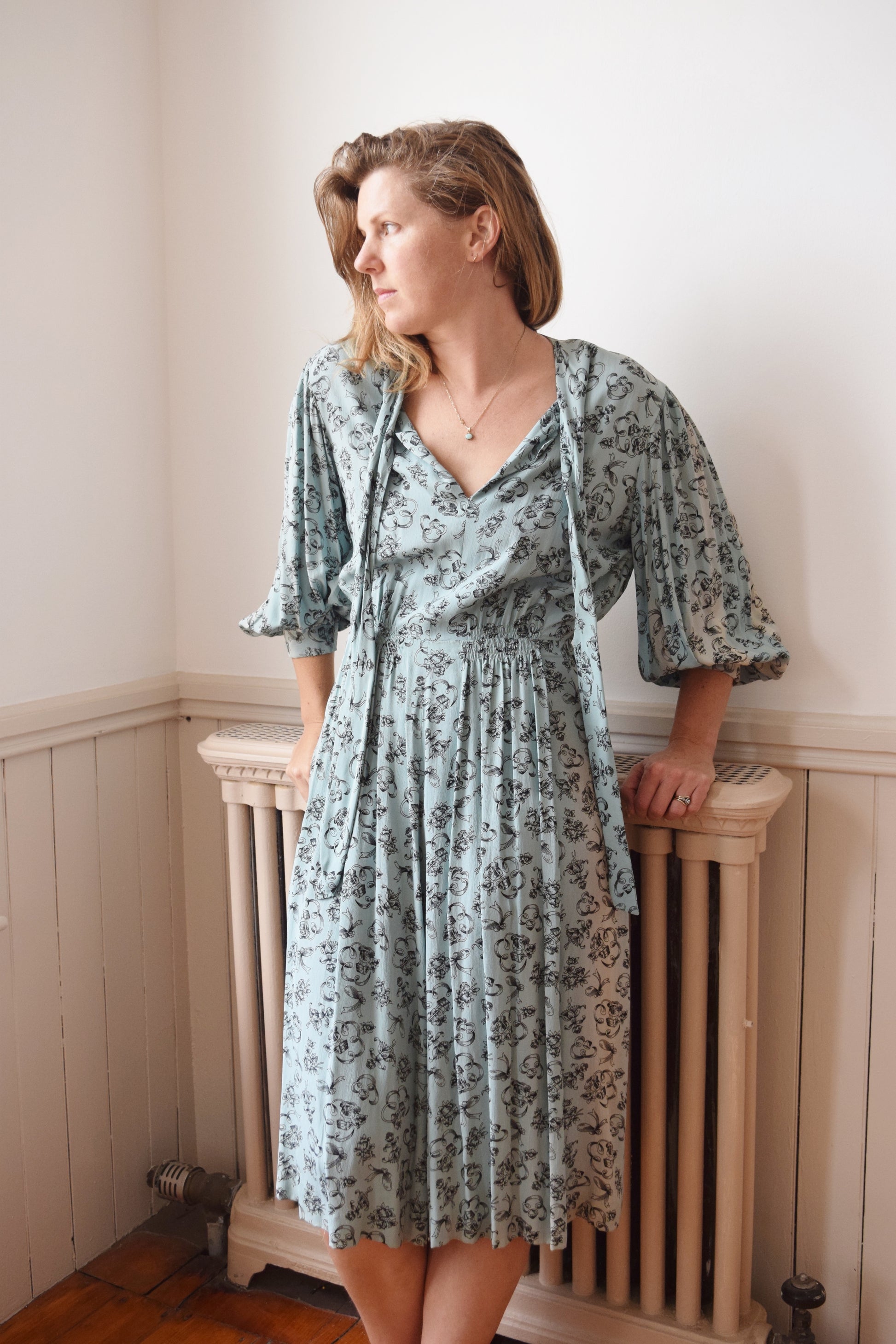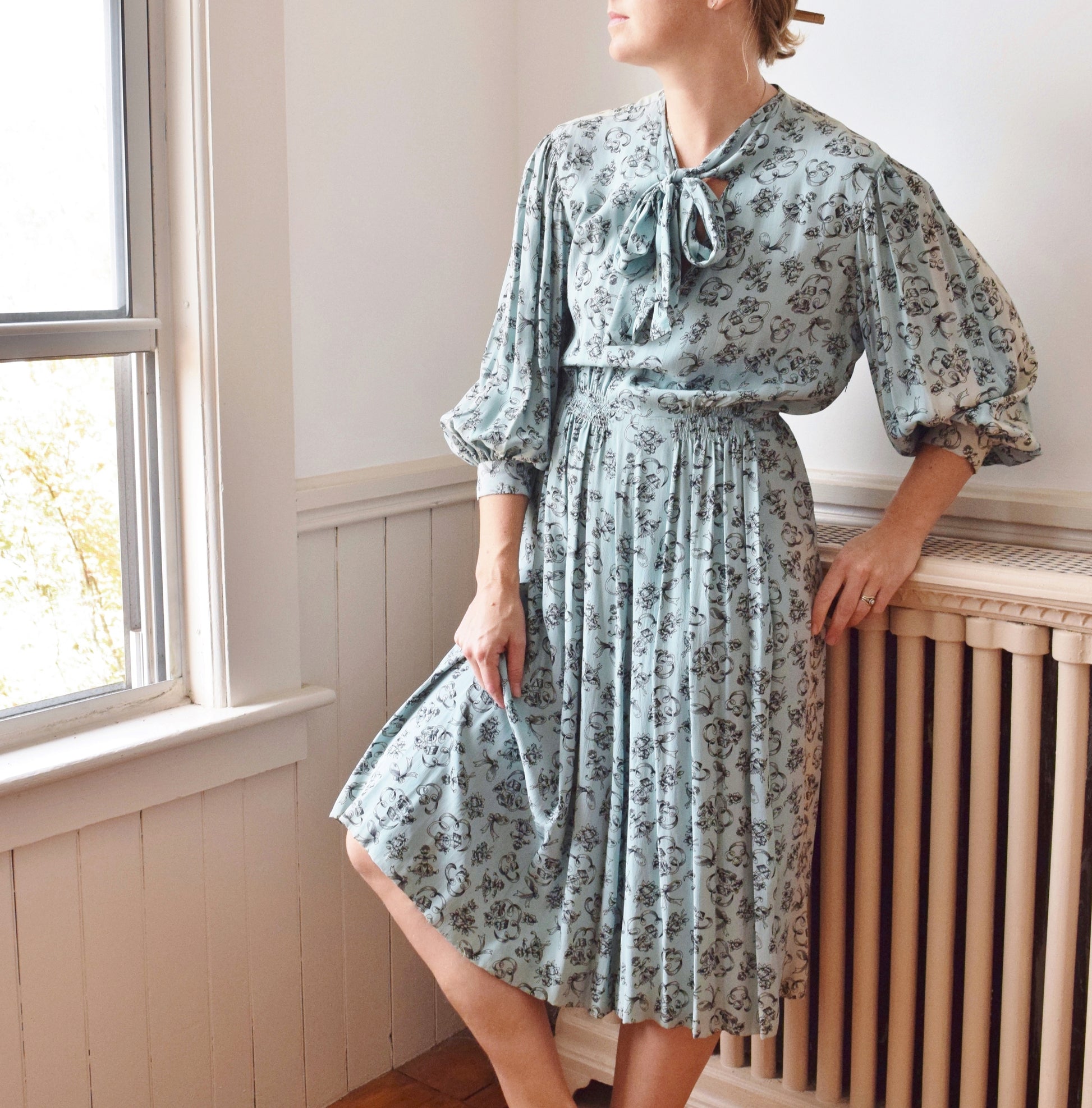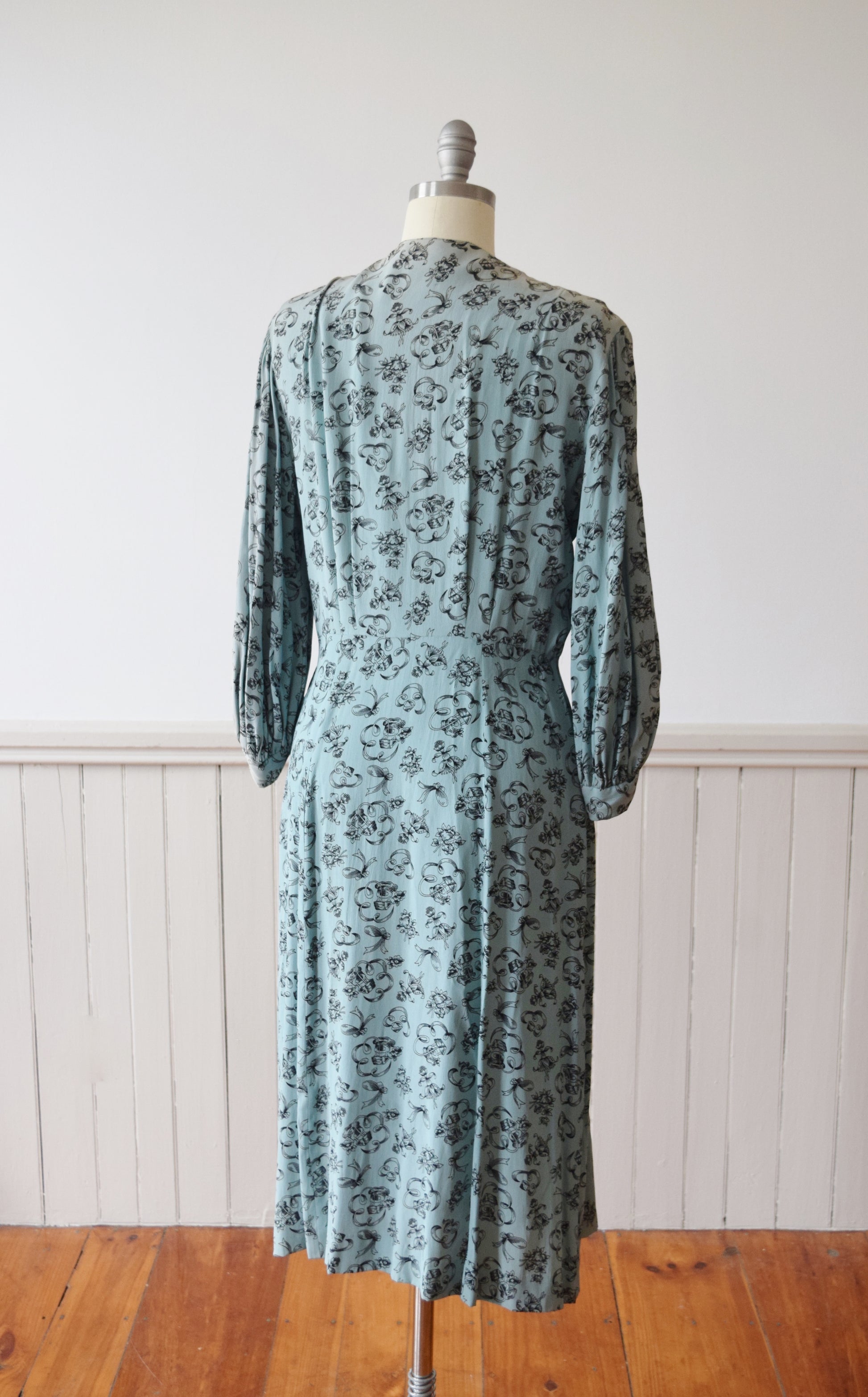cold rayon in robin's egg blue with ink-drawing style print of wells, buckets, bonnets, and flowers (some of whom appear to be dancing) with lots of scrolling, looping accents. blouson bodice with ¾ length bishop sleeves and neck ties/bow. shirred waist detail, and flattering draped/gathered skirt front.