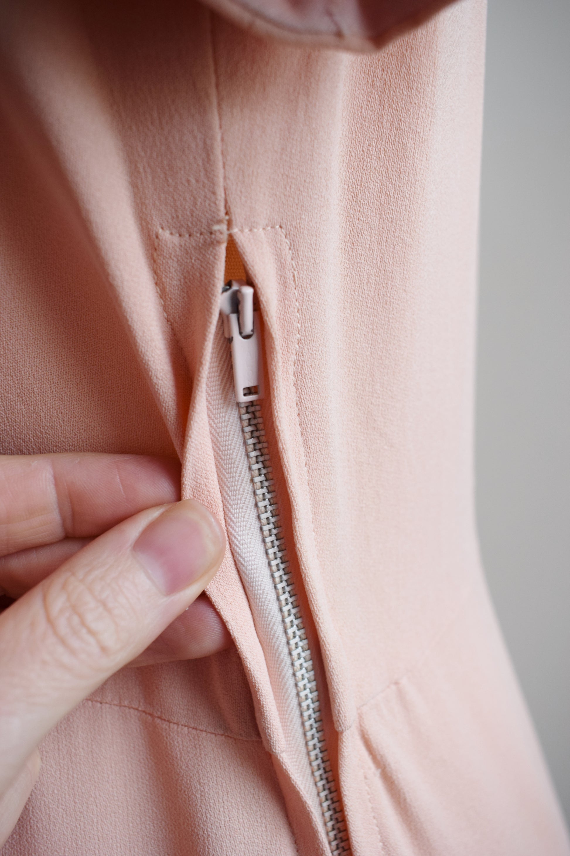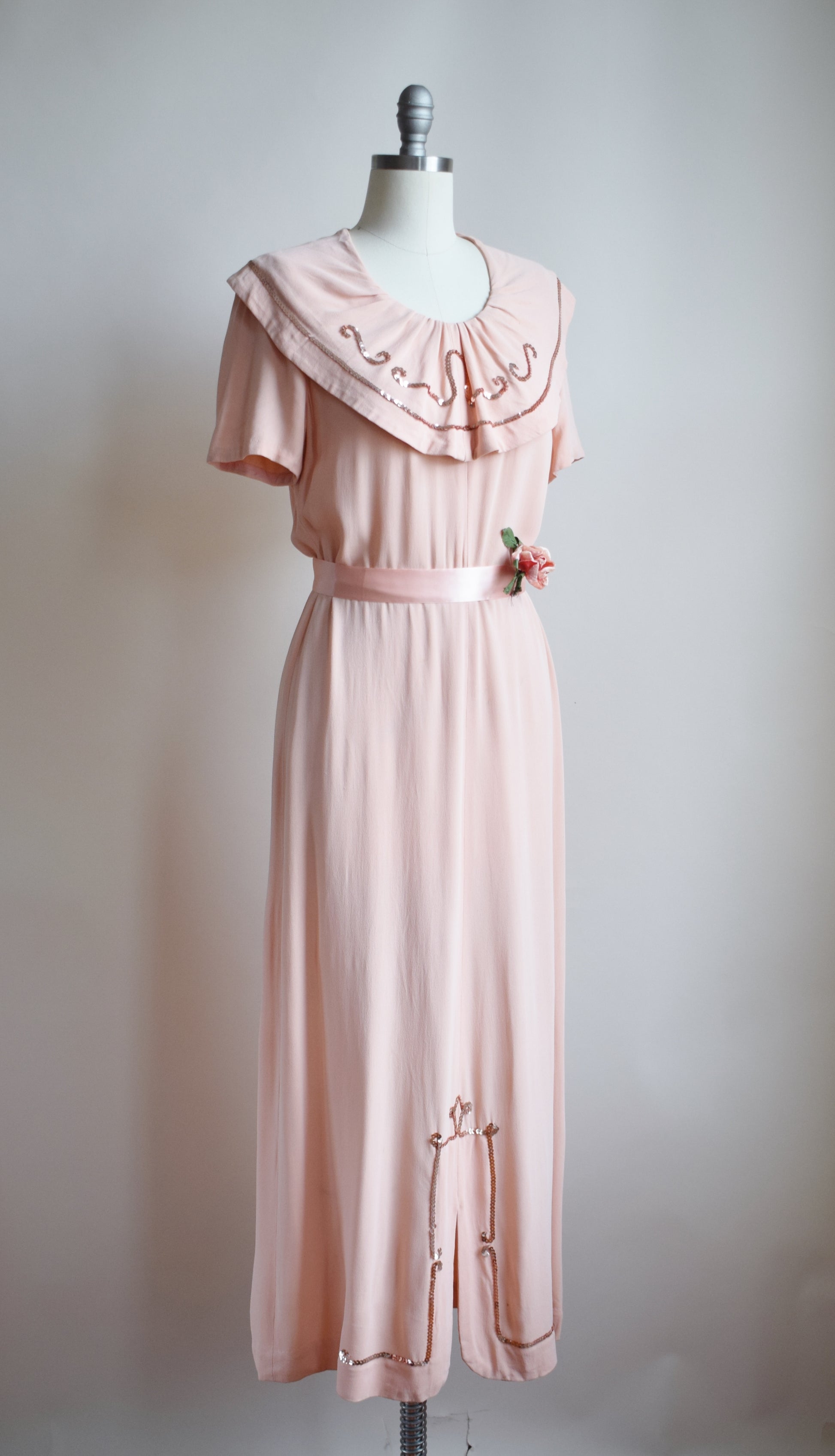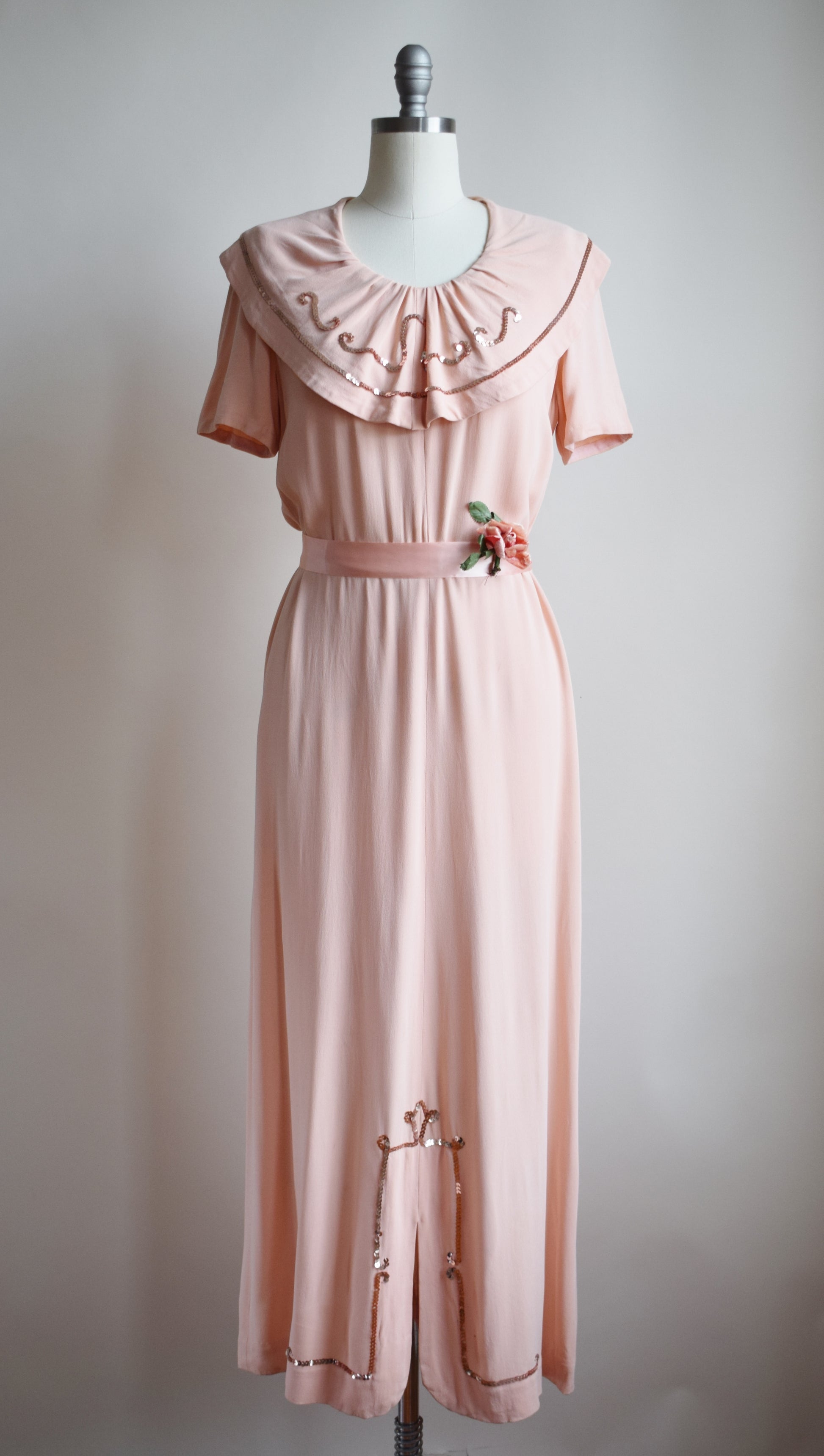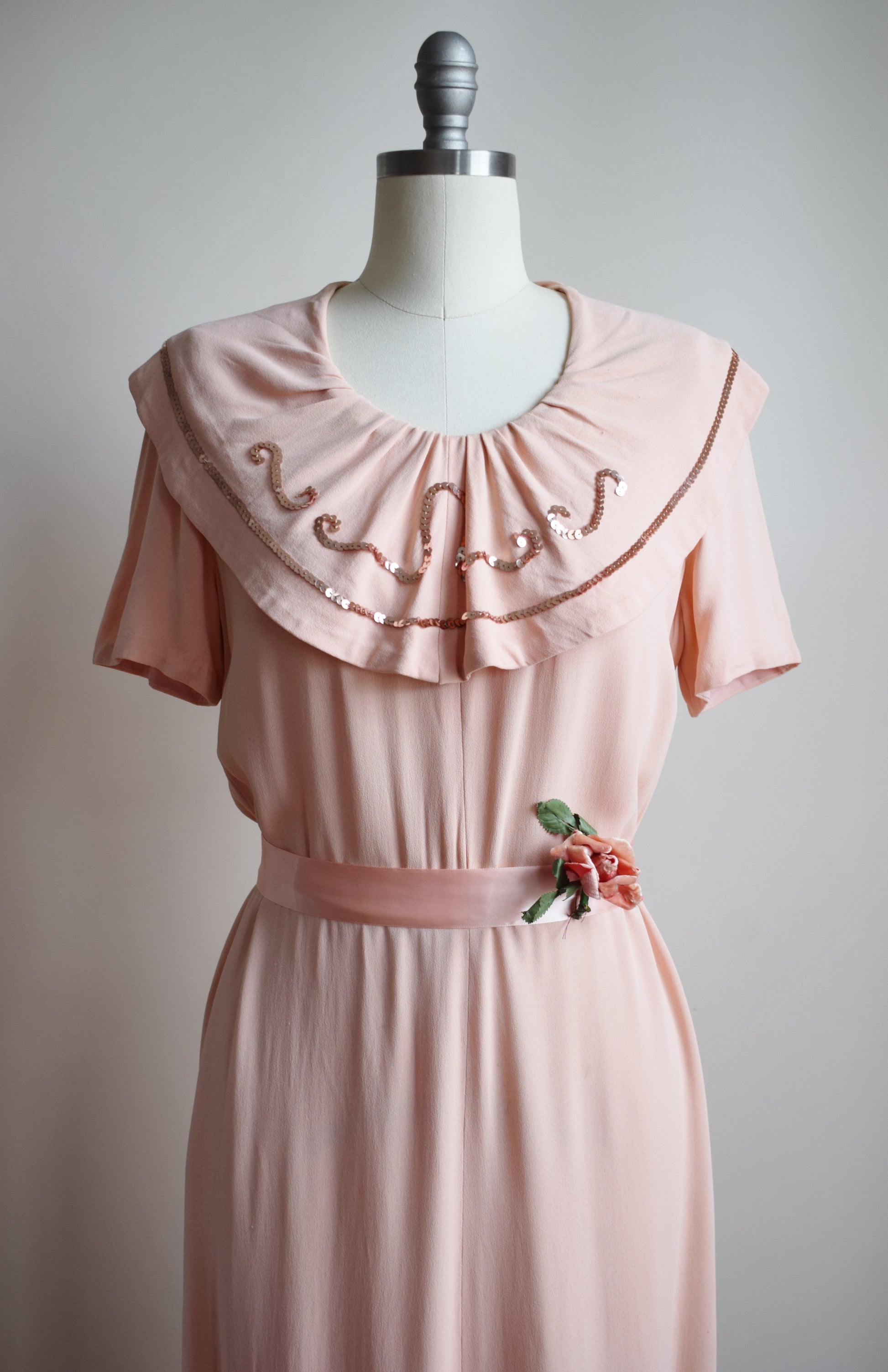peachy pink matte rayon with playful wide sequin-accented ruffle collar, and column skirt with sequin-accented center front slit. pink metal Talon side zipper. ribbon belt and flower not original, but ribbon can be included on request (just add to order comments :)) unlabeled.