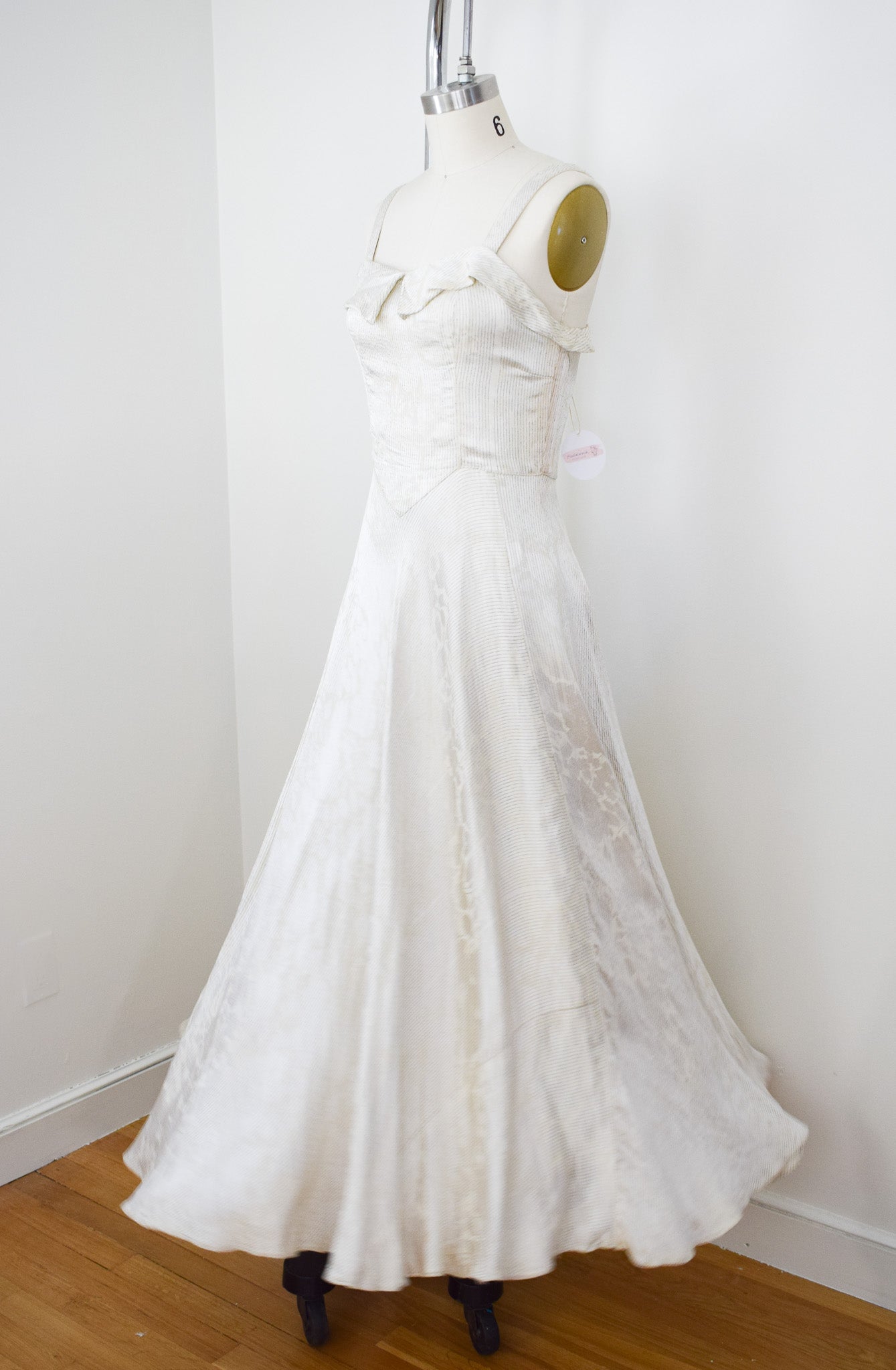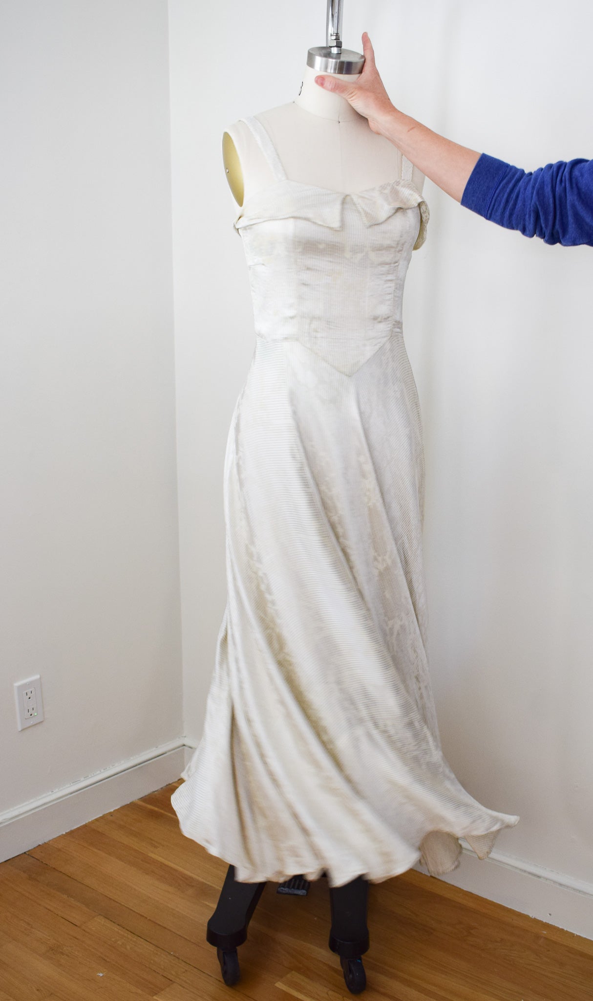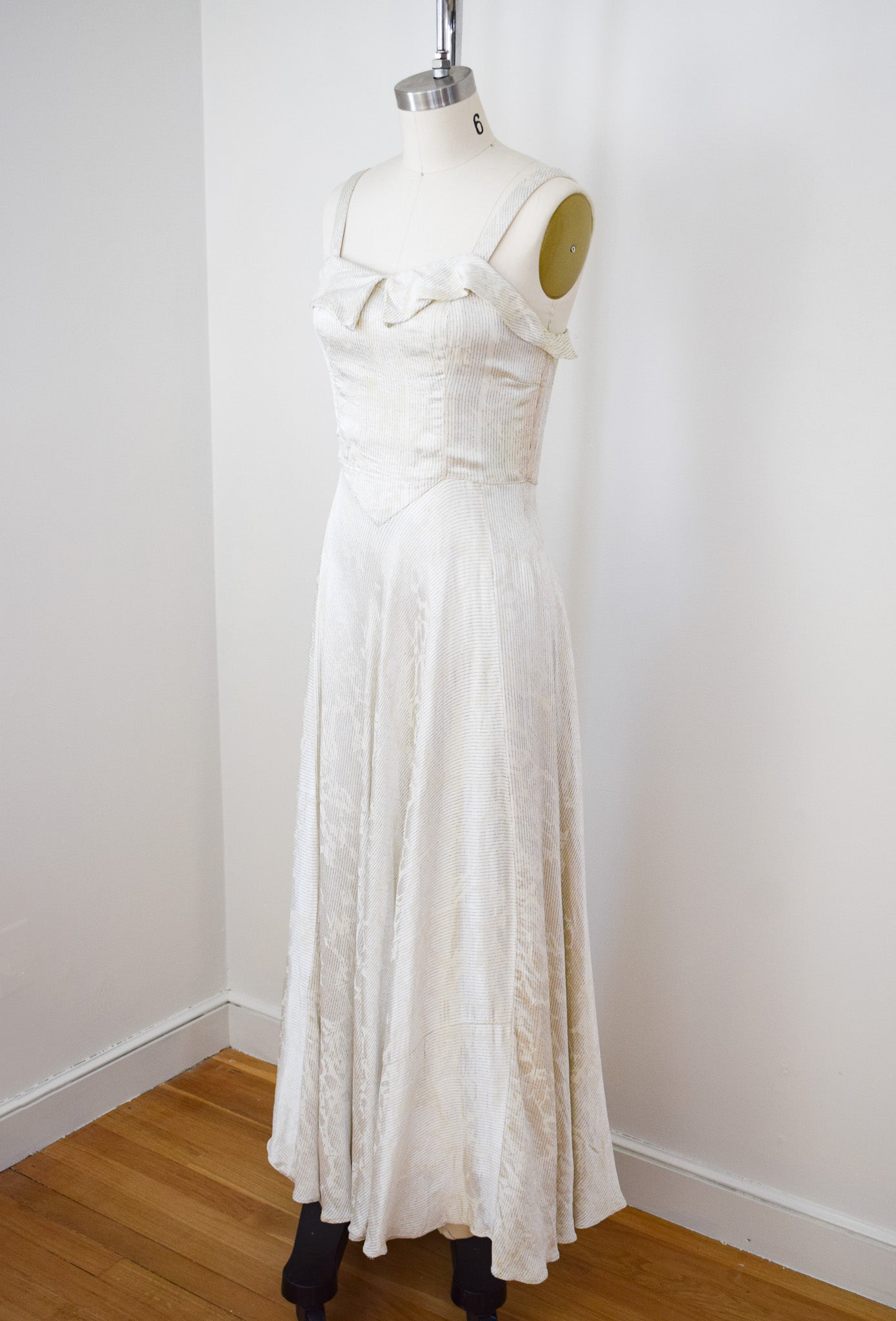 good condition. freshly laundered and sturdy. some scattered flaws. of note: small repair to reattach collar to neckline, some faint discoloration to side seams of bodice caused by metal boning, a couple other small scattered marks on bodice, some minimal losses to lame threads, some faint yellowed storage lines in the skirt that generally get lost in the drape. slightly uneven hem, again, lost in drape. of homemade quality with some little quirks in construction and details.