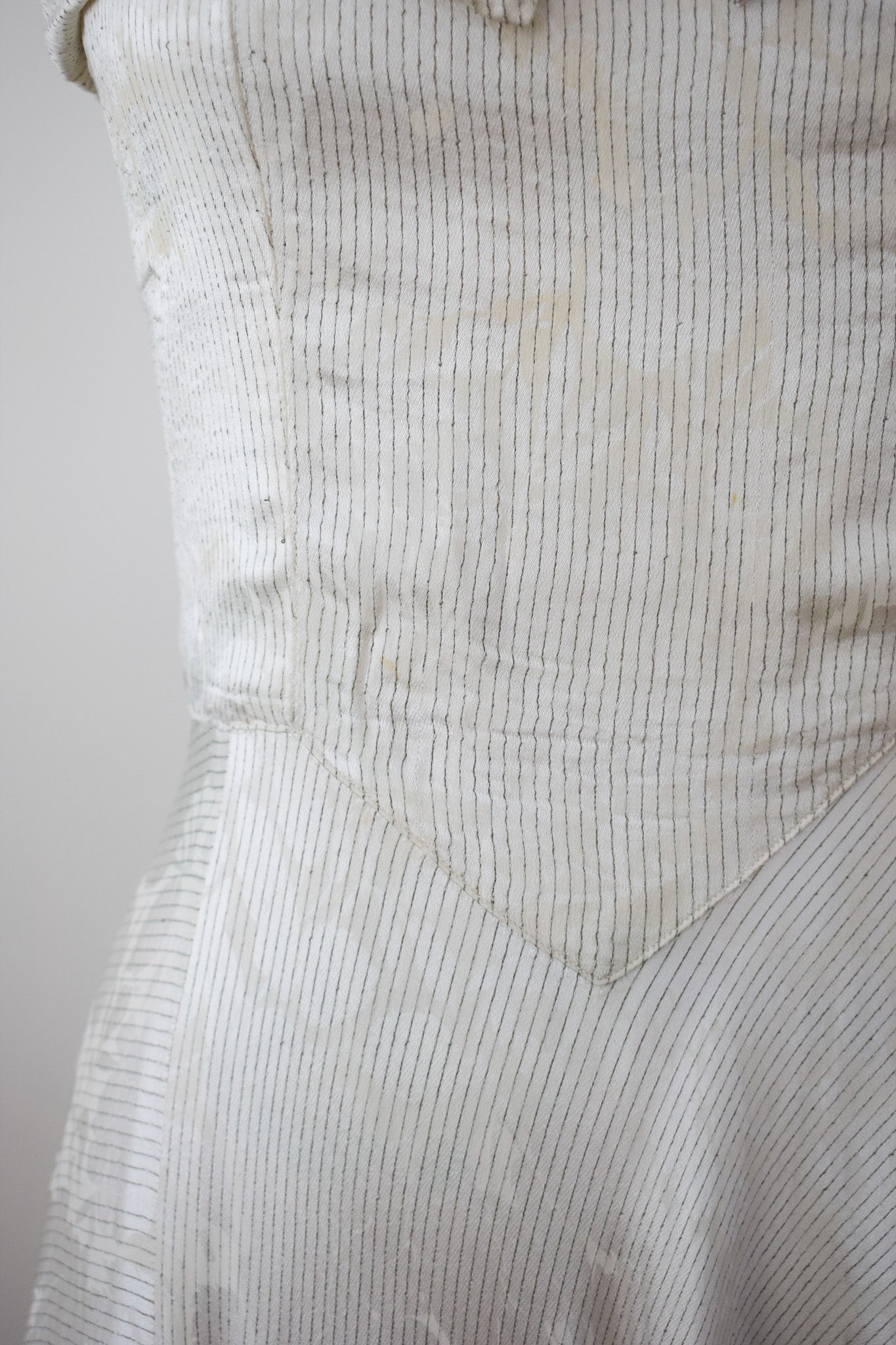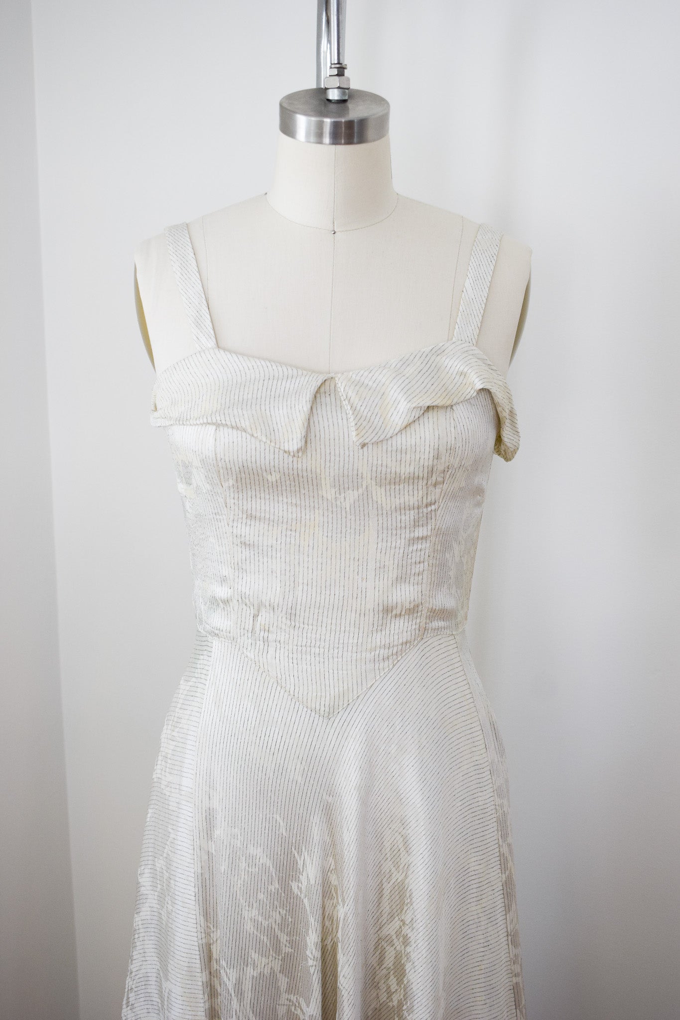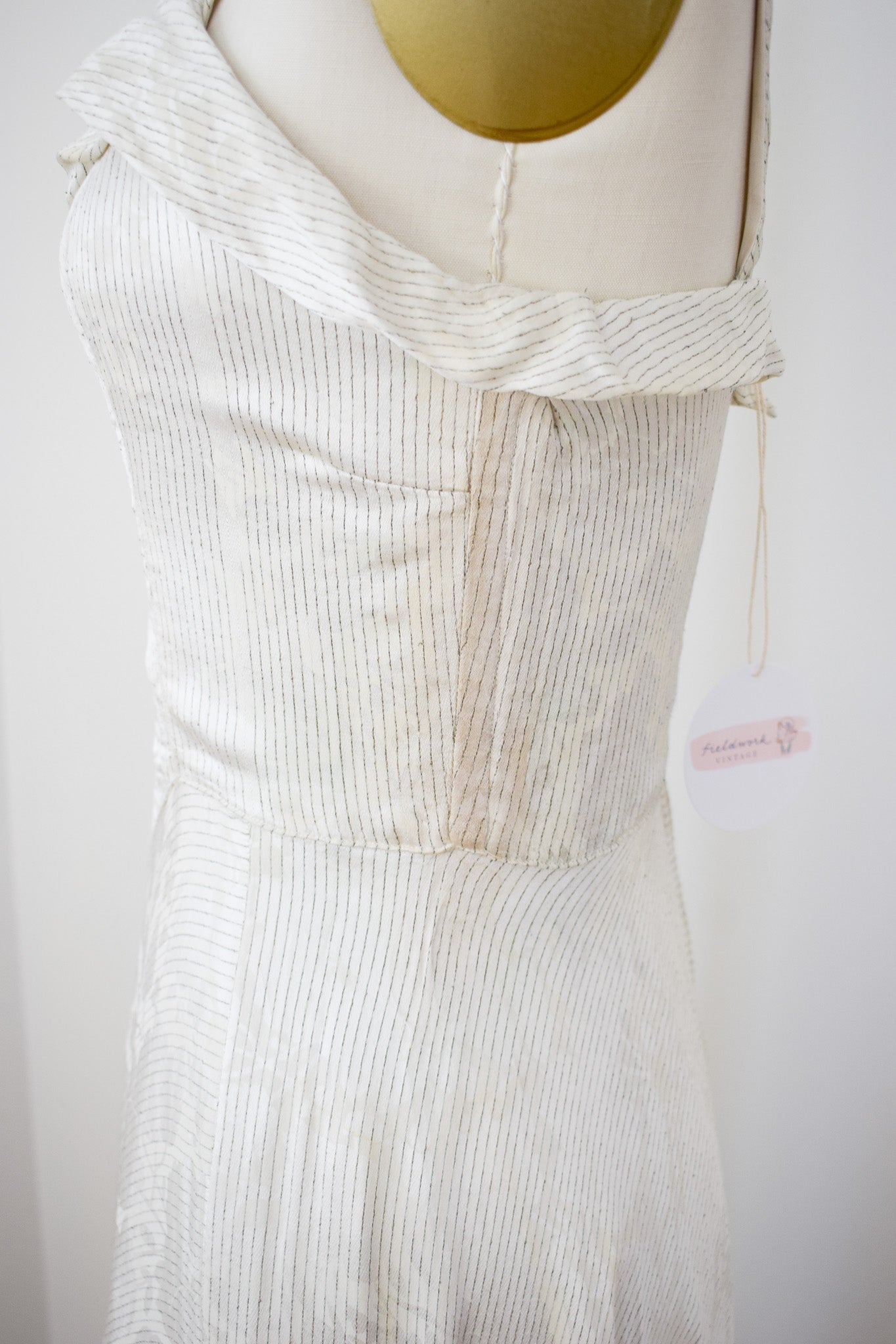 good condition. freshly laundered and sturdy. some scattered flaws. of note: small repair to reattach collar to neckline, some faint discoloration to side seams of bodice caused by metal boning, a couple other small scattered marks on bodice, some minimal losses to lame threads, some faint yellowed storage lines in the skirt that generally get lost in the drape. slightly uneven hem, again, lost in drape. of homemade quality with some little quirks in construction and details.
