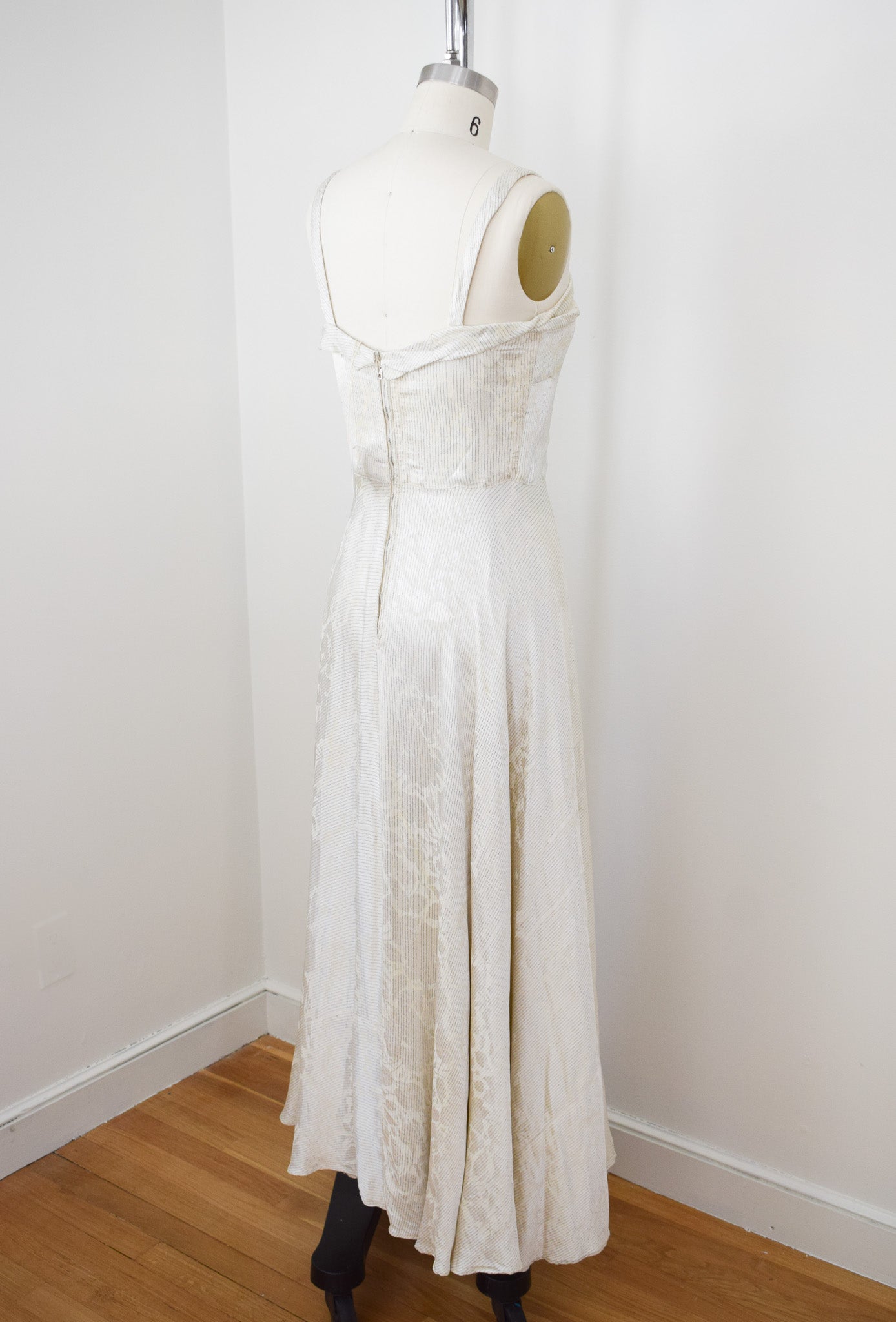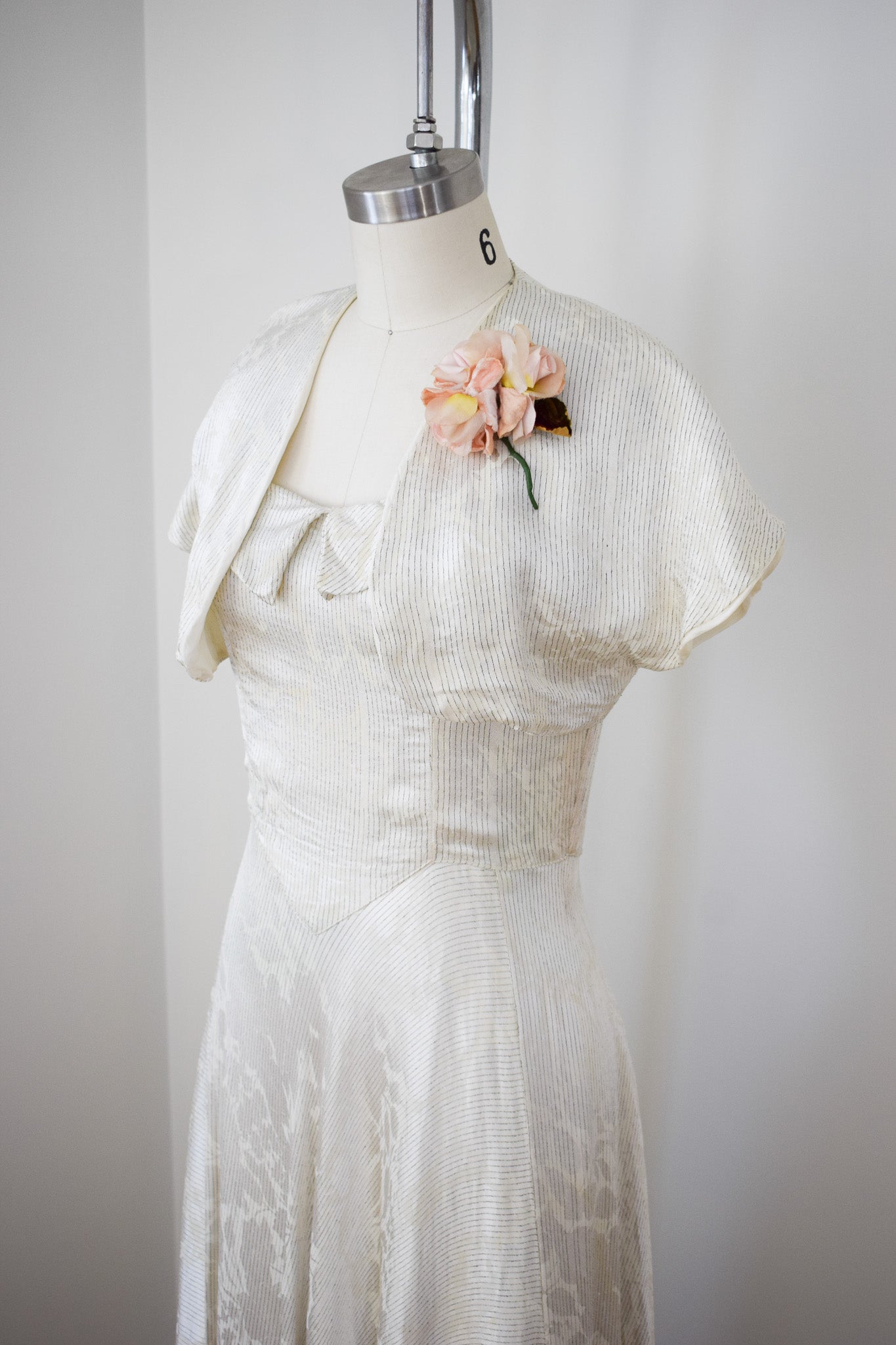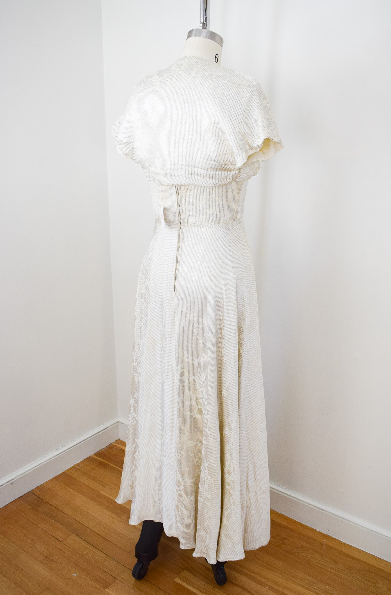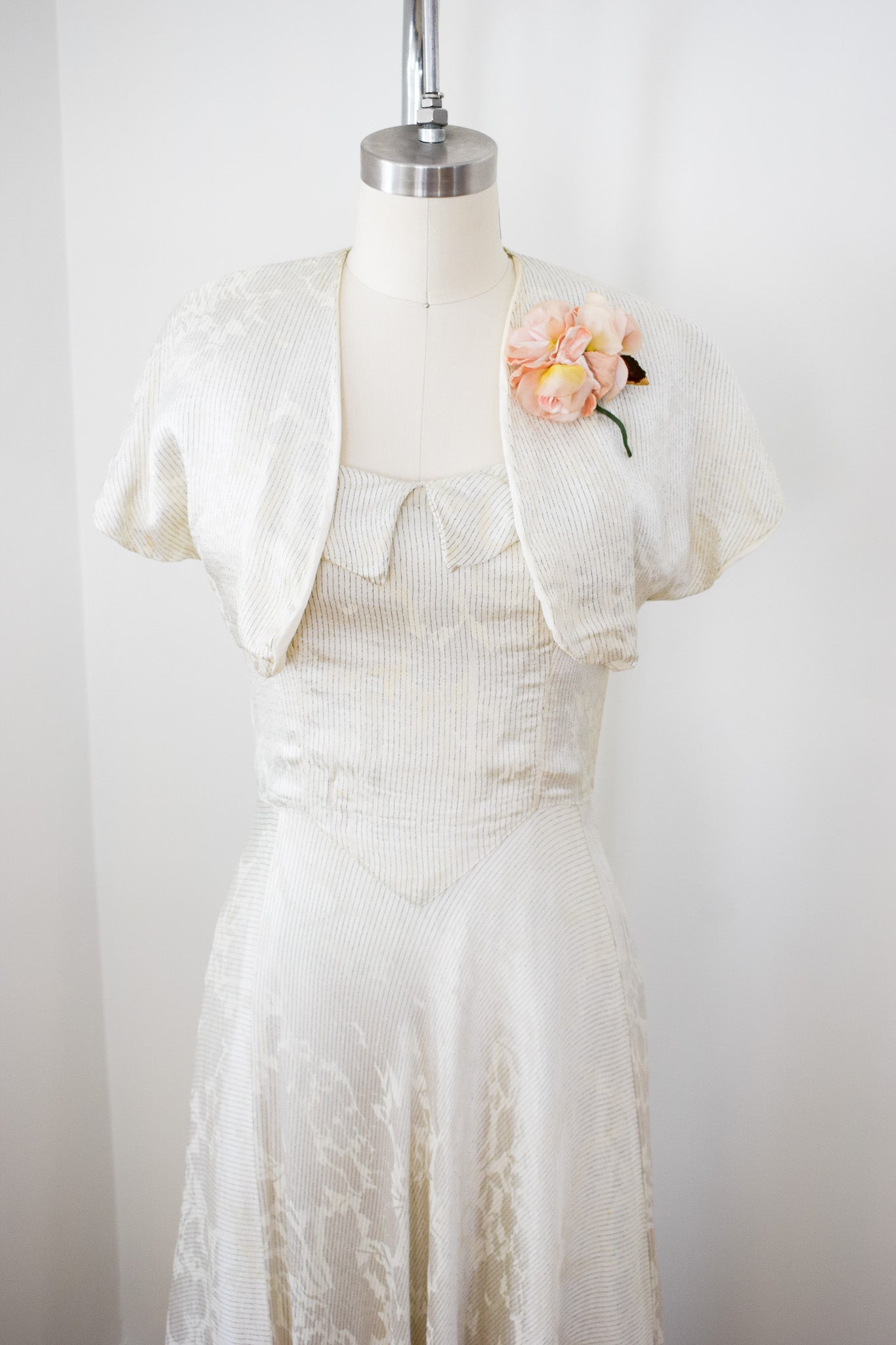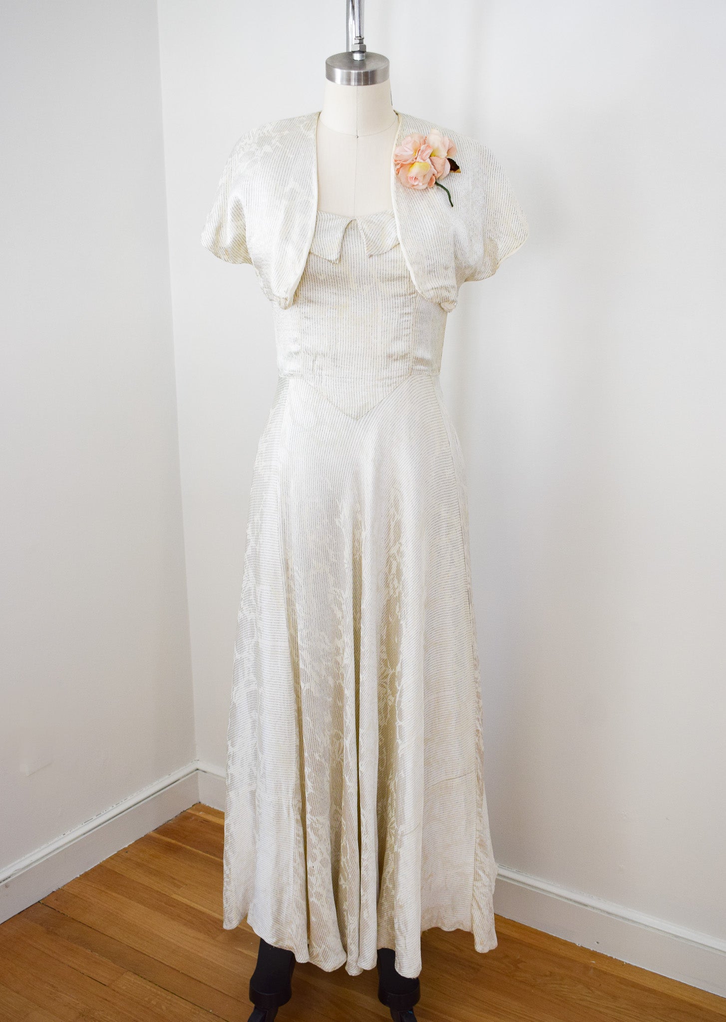 silvery off-white rayon satin with enchanting woven floral design that shifts like a shadow depending on the lighting. woven throughout with stripes of pewter lamé. a really fabulous textile! fitted bodice with collar and boning at the side seams. extremely full sweeping bias cut skirt. metal "V" zip up the back. with matching open-front bolero. all fully lined. corsage not included.