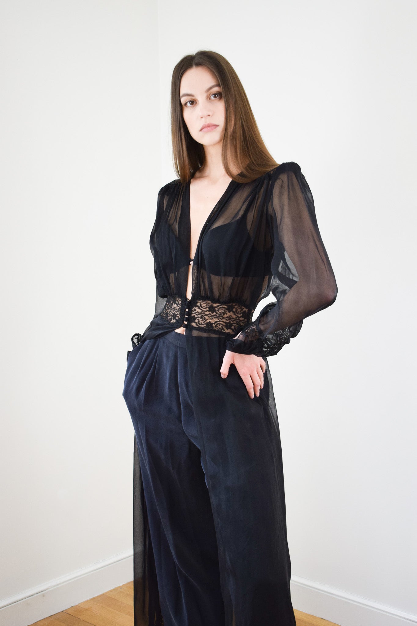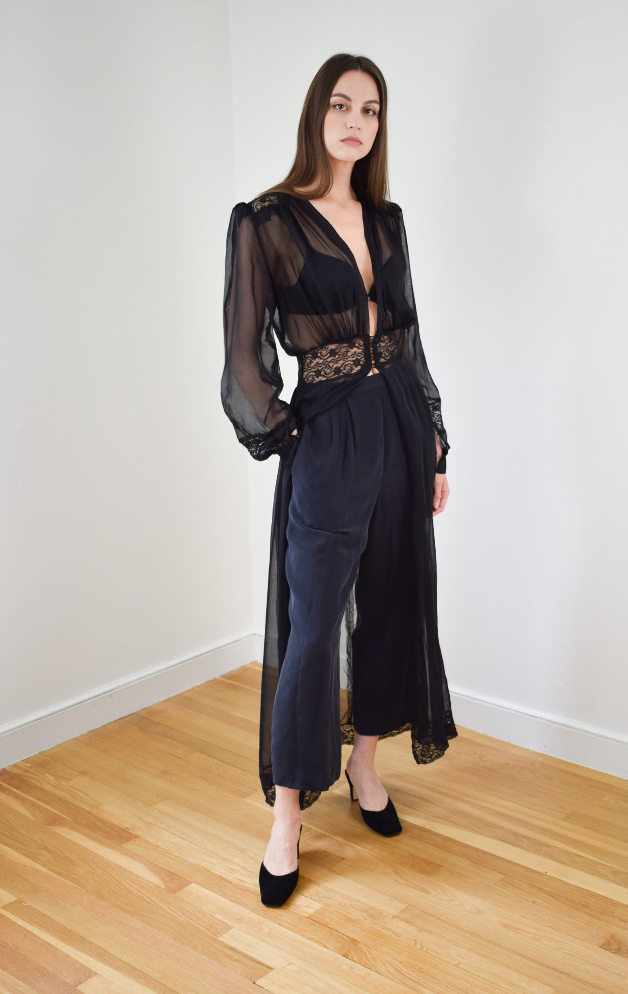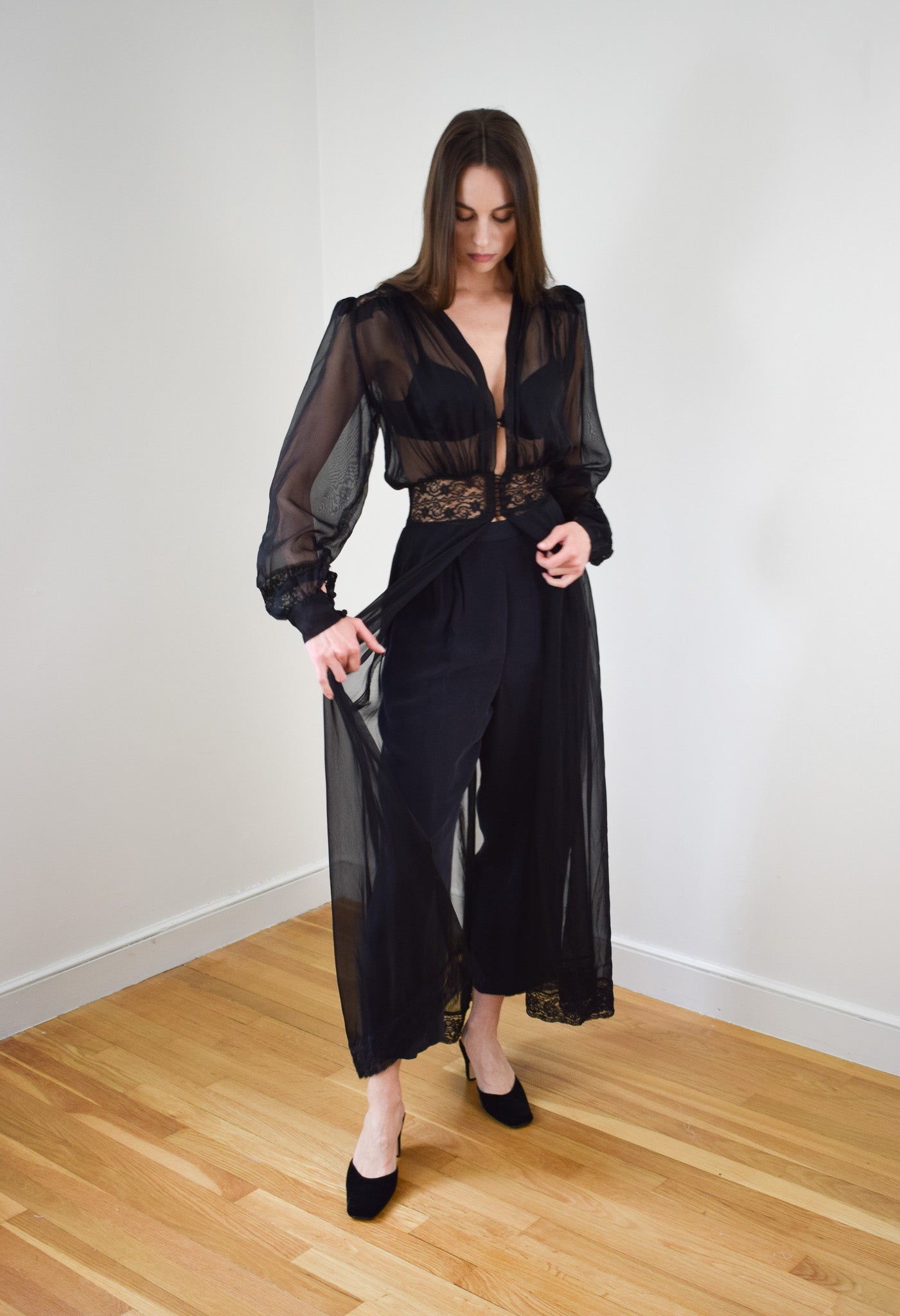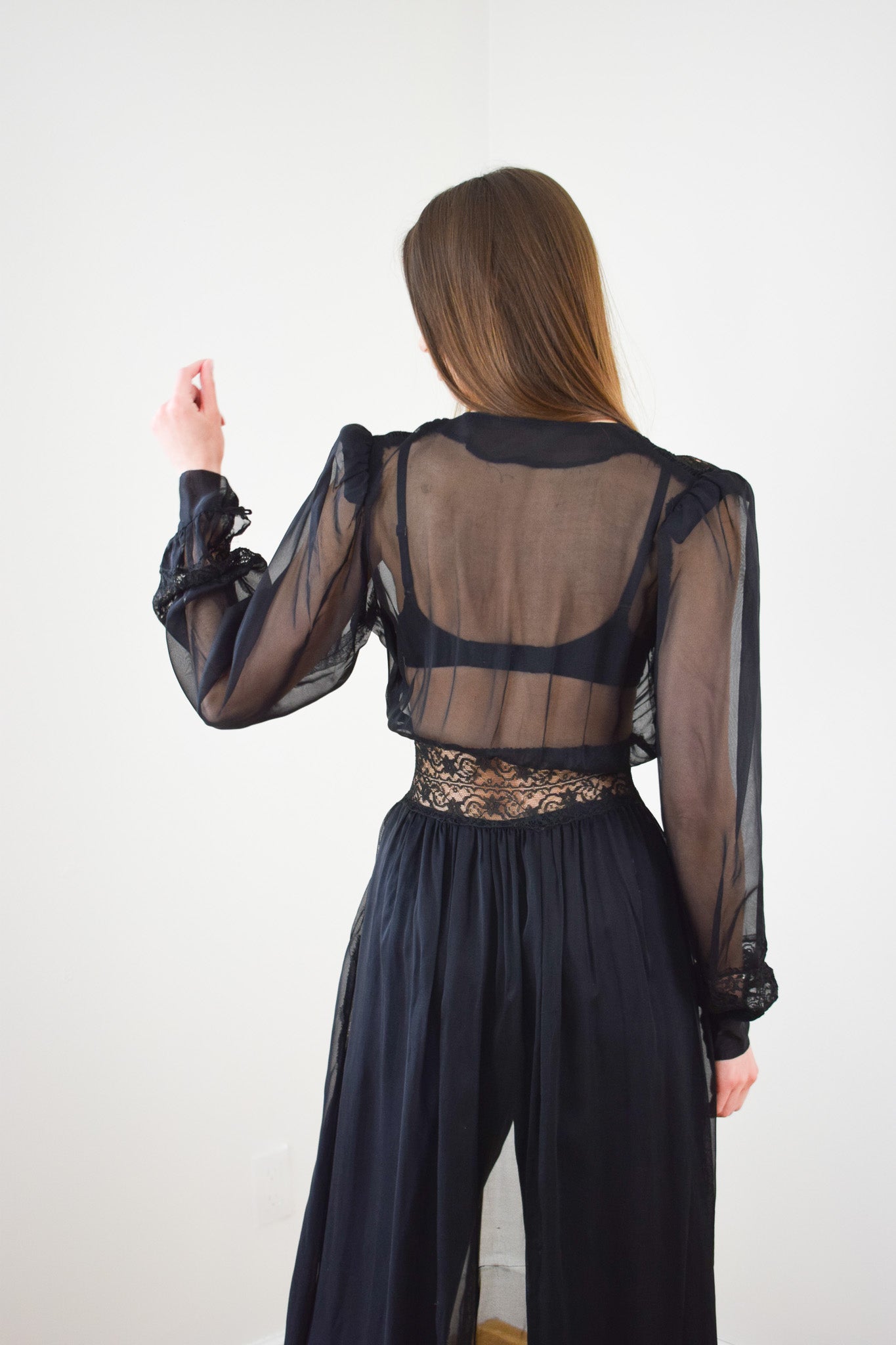 sheer black nylon with lace accents. billowy bishop sleeves, open front fastens with covered buttons at the fitted waist.