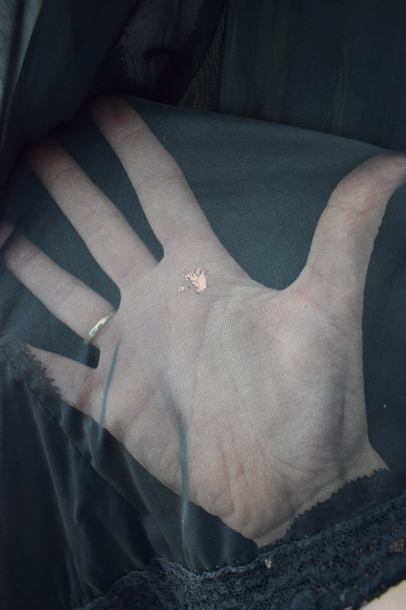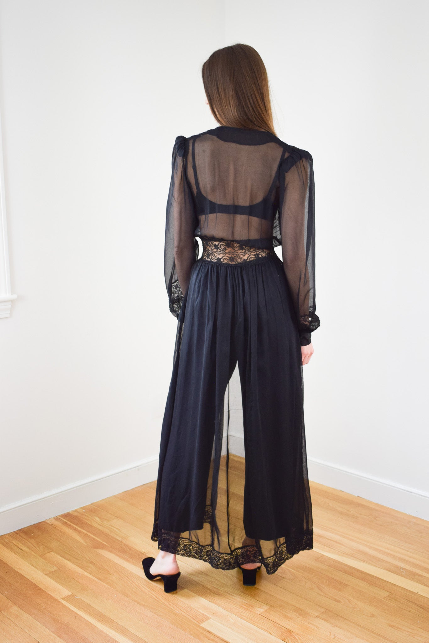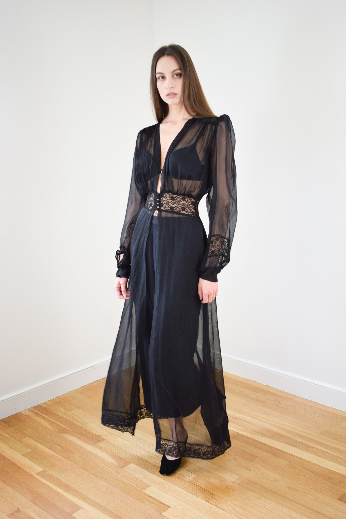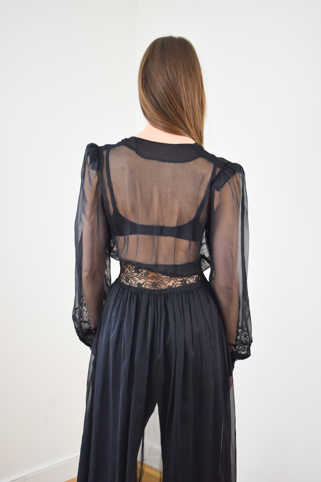 sheer black nylon with lace accents. billowy bishop sleeves, open front fastens with covered buttons at the fitted waist.
