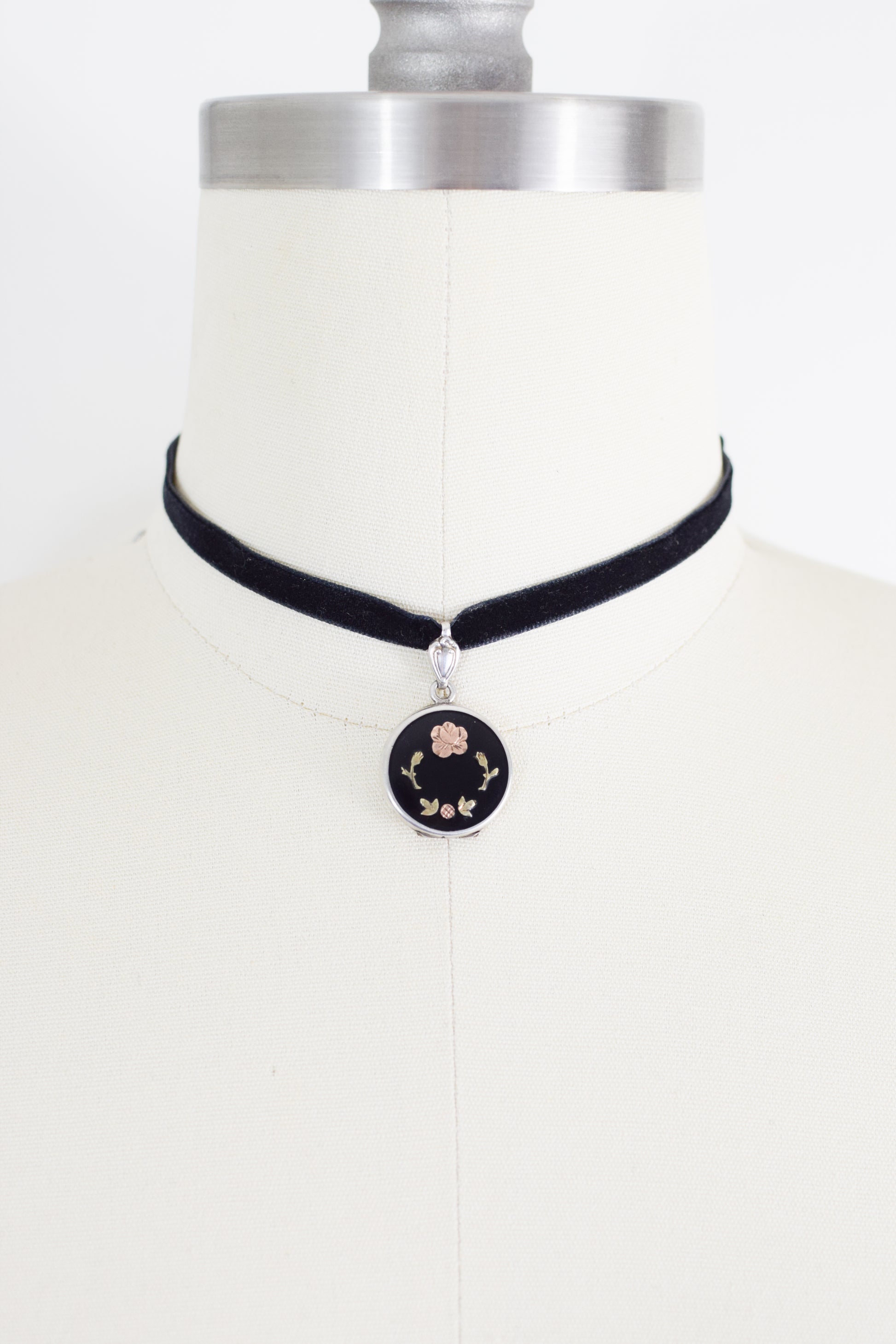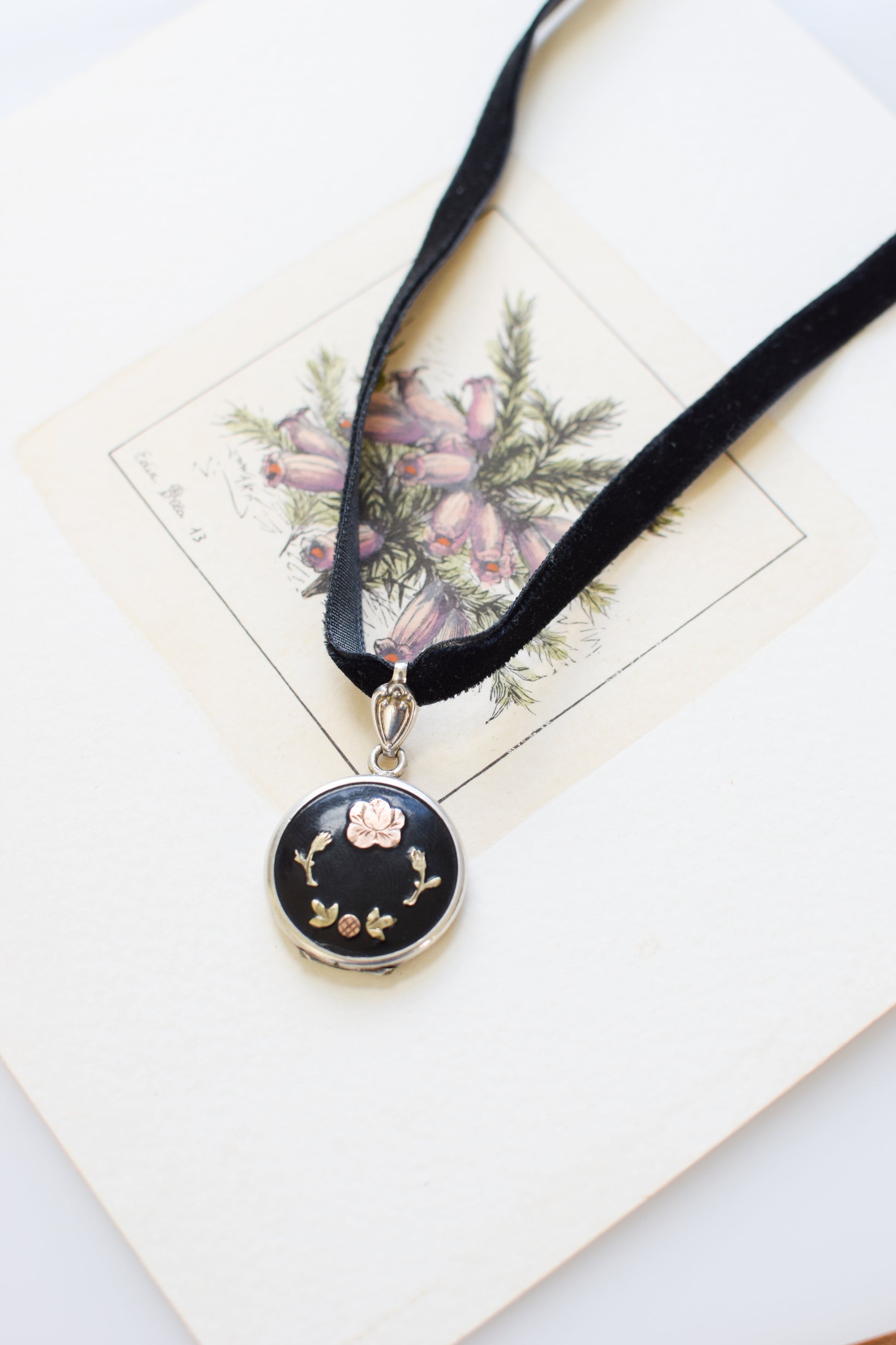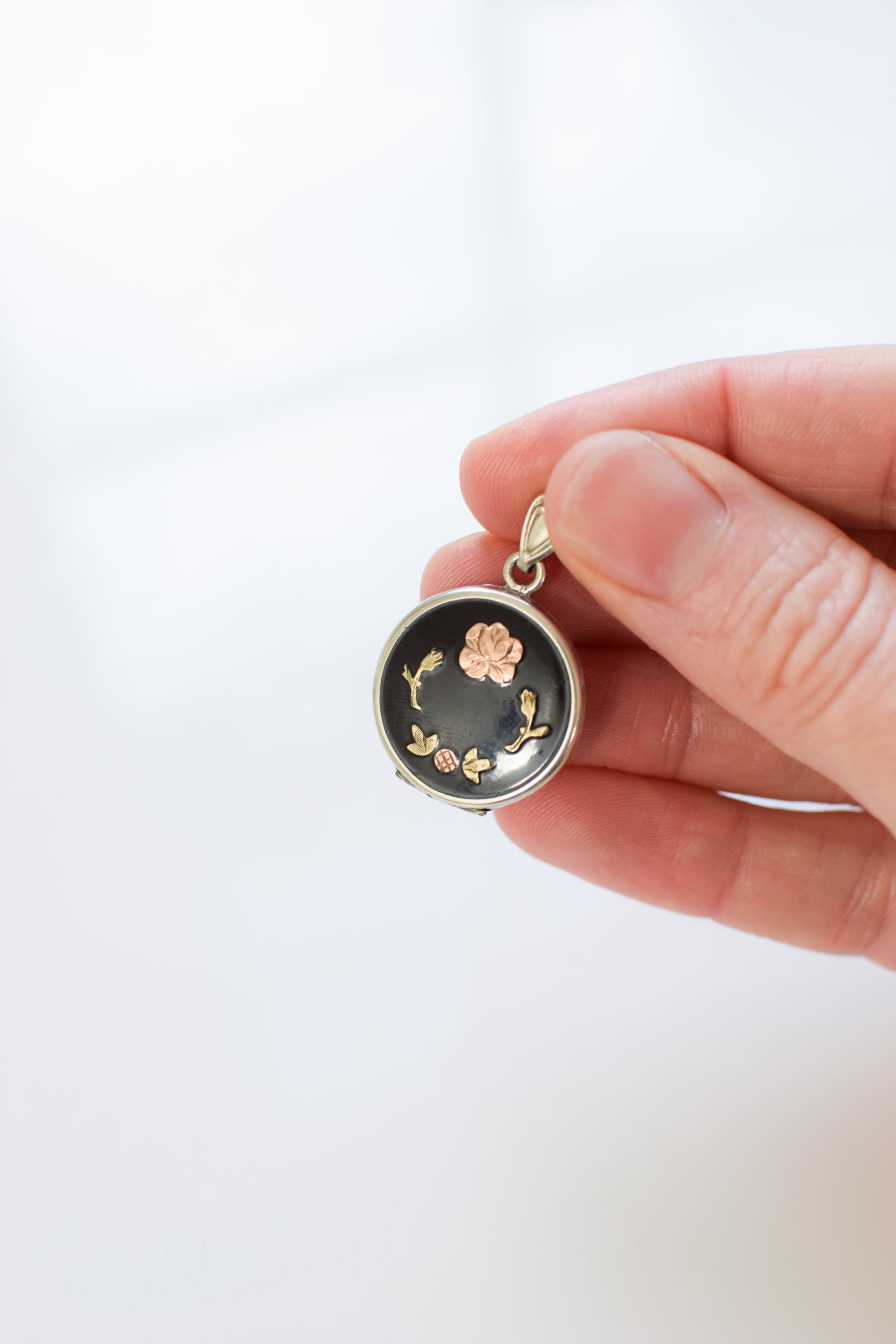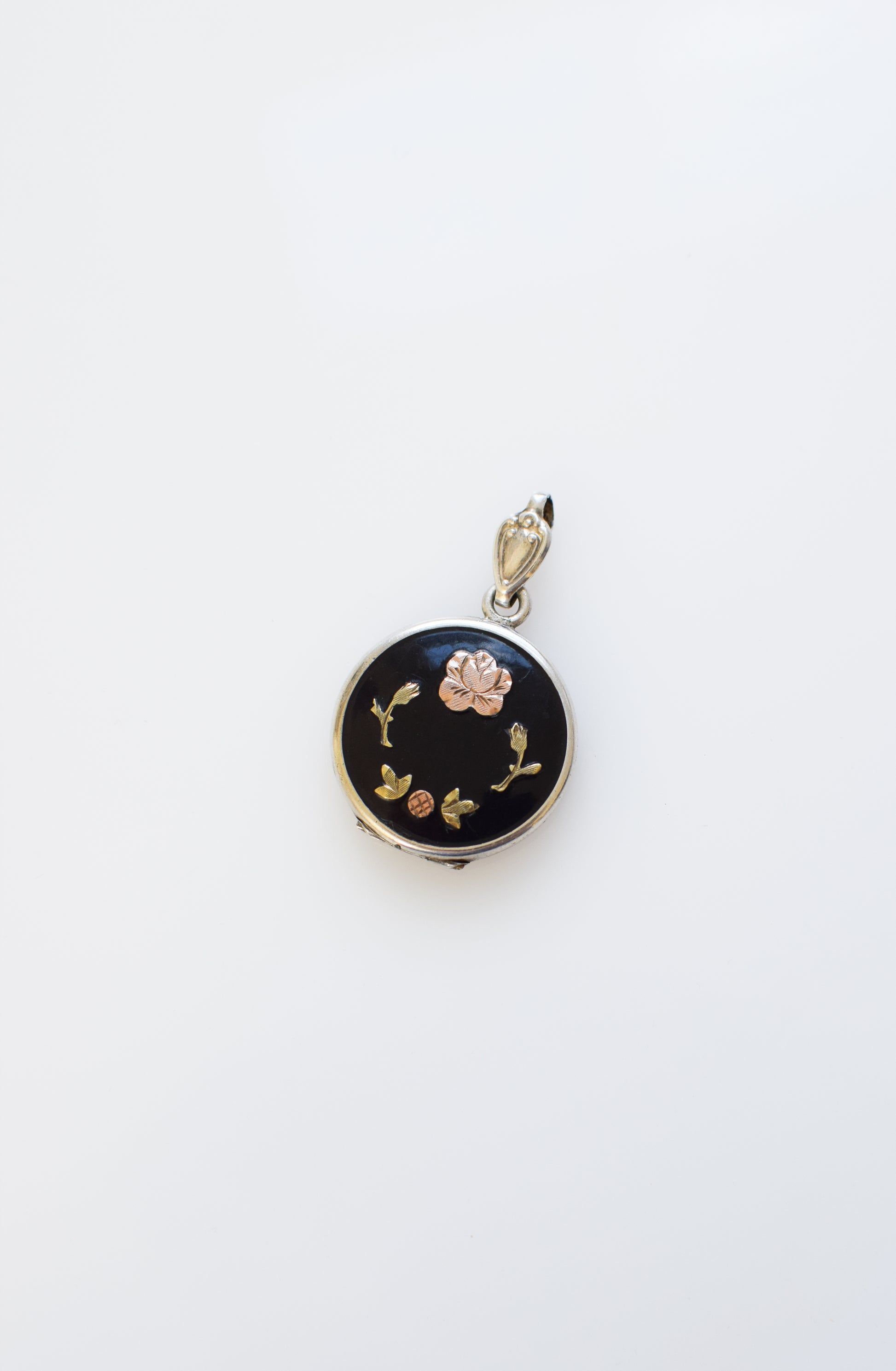 sterling silver with black enamel face and etched rose and green gold floral accents. hinges open at the base to two interior compartments with original removable frames for storing photos or other tiny keepsakes. pretty, original stylized bail. shipped with a length of velvet ribbon, or add it to your chain of choice!