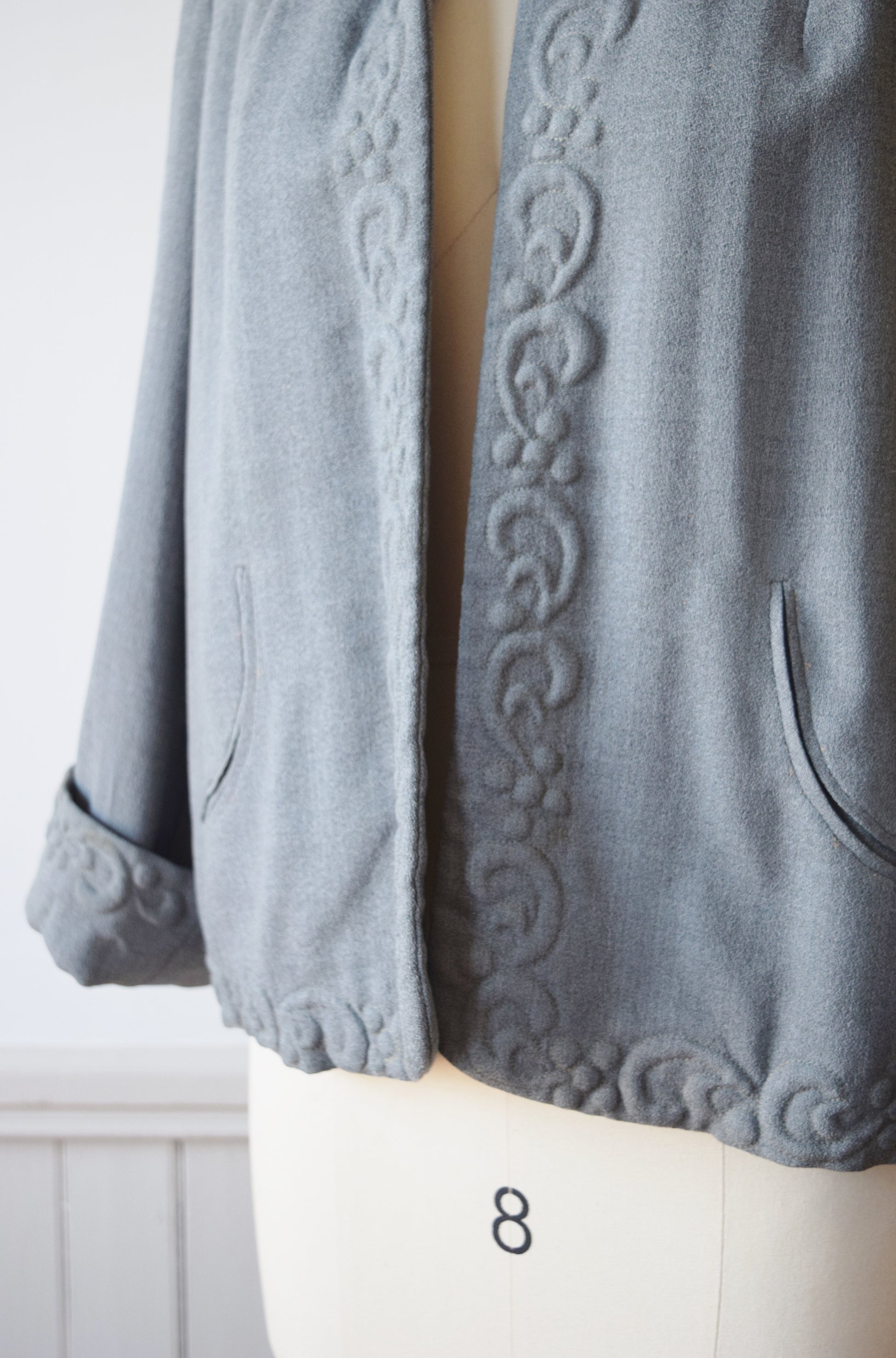 Grey wool crepe with mauvey pink contrast lining. Trapunto decoration along collar, lapel, hem and cuffed sleeves. Lightly padded shoulders, functioning curved slit pockets.