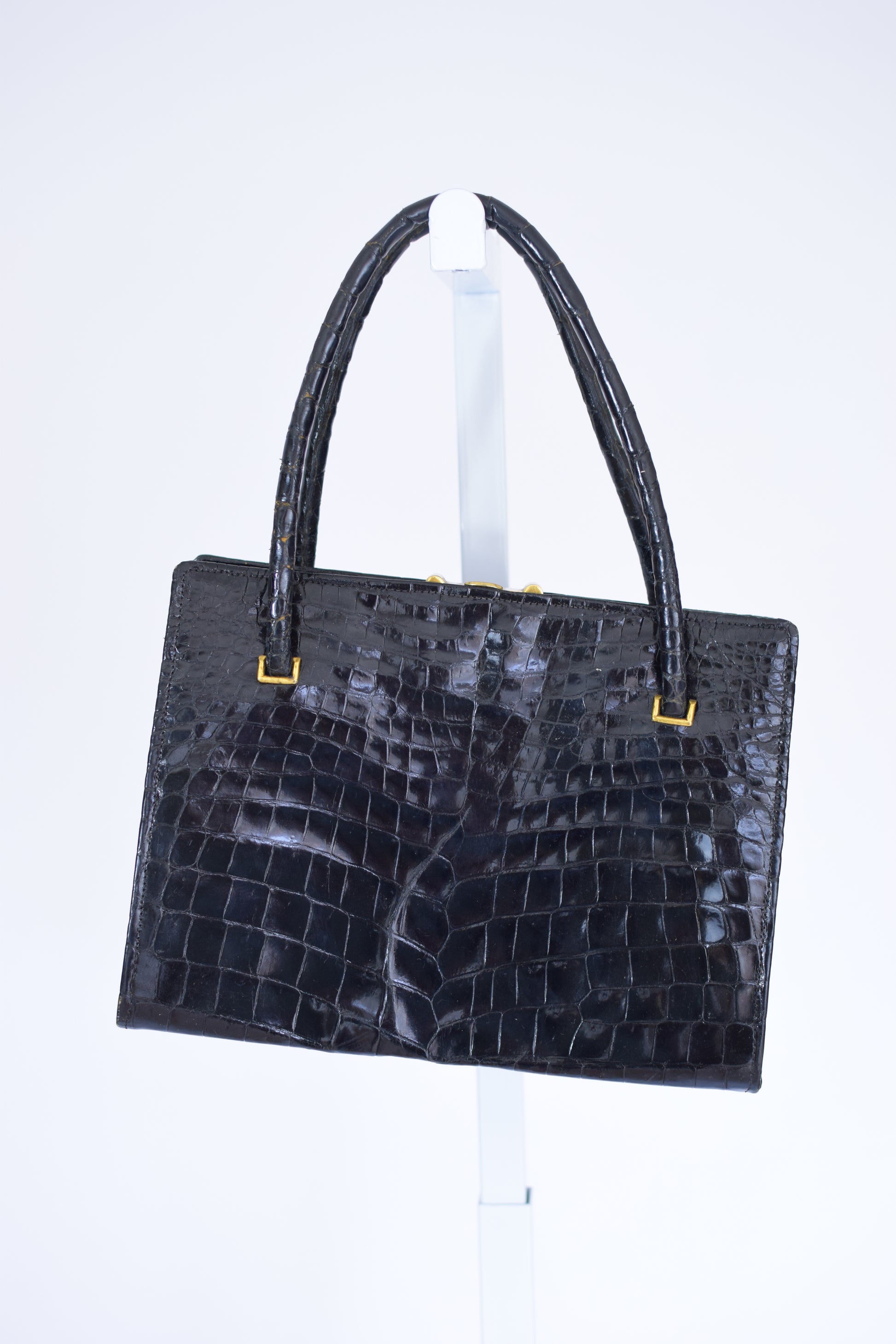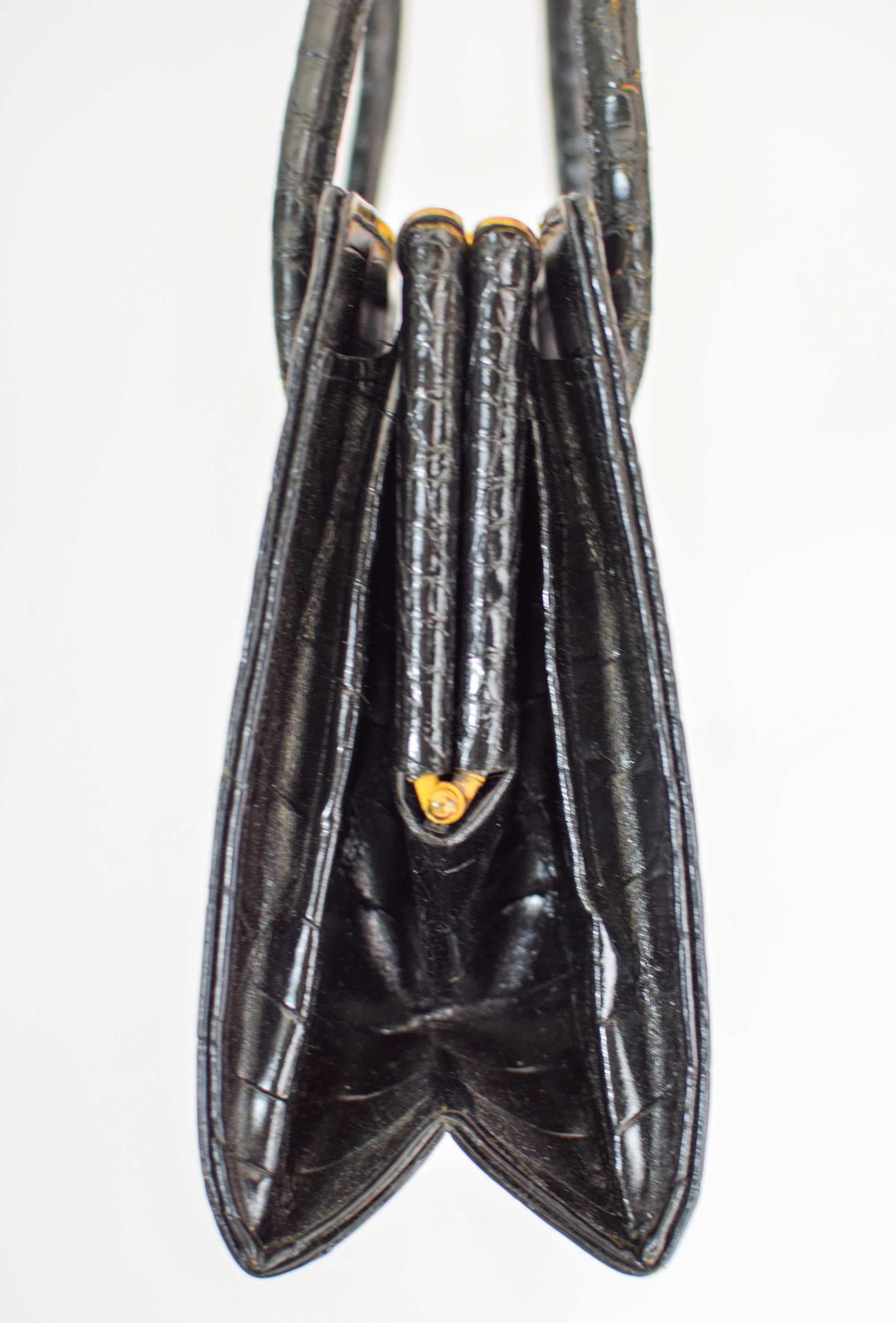 luxury black patent alligator leather. Two exterior pockets, and black kidskin leather interior with hinged frame. gold tone accents and clasp. of excellent workmanship.