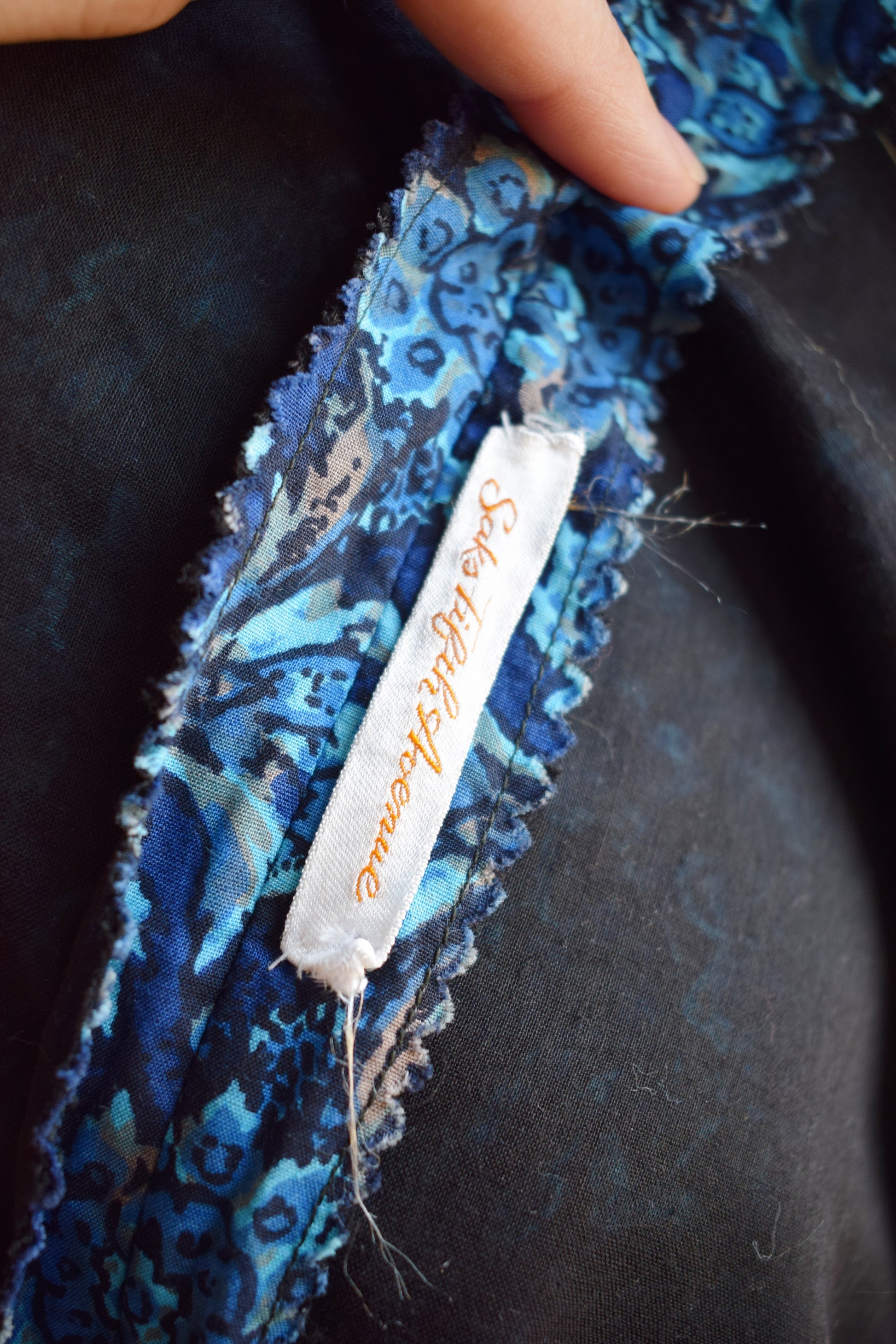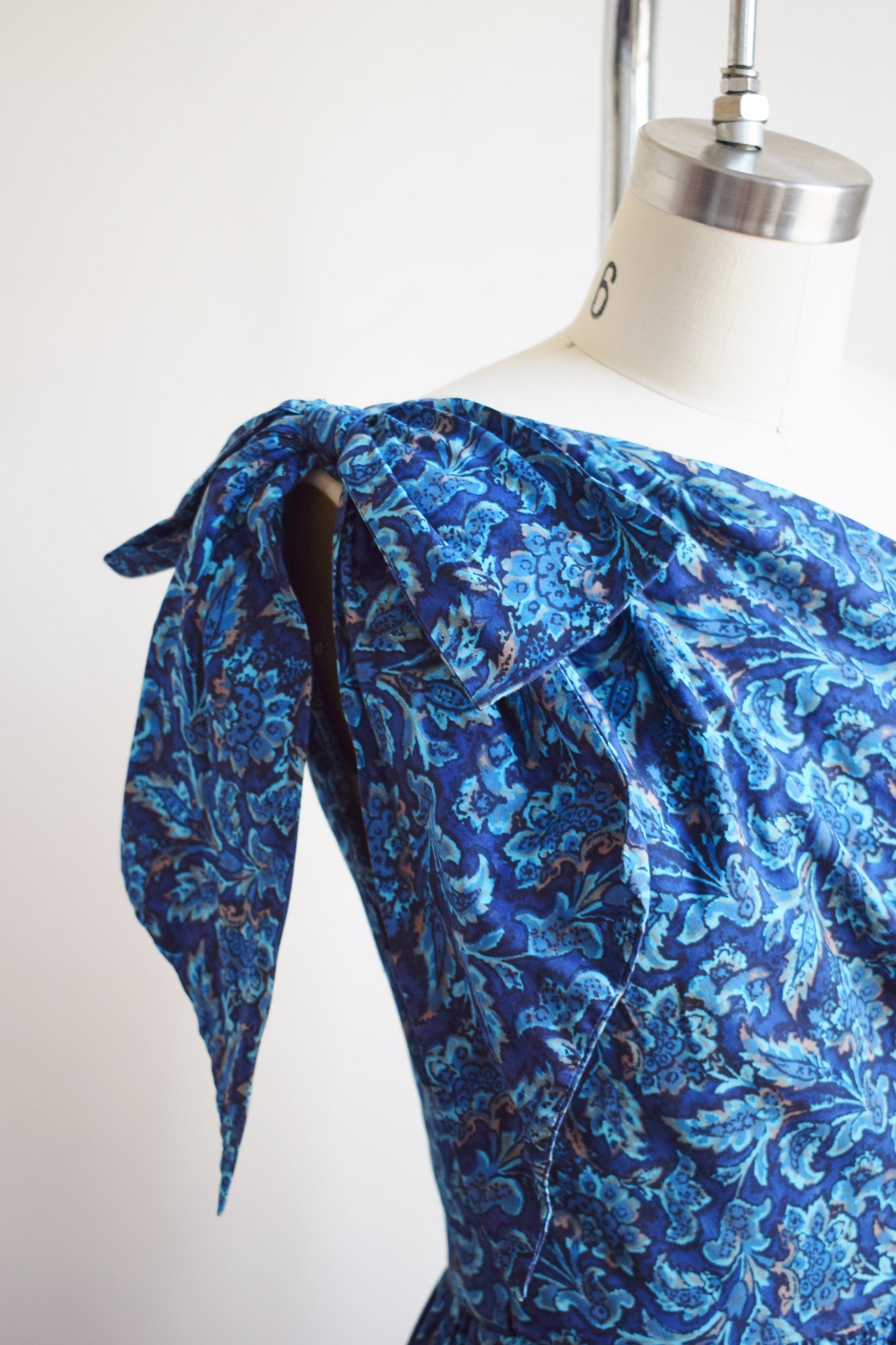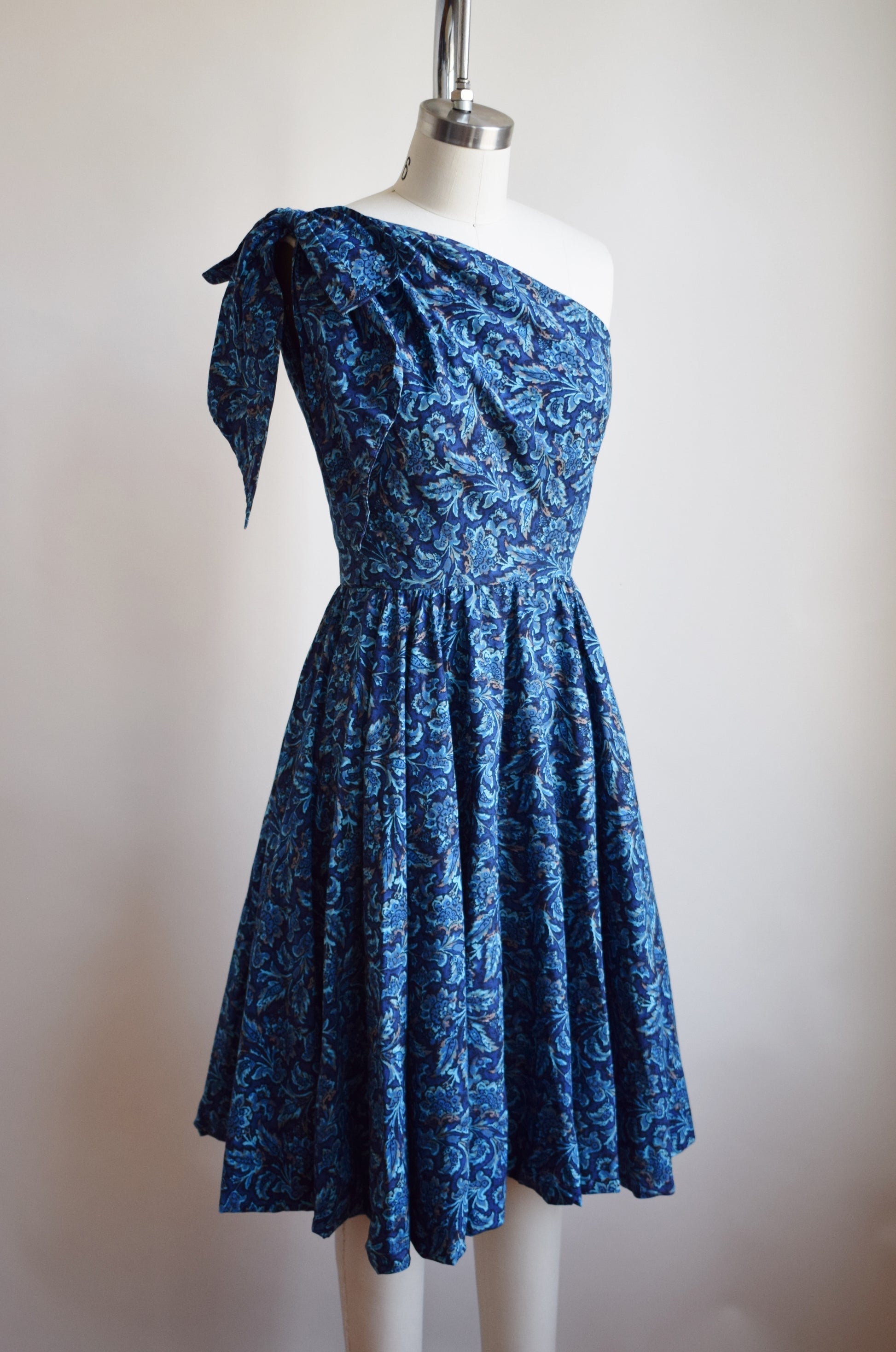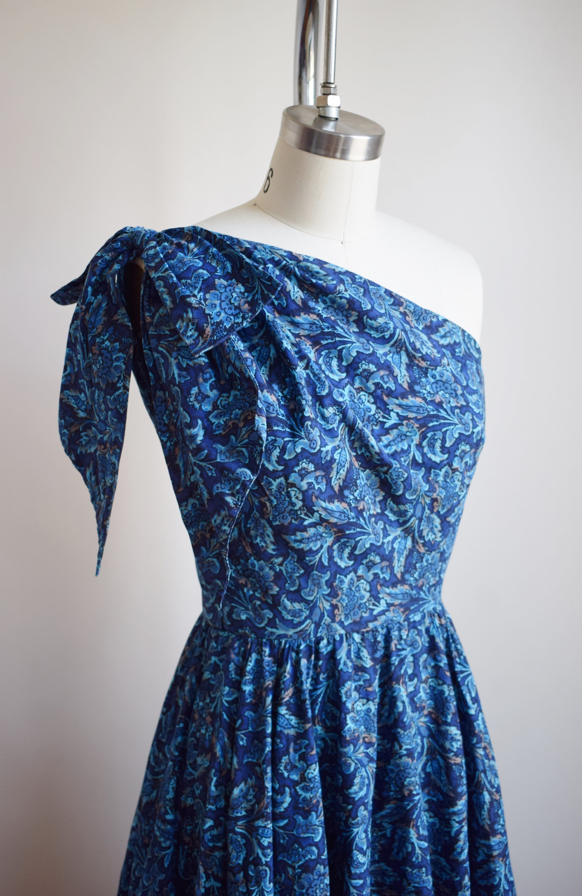 crisp cotton poplin with a rich blue/black/brown paisley print. classic fit and flare silhouette with beautifully draped single-shoulder bodice topped with a large bow. bodice fully lined in a lightweight silk, the skirt in lightweight cotton. long nylon Talon side zipper (I believe this to be a replacement dating from the 60s/70s)