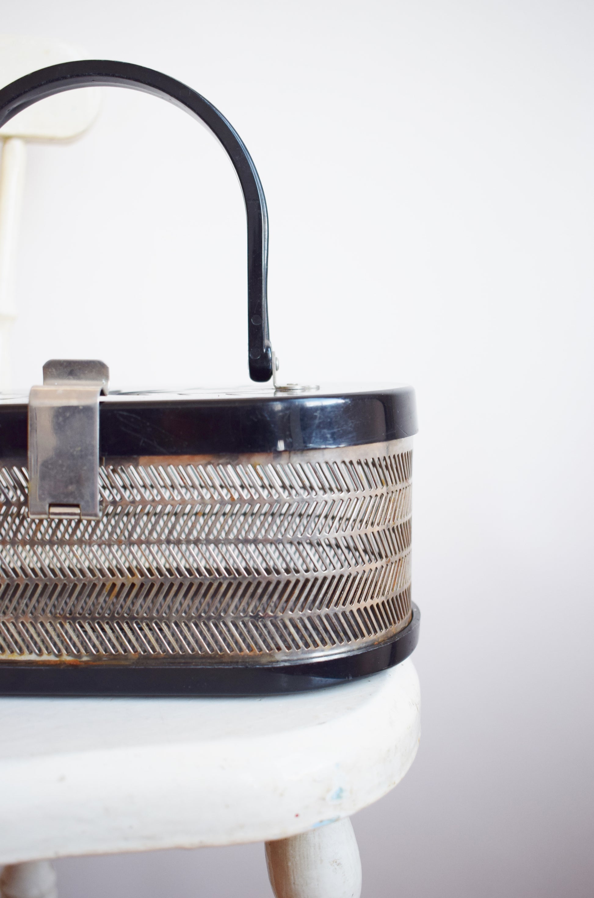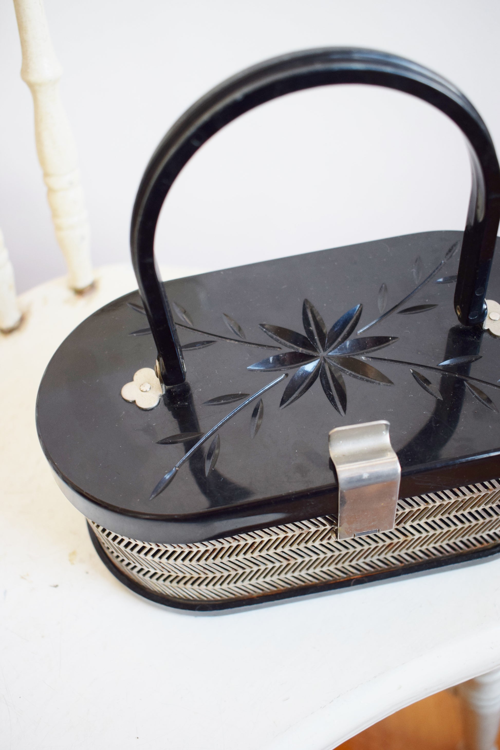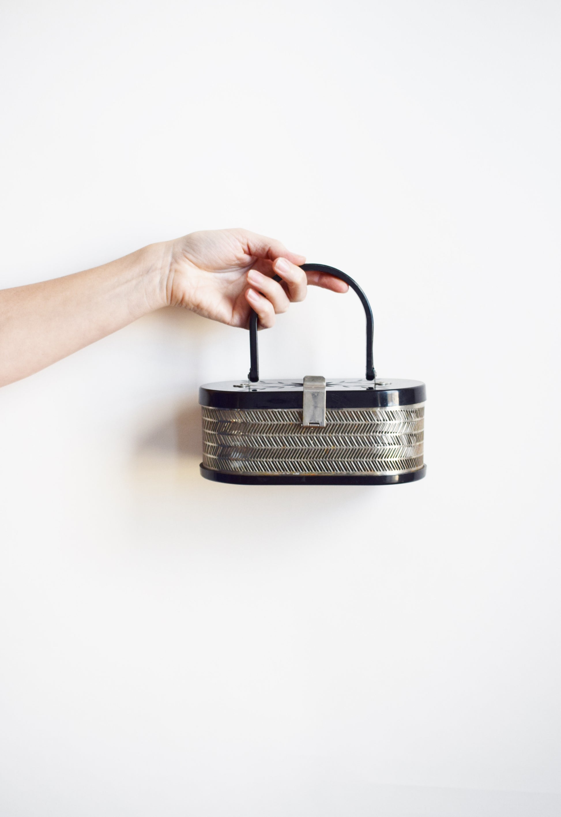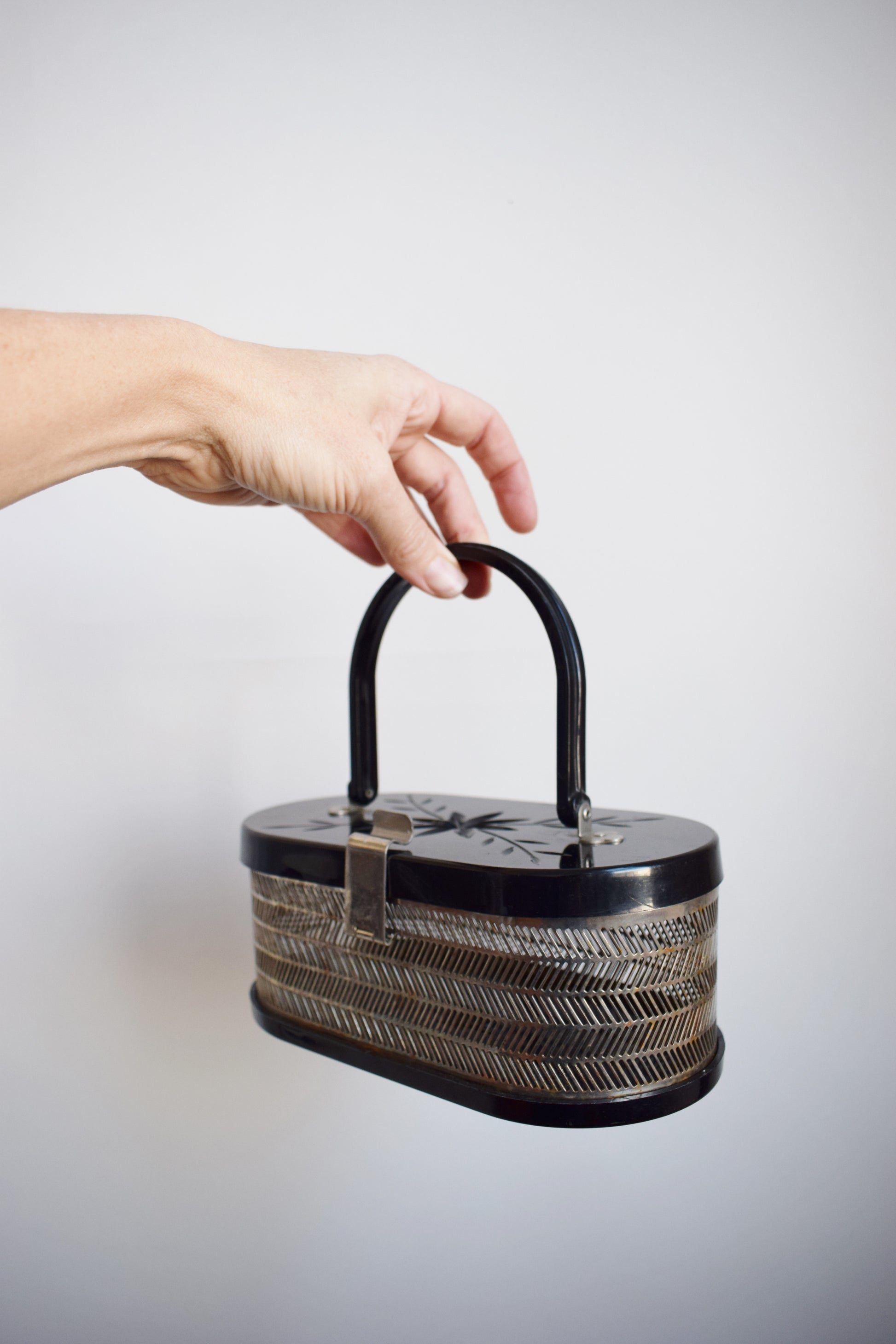 pill-shaped case with black lucite handle, carved lid, and base with pierced basketweave-style metal sides and silver hardware.