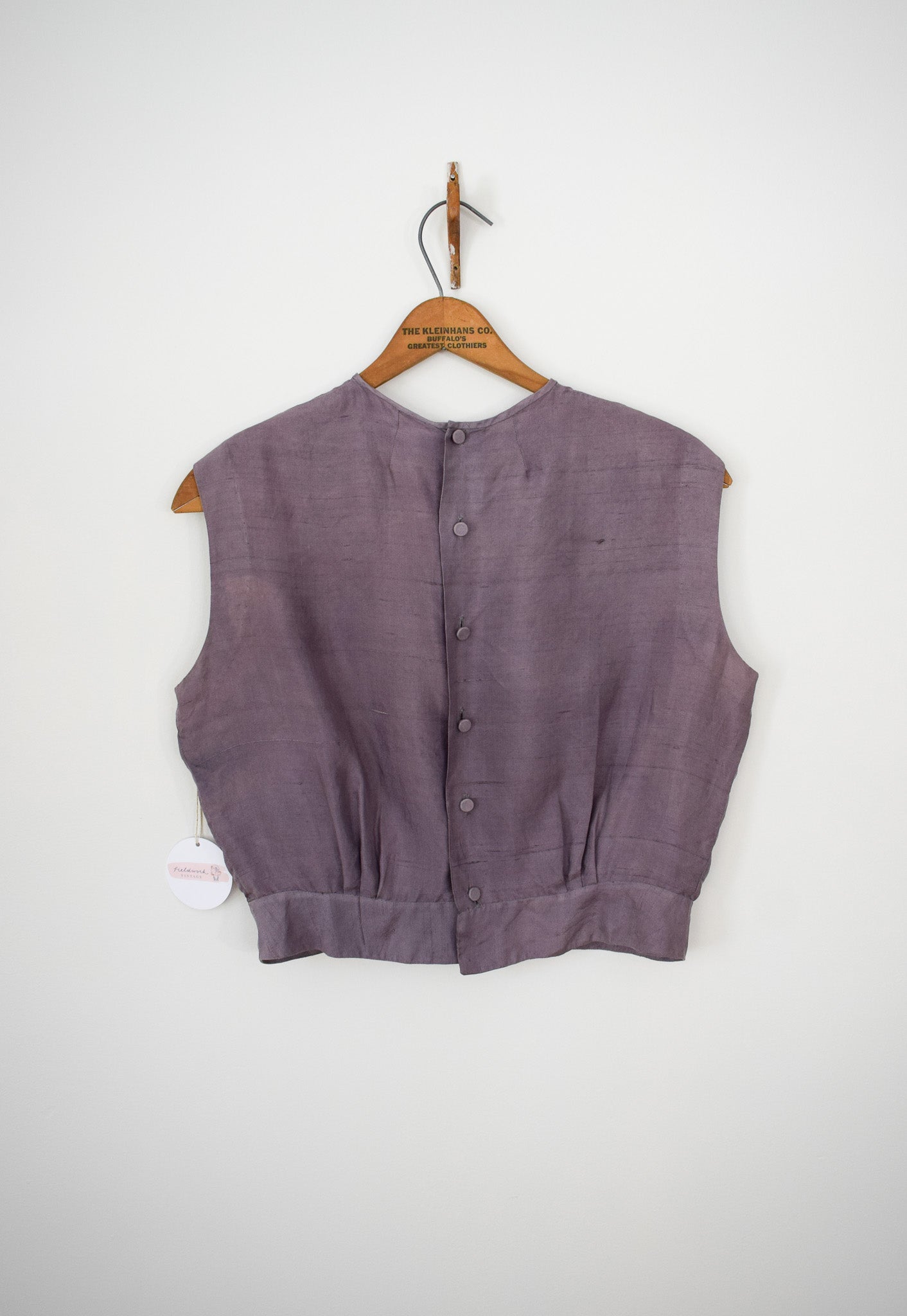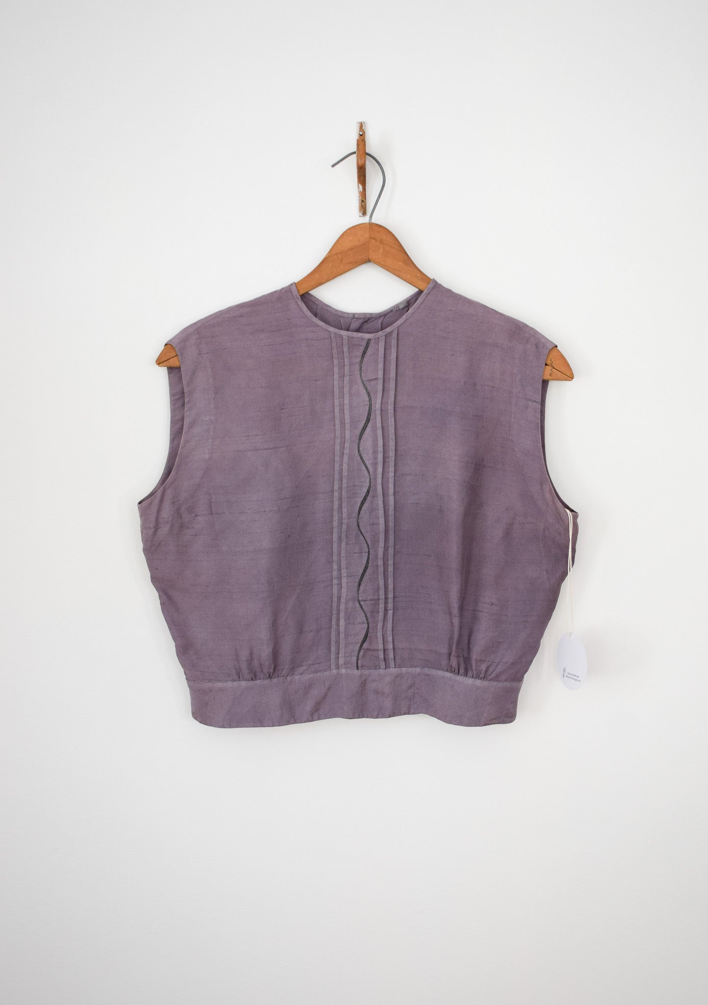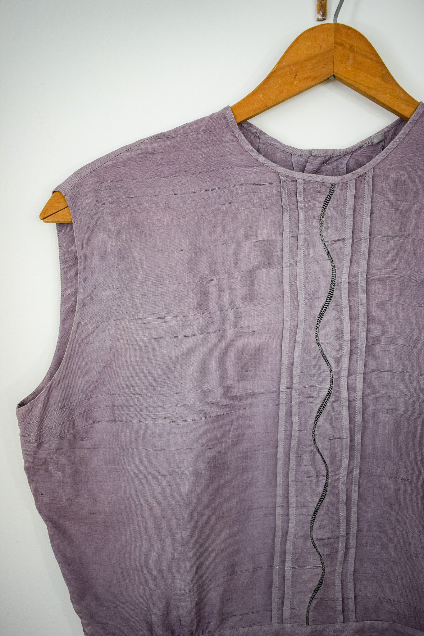 soft raw silk in muted lavender with central pleat and embroidered accent. gathered at the waist, fabric covered buttons down the back.