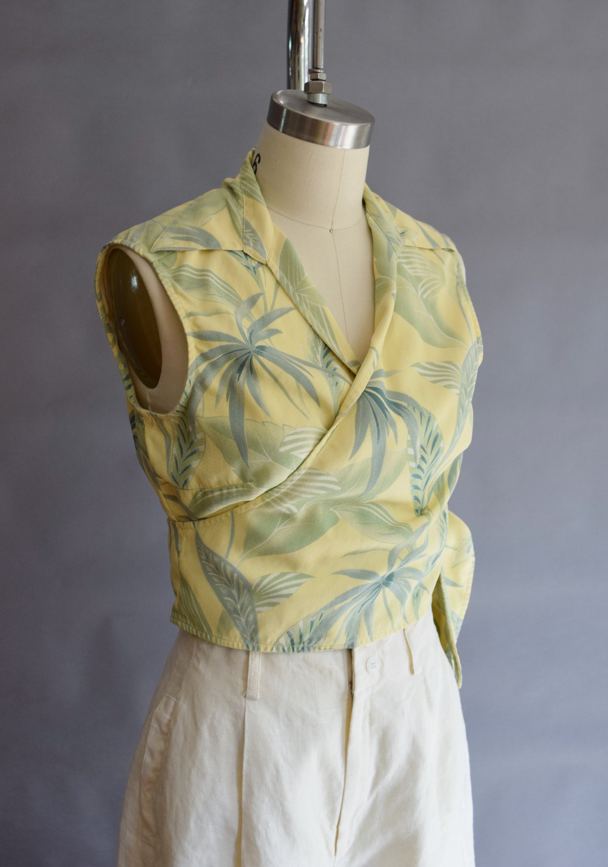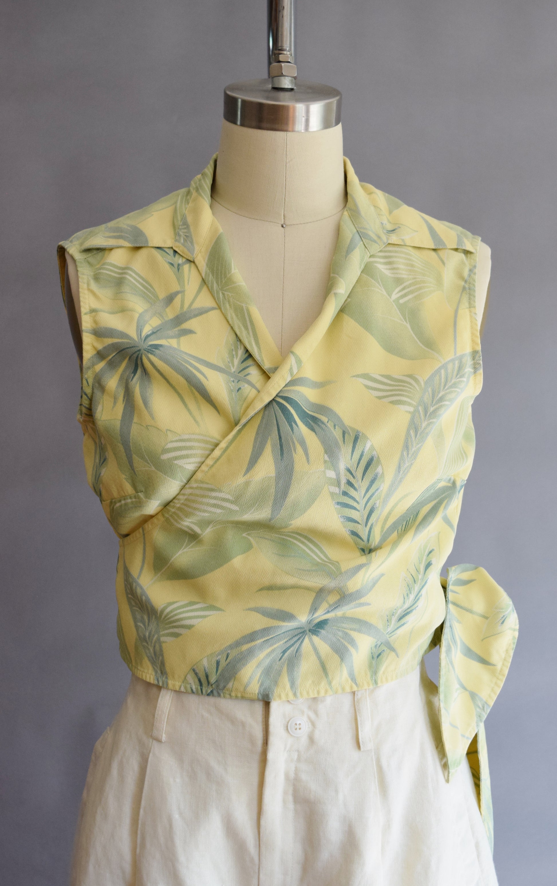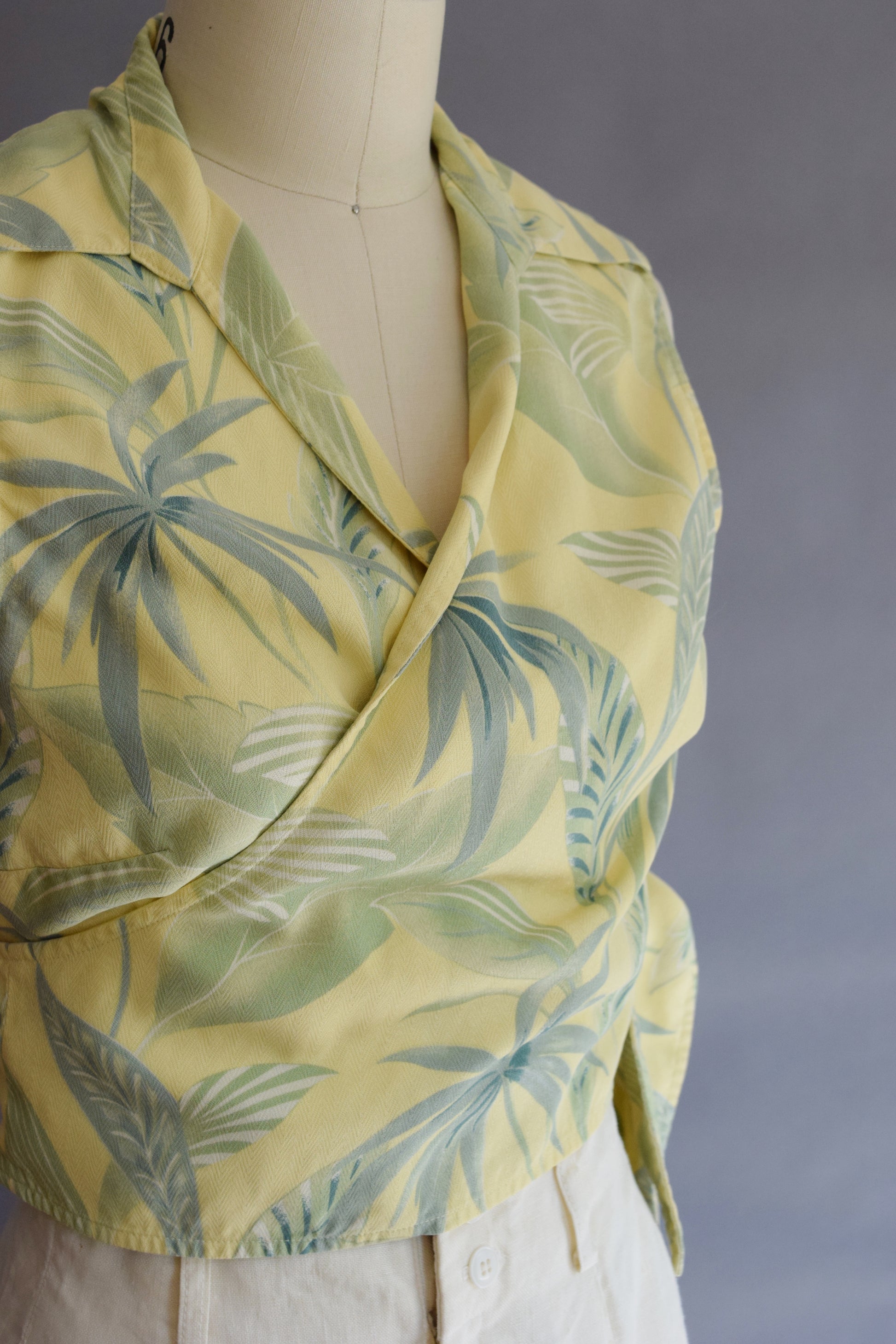 lovely silk twill in a muted yellow and green tropical foliage print. Classic 50s styling with cropped cut and wrap design that ties at the left side.
