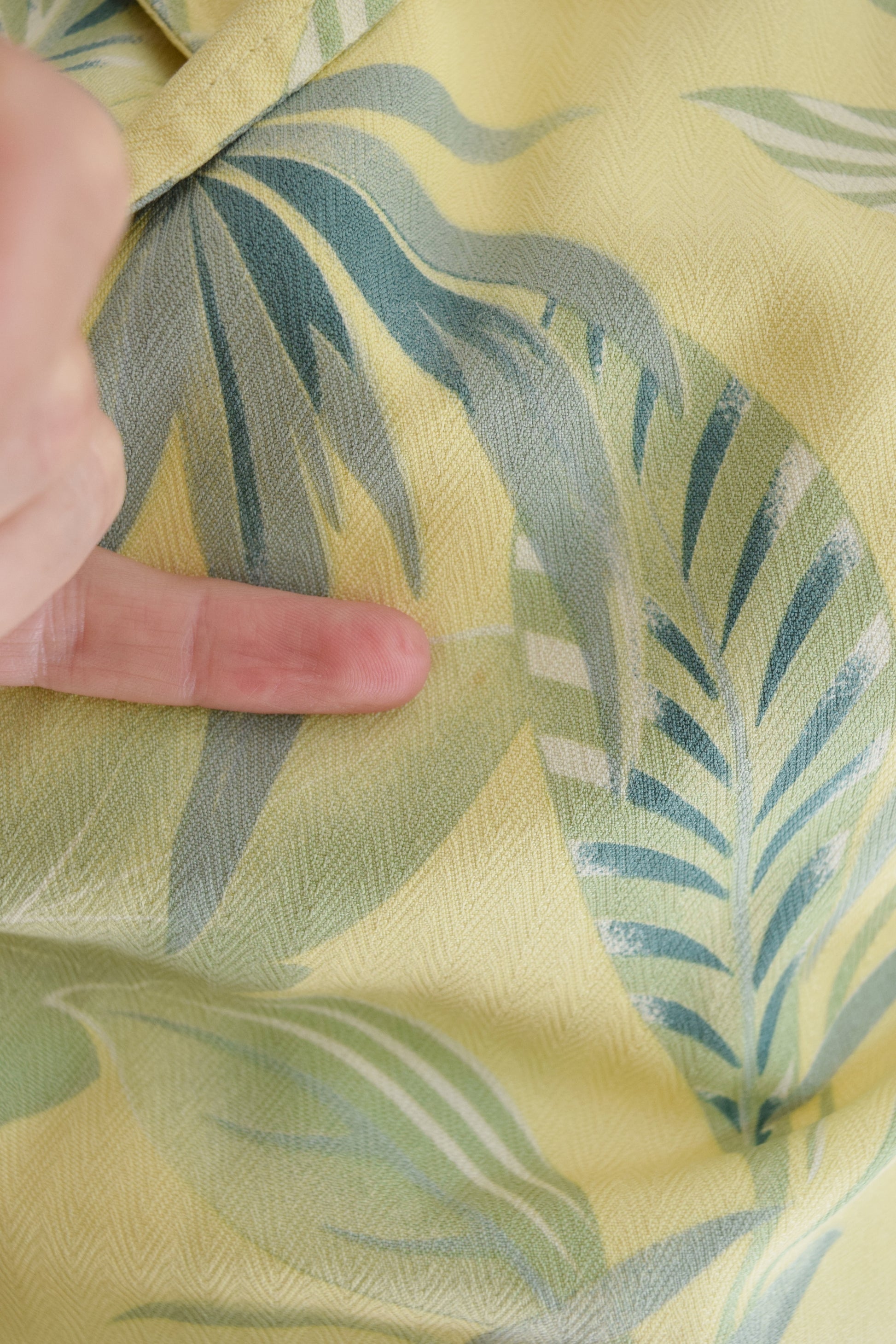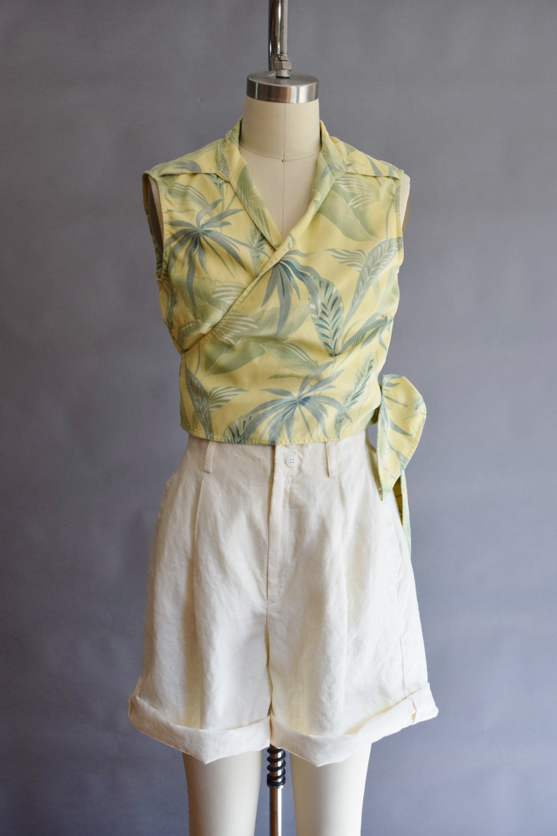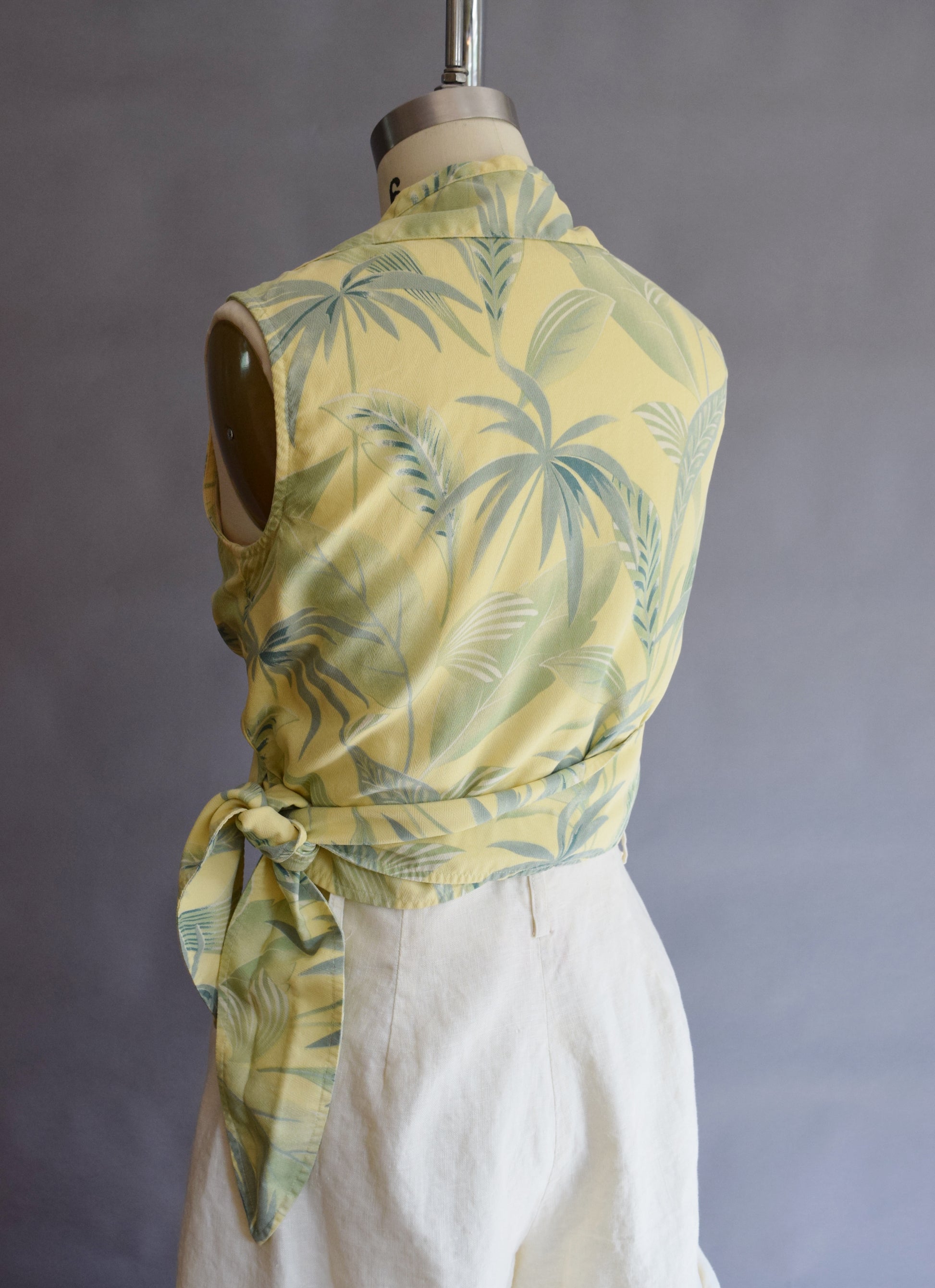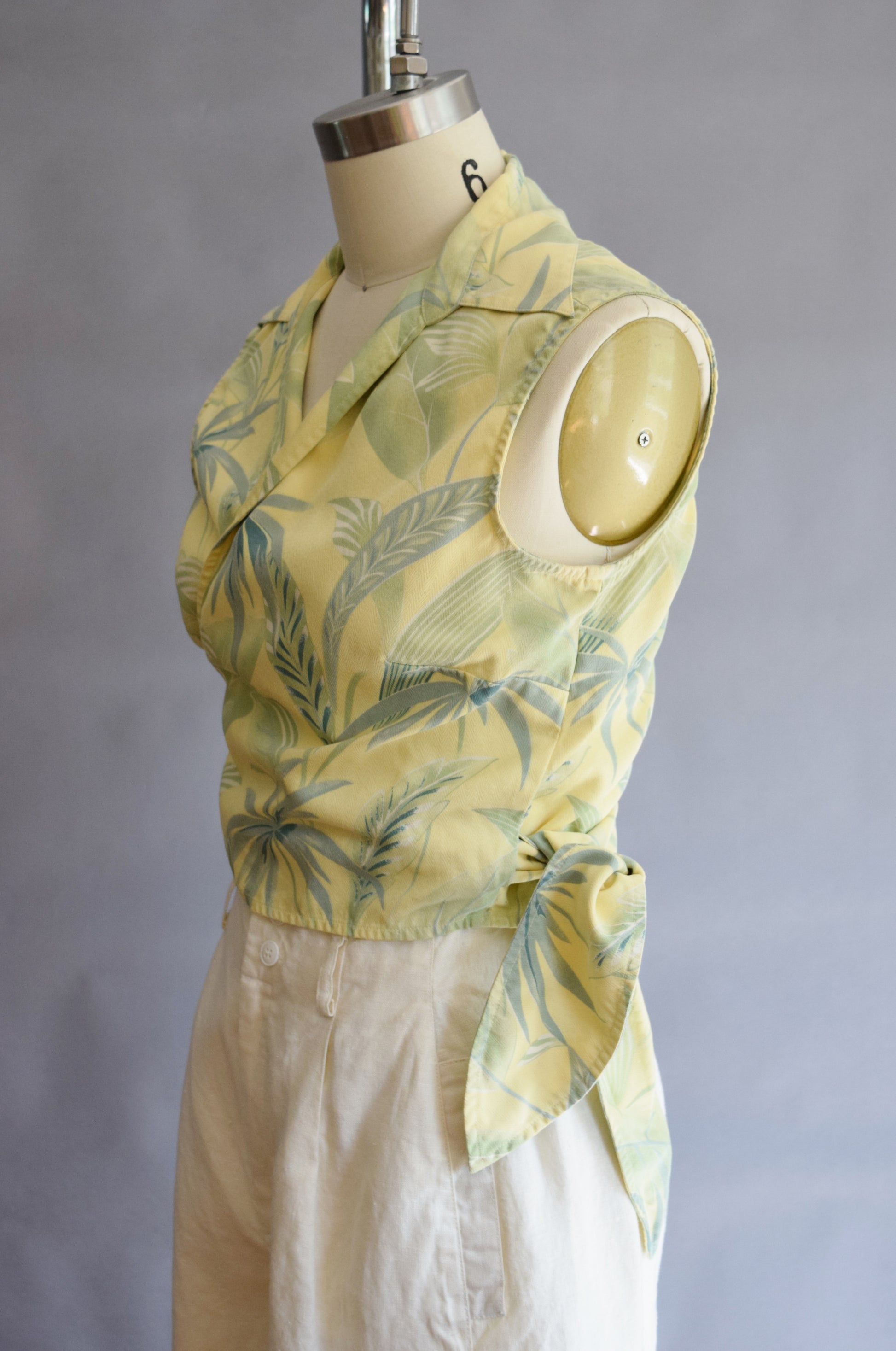 lovely silk twill in a muted yellow and green tropical foliage print. Classic 50s styling with cropped cut and wrap design that ties at the left side.