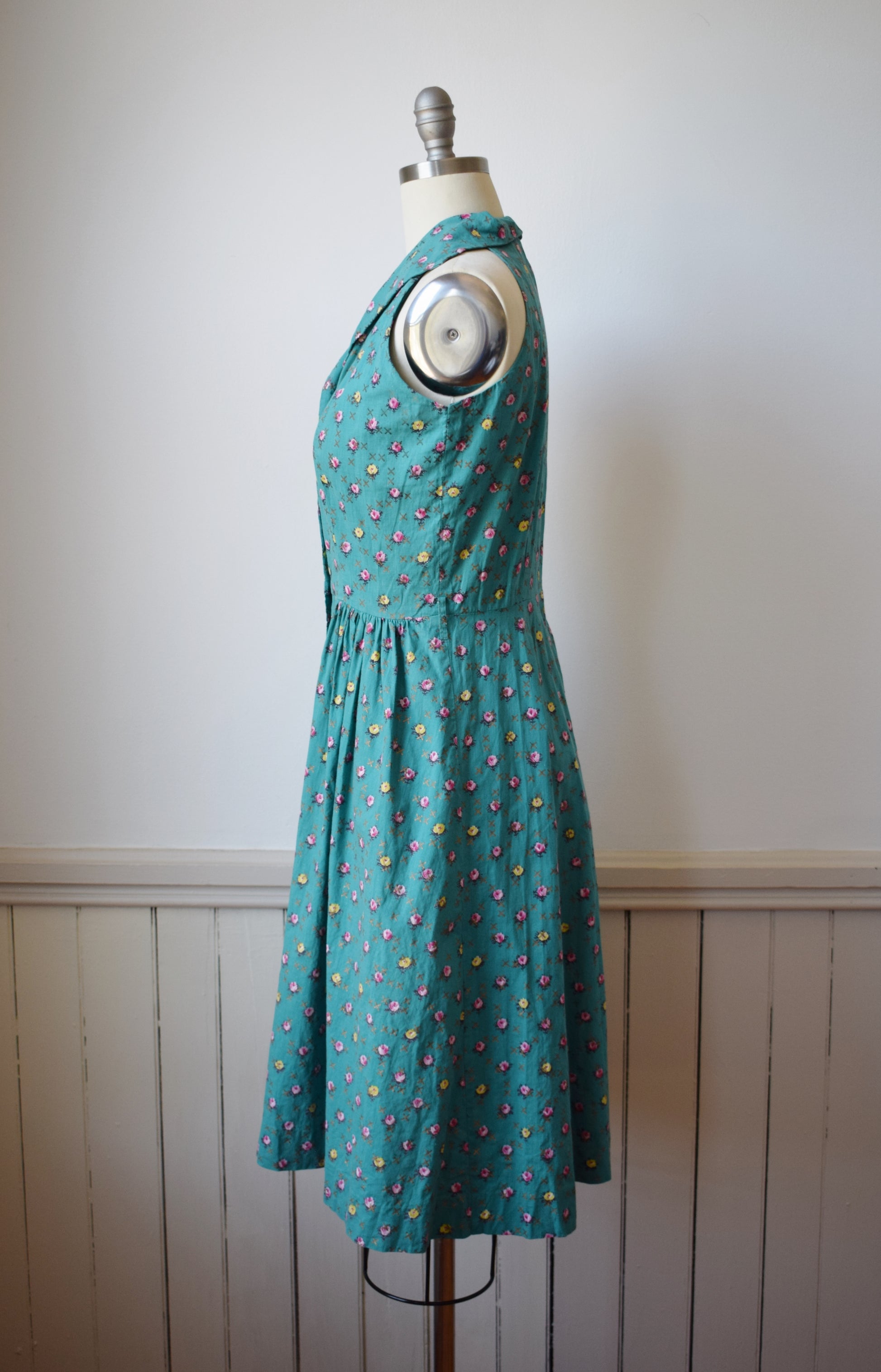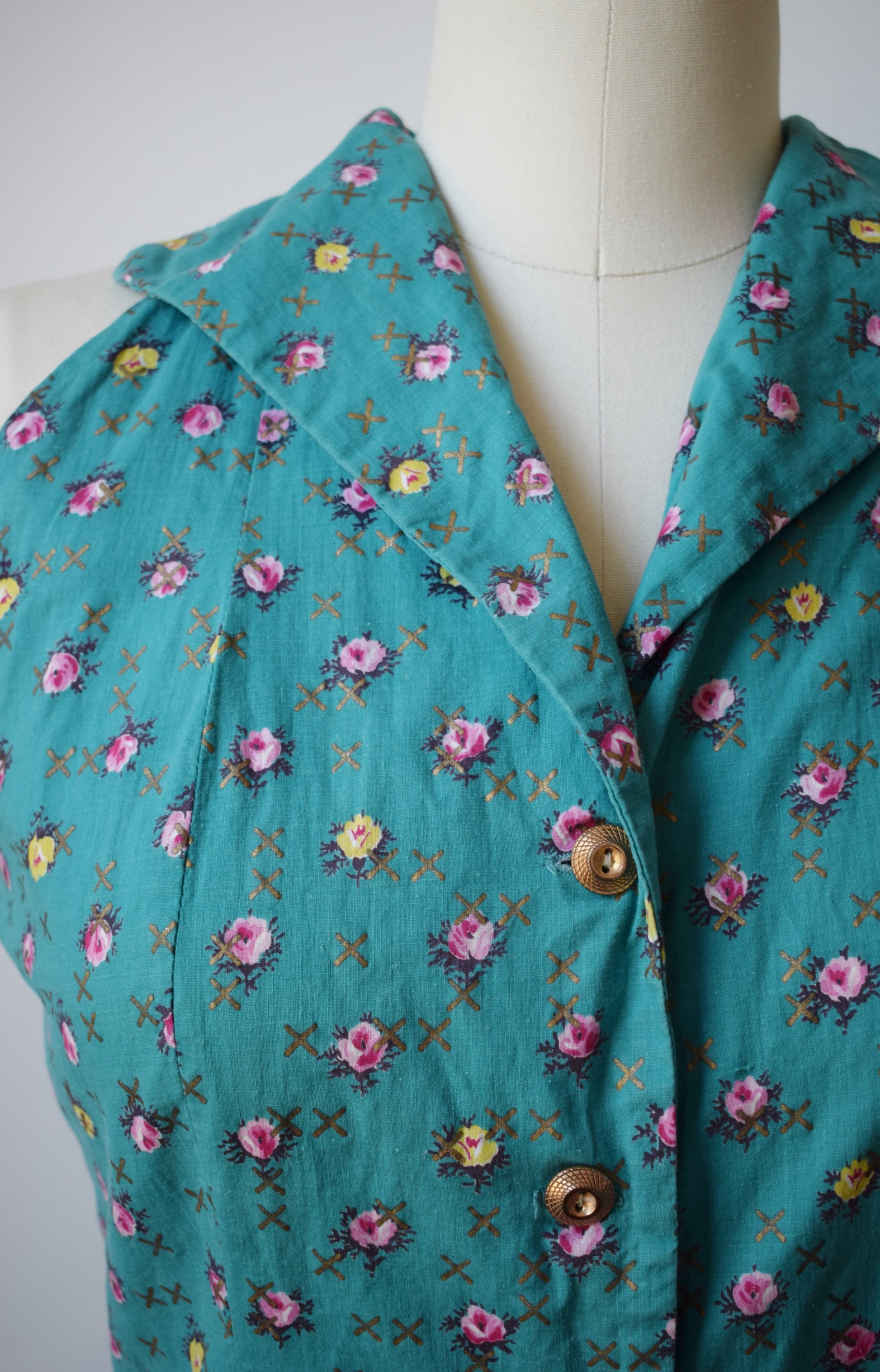 lightly structured teal cotton weave with pink and yellow roses and metallic gold X print. flattering cut-in sleeveless bodice. full skirt gathered at waist. buttons all the way down the front.