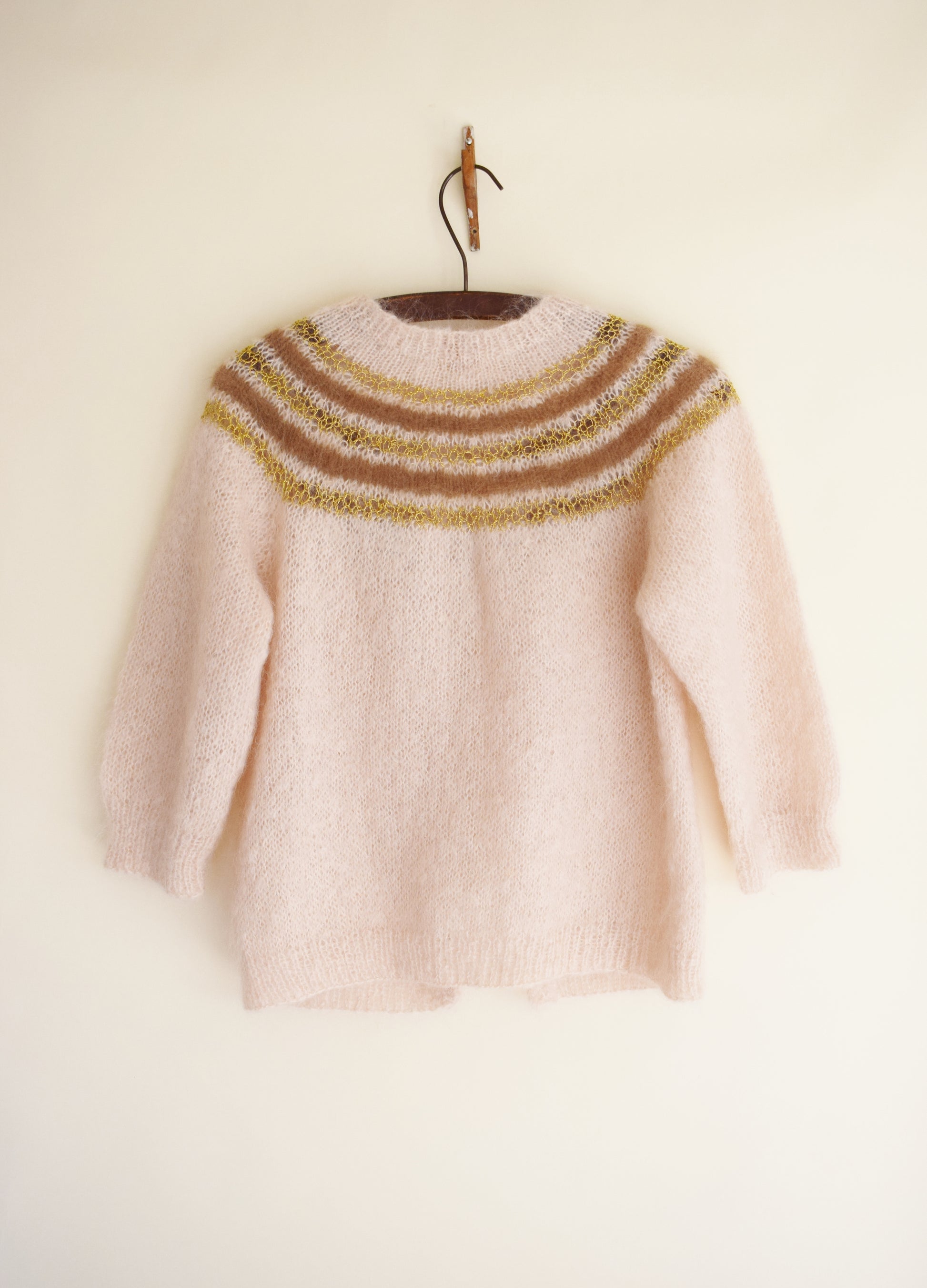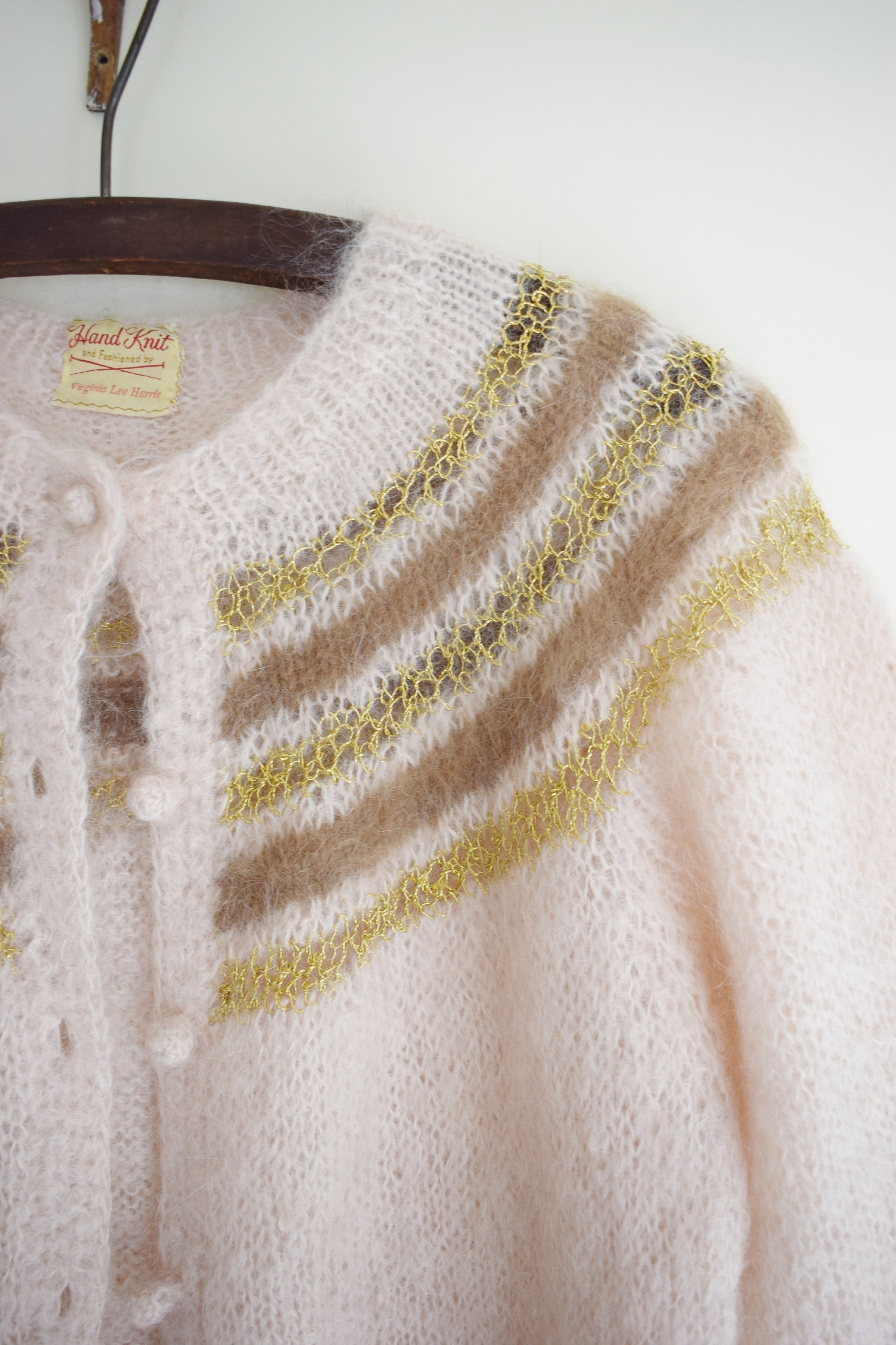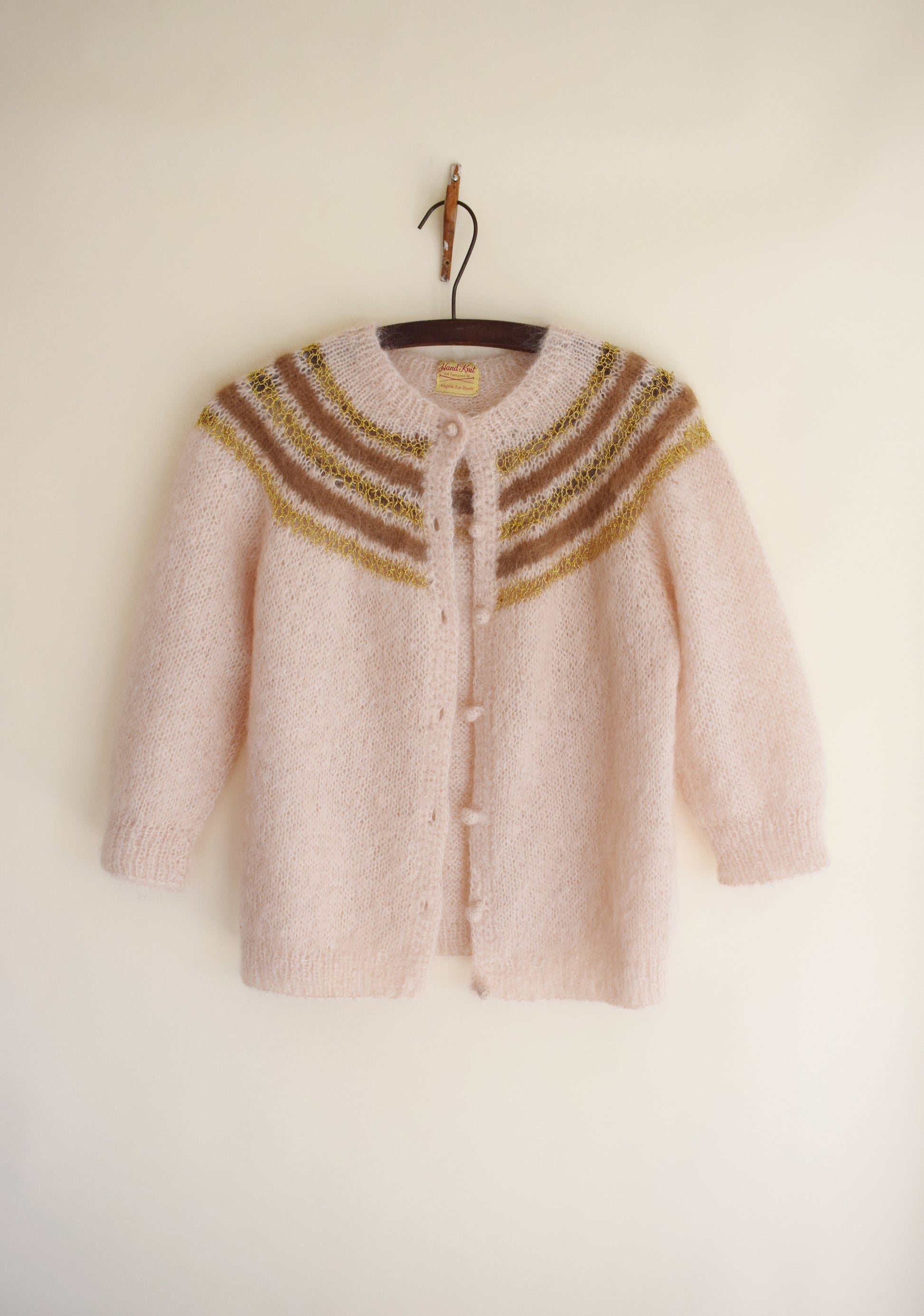 pale peach mohair or mohair blend with metallic gold and fawn striping accents. 3/4 length sleeves, bauble buttons.