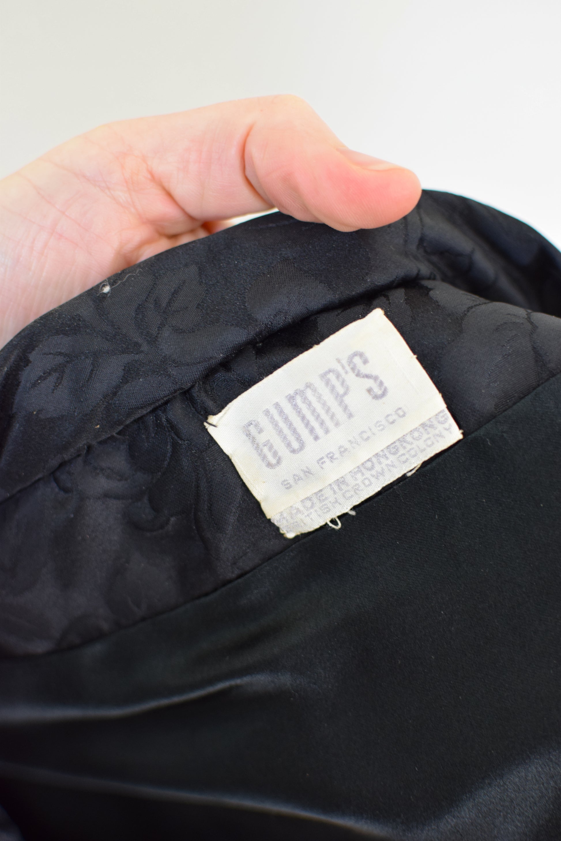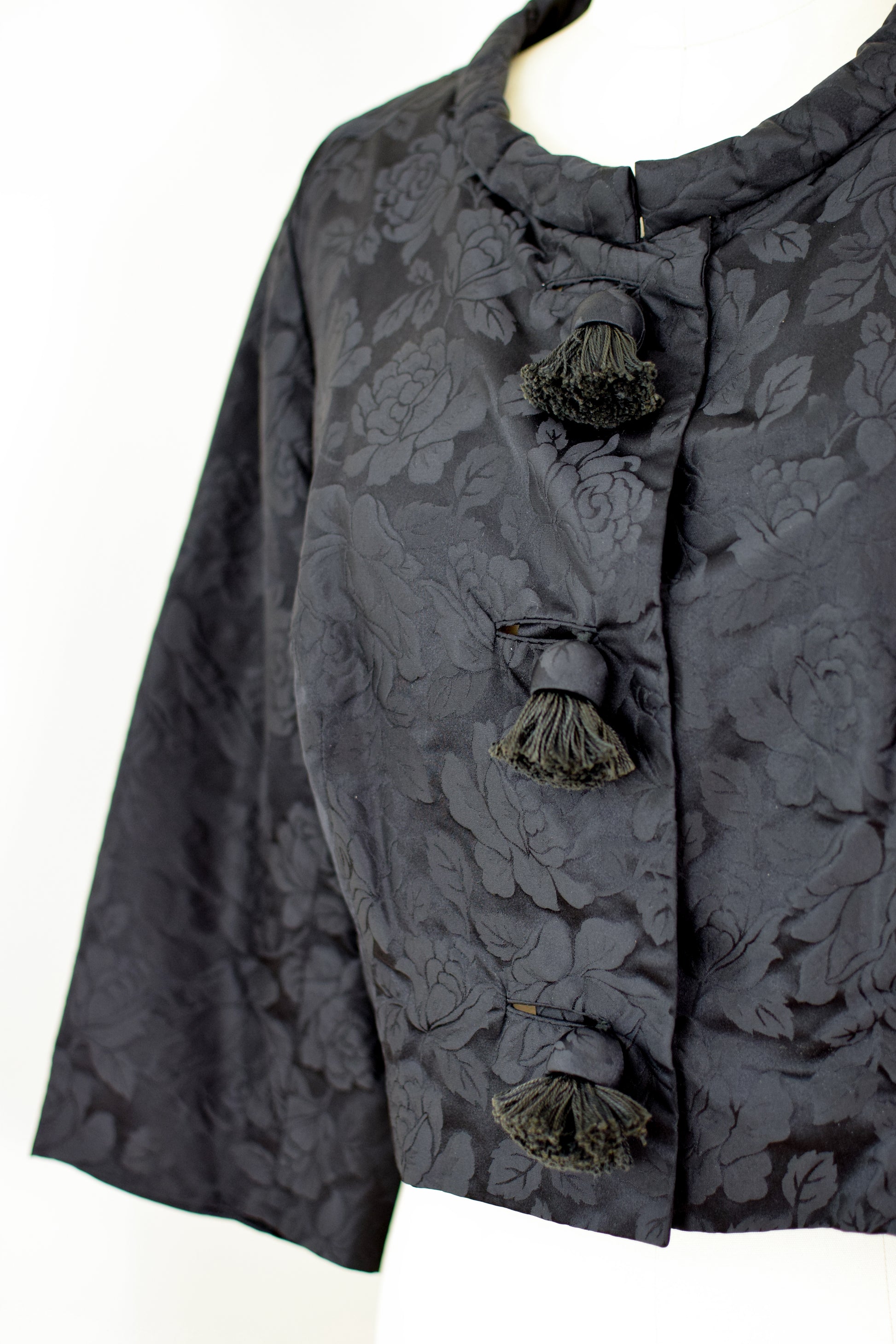 beautiful black silk jacquard woven with a light-catching rose pattern. cropped fit with 3/4 length sleeves and three oversized tassel buttons. fully lined in silk satin.