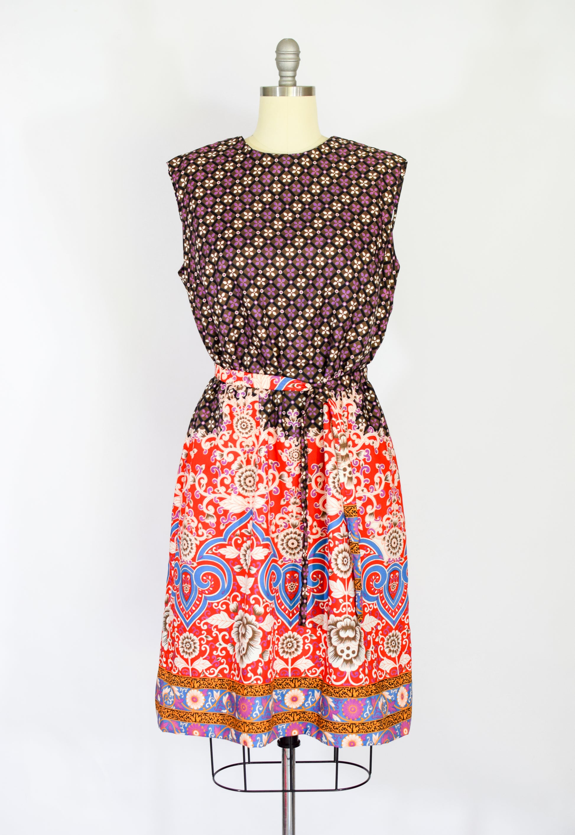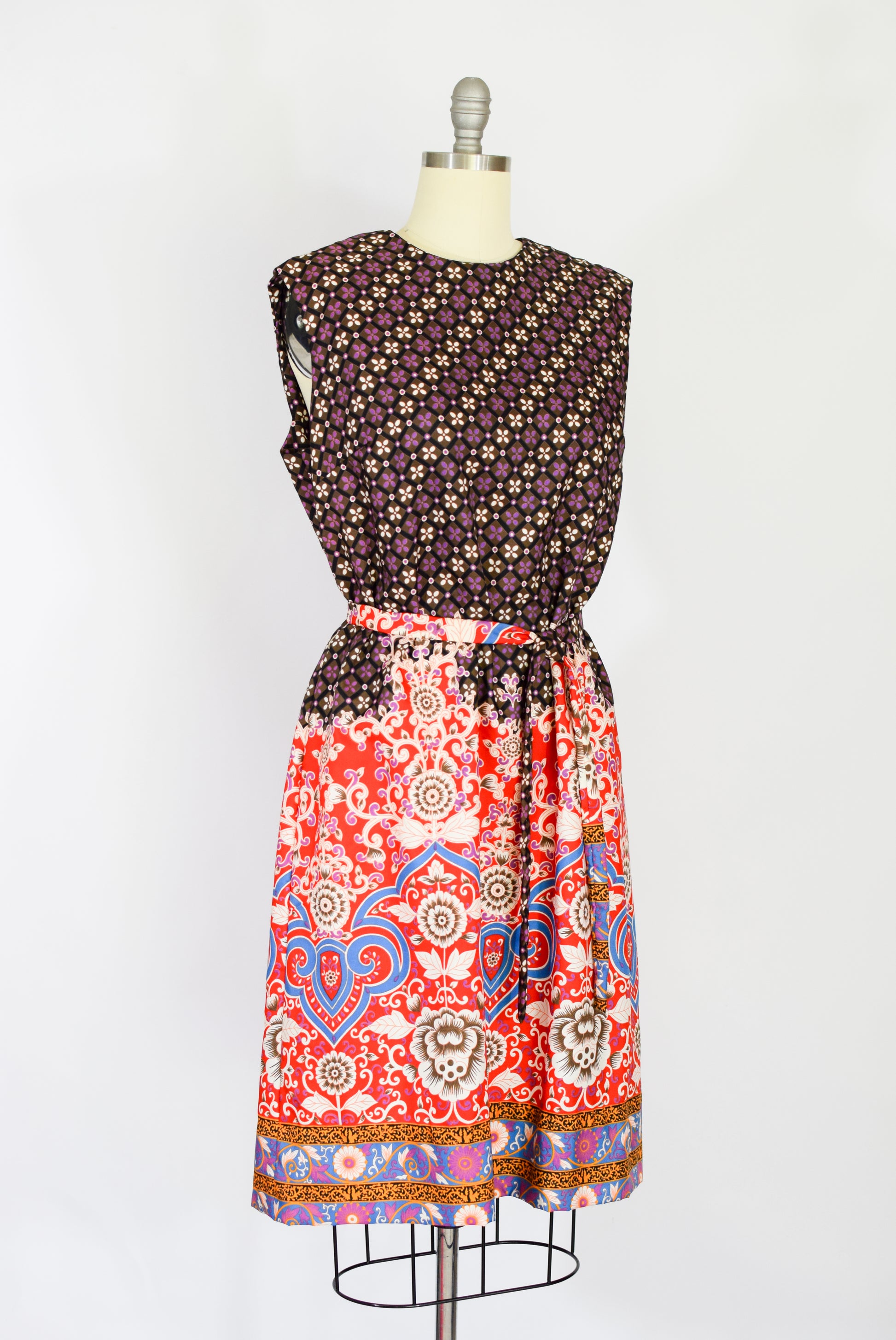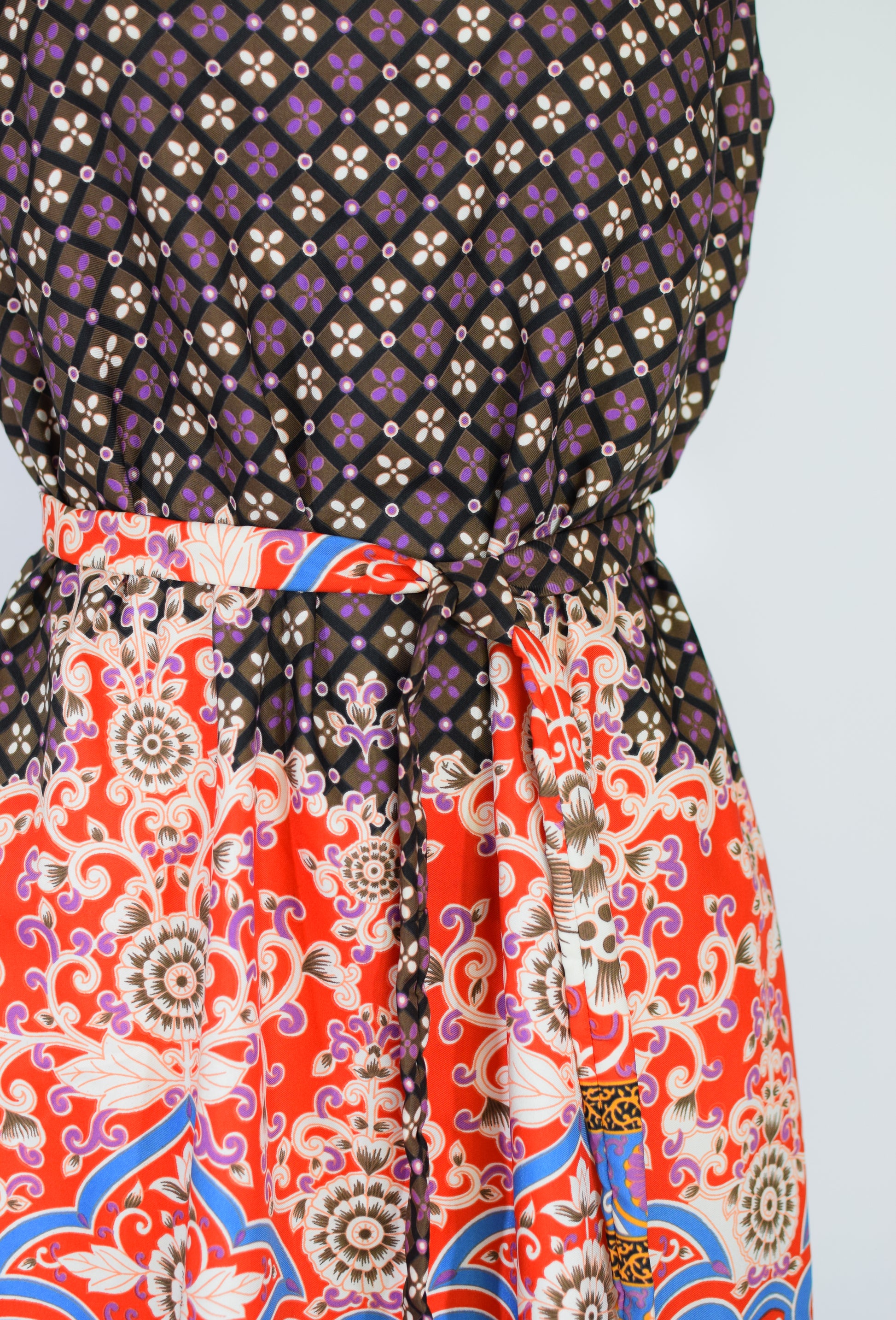 mixed print silk in a classic 60s shift-style with matching belt and scarf (style as belt or head scarf too!). metal back zipper.