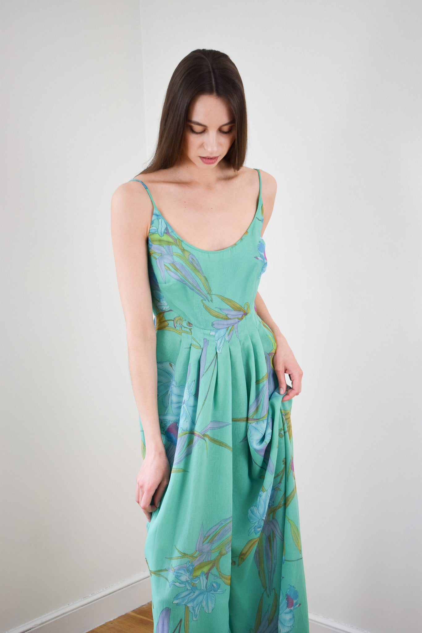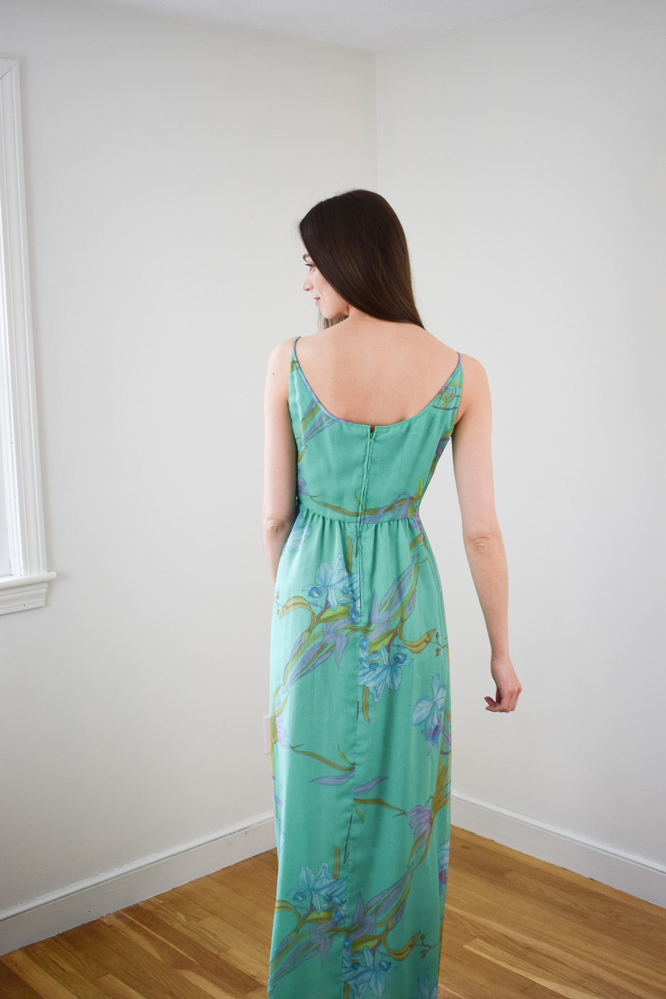 saturated spring green orchid print overlay lined in a green crepe. scooped and pleated empire waist, elegant column silhouette. zips up the back. excellent construction quality and tailoring.