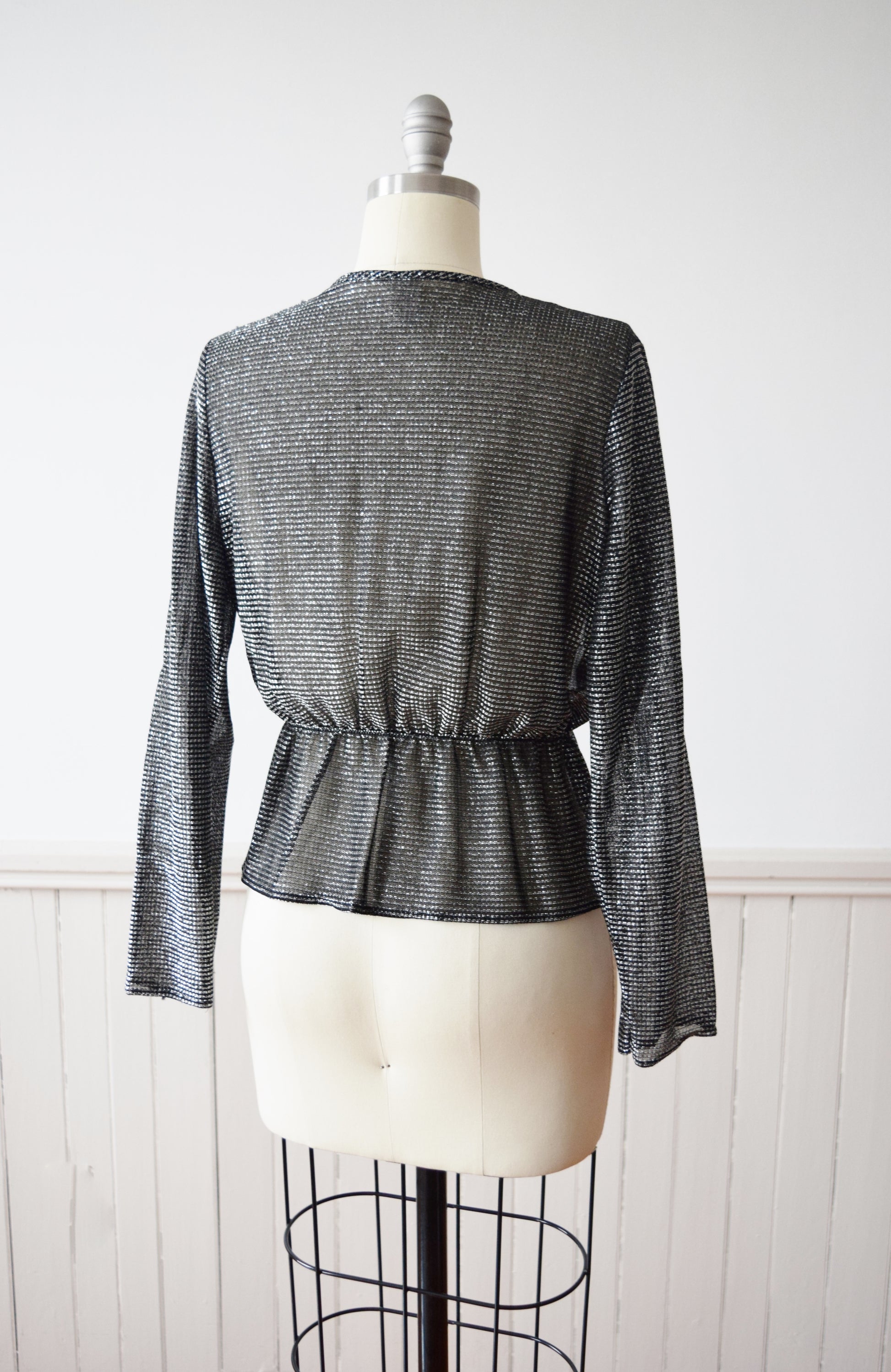 Sheer black silver metallic thread top. Peplum style with deep V open front. elastic waist.