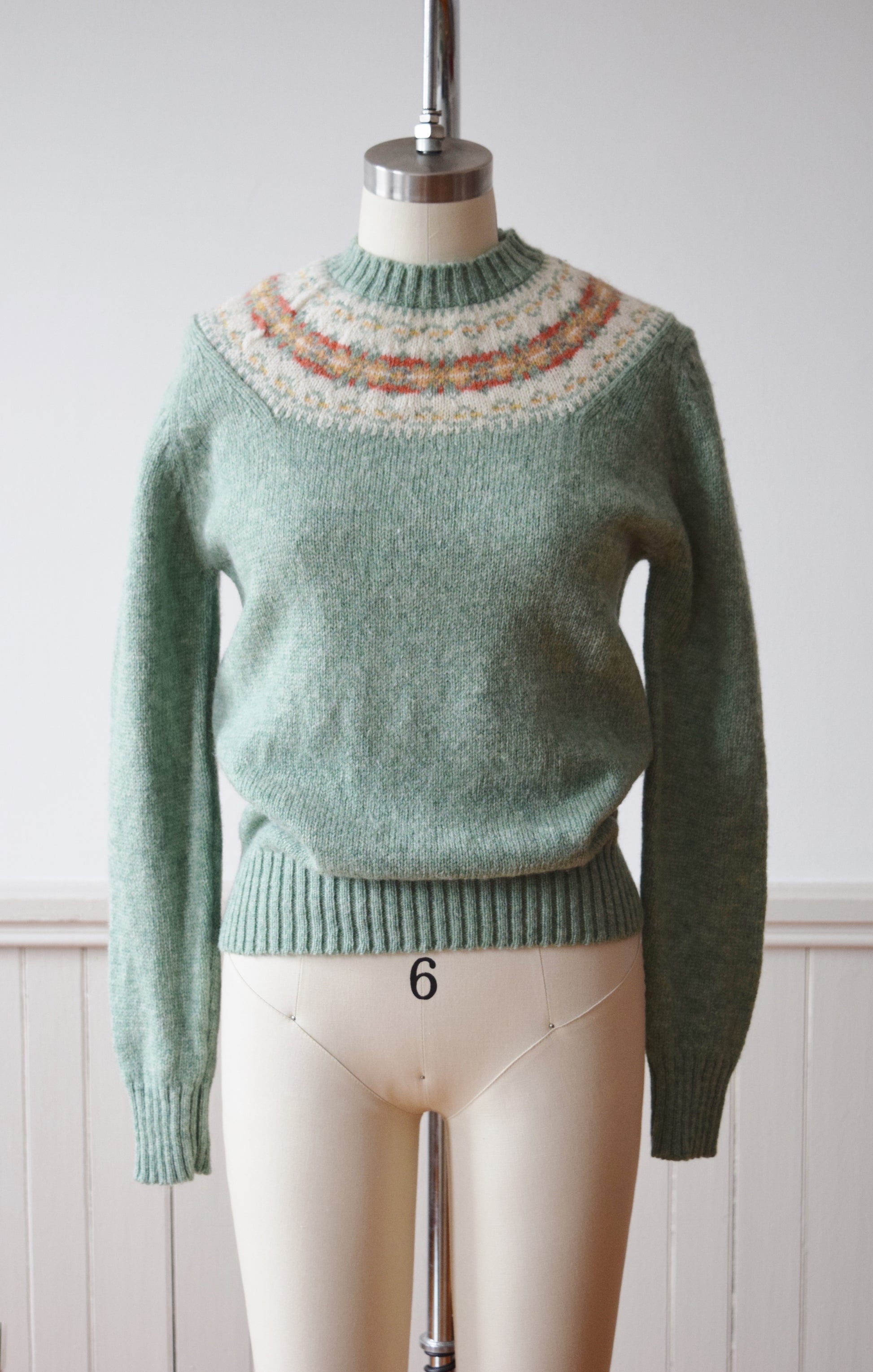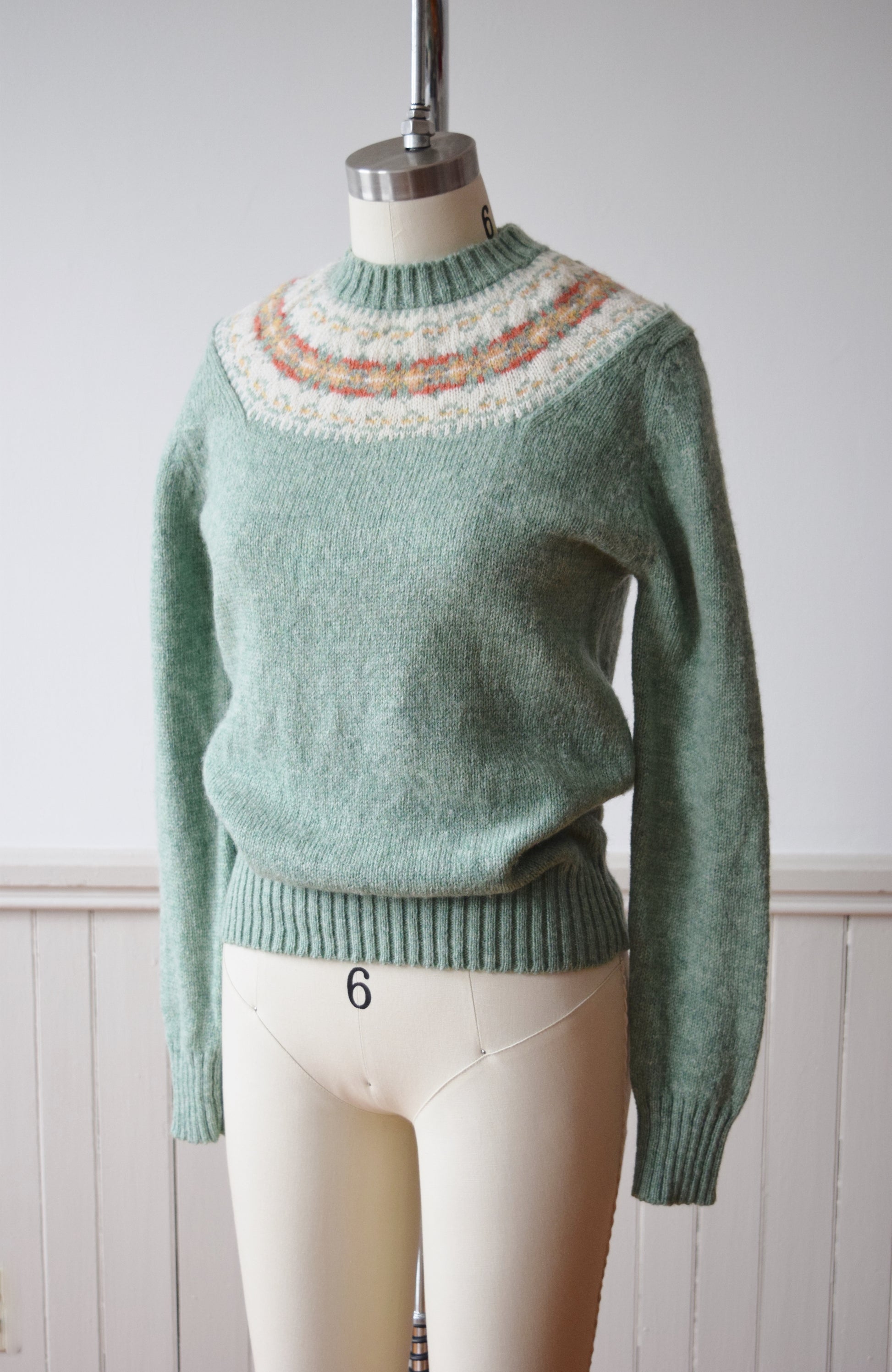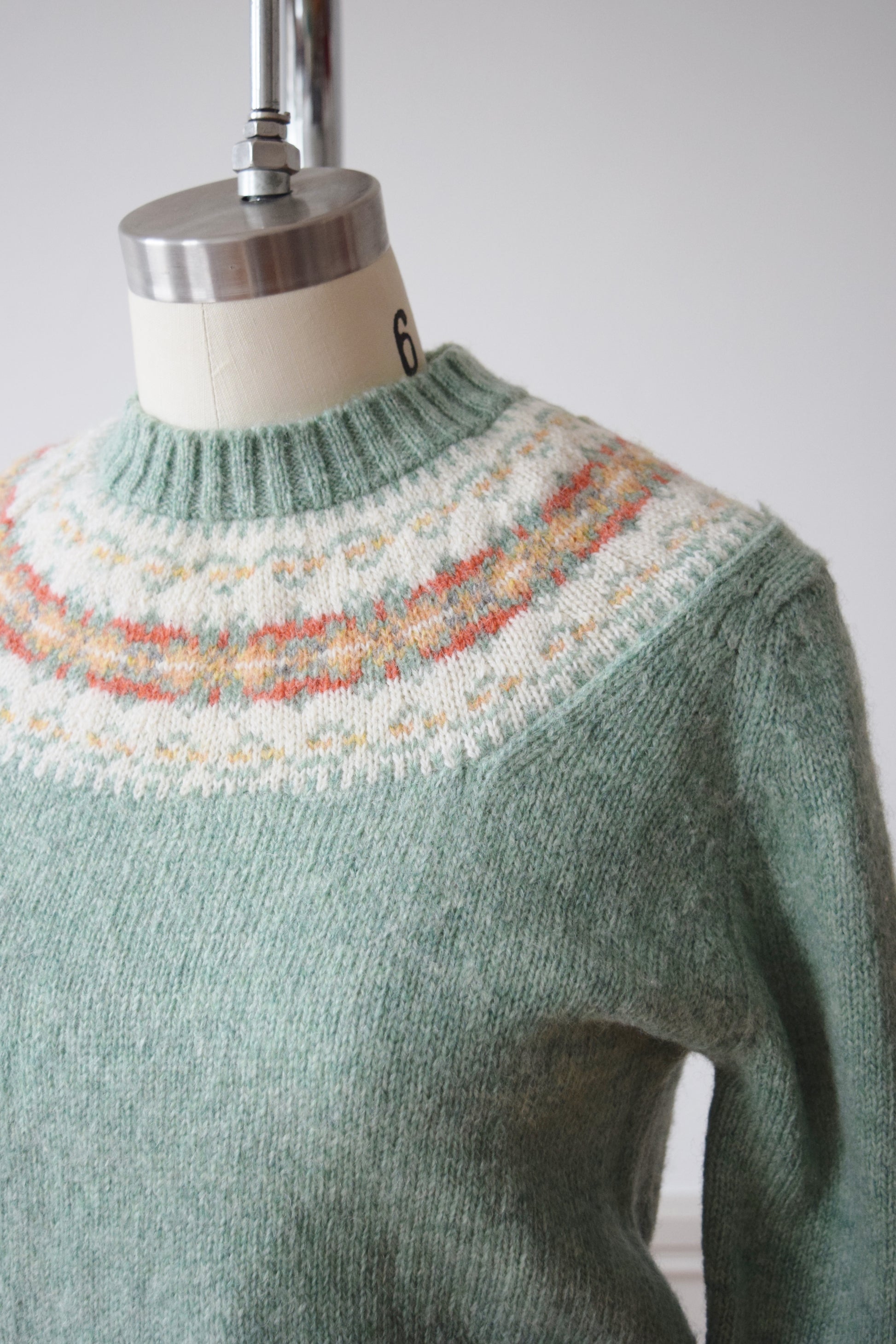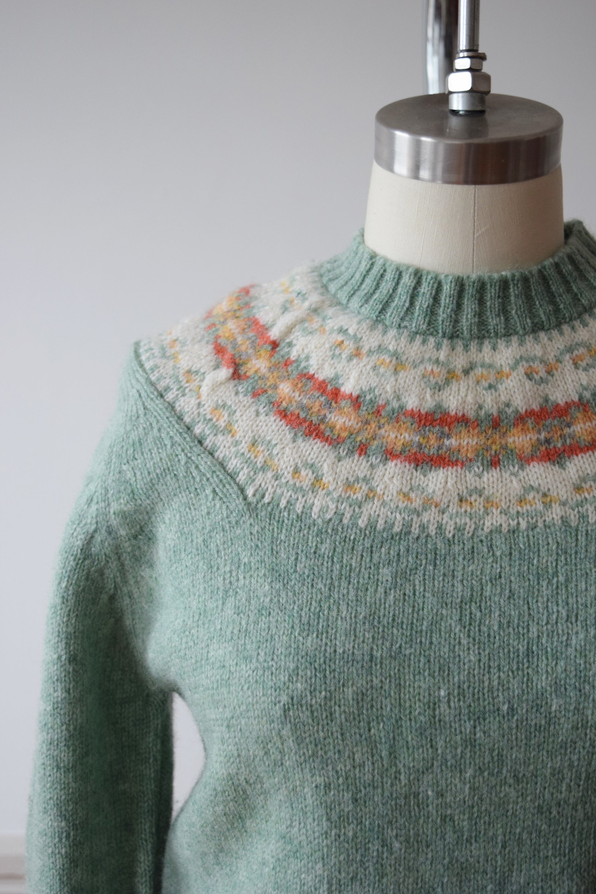classic fair isle style wool knit, fitted in sage green with gold, salmon and cream shoulder yoke.
